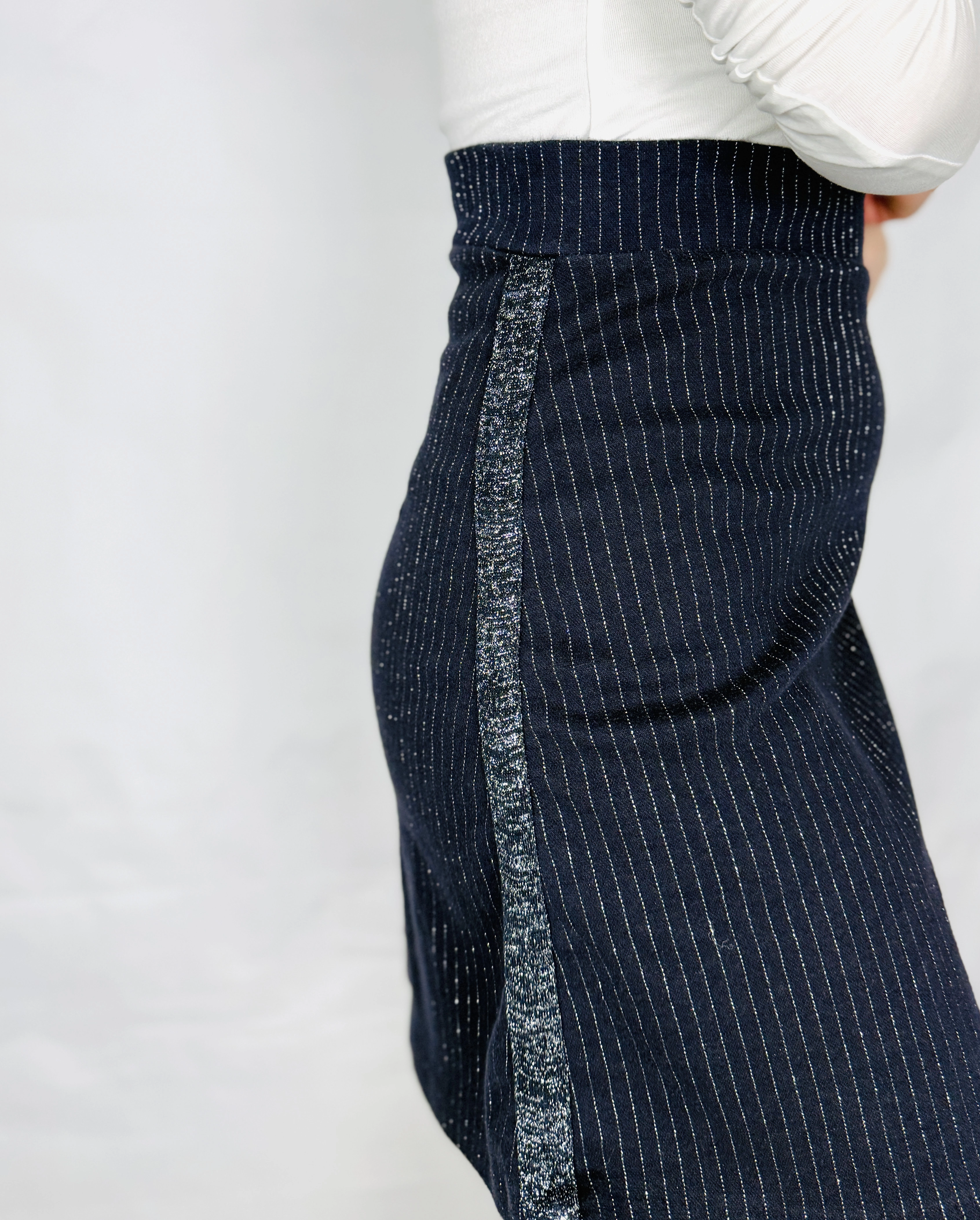 Materiał sprawia wrażenie miękkiego, a jednocześnie nieco bardziej zwartego, dzięki czemu dobrze trzyma formę. Subtelna struktura tkaniny podkreśla pionowy układ pasków, które optycznie wysmuklają sylwetkę. Połyskujący panel wprowadza ciekawą grę światła i nadaje całości wyrafinowanego wykończenia.