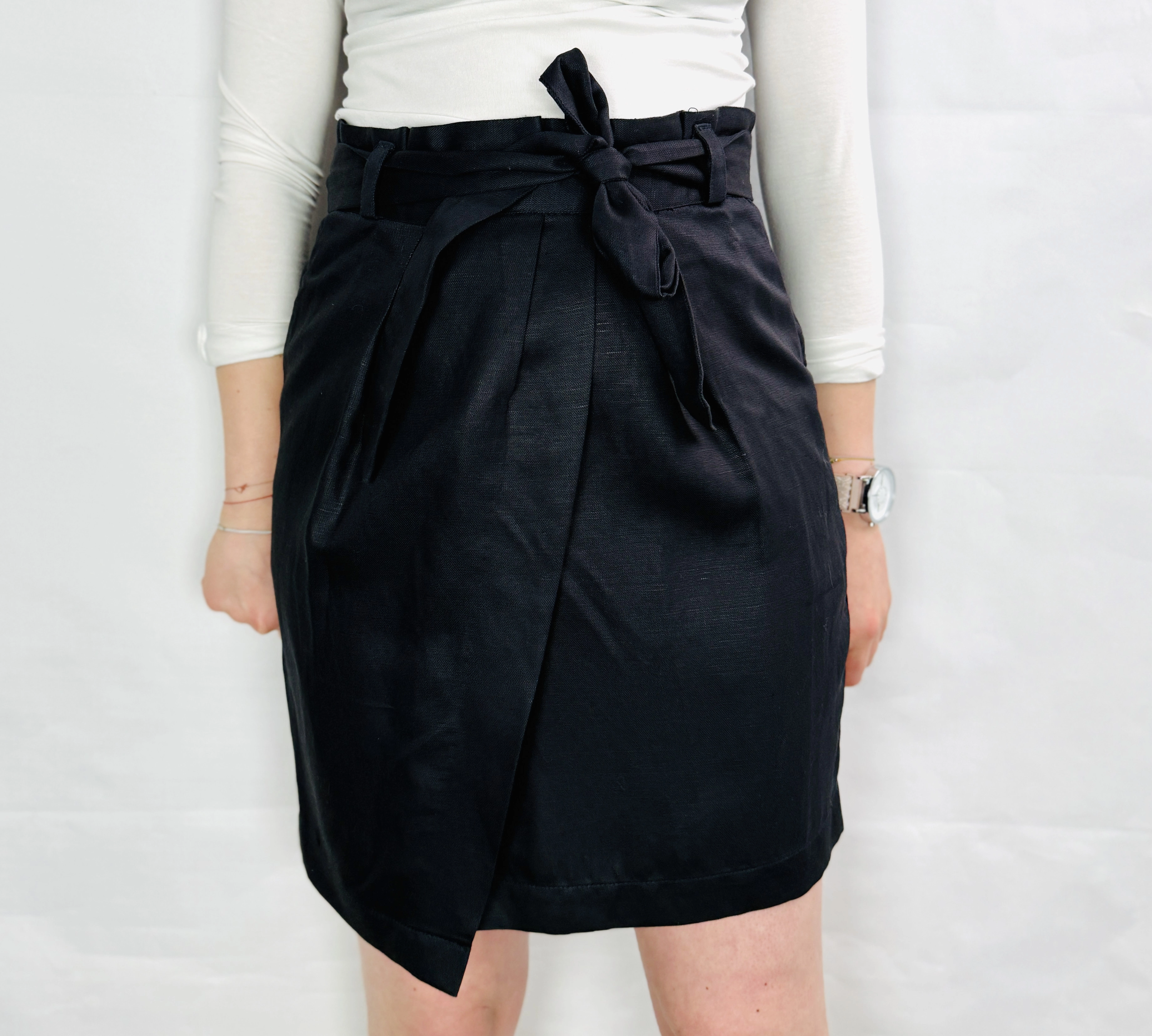 Długość spódnicy sięga powyżej kolan, co nadaje jej uniwersalny charakter – jest wystarczająco elegancka na formalne okazje, a jednocześnie lekka i swobodna, by nosić ją na co dzień. Wysoki stan i wiązanie optycznie wysmuklają sylwetkę, podkreślając talię i nadając proporcje zbliżone do klepsydry. To fason, który doskonale sprawdzi się u kobiet o różnych typach figury, szczególnie tych, które chcą zaakcentować kobiece kształty z klasą.