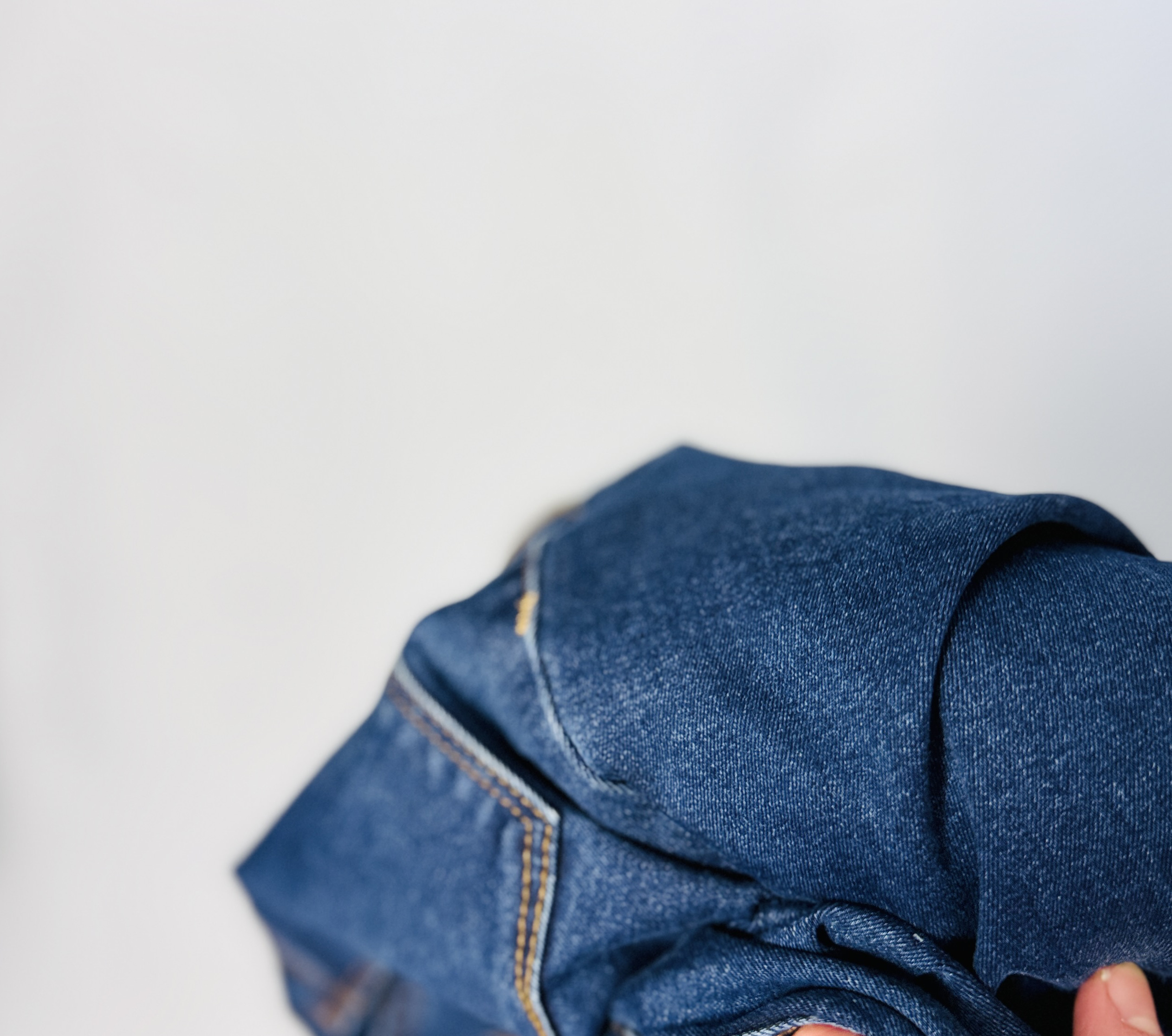 Materiał prezentuje się jako średnio grubszy denim o uporządkowanej, lekko szczotkowanej fakturze; wygląda na delikatnie otulający i posiada umiarkowaną sprężystość, dzięki której spodnie dopasowują się do sylwetki, nie krępując ruchów. Powierzchnia ma stonowane cieniowanie, które podkreśla rys materiału i nadaje całości naturalnej głębi bez efektu sztucznego postarzenia. Zmarszczenia przy kolanach i przy kostkach świadczą o plastyczności tkaniny — fason ładnie pracuje w ruchu, zachowując schludną linię.