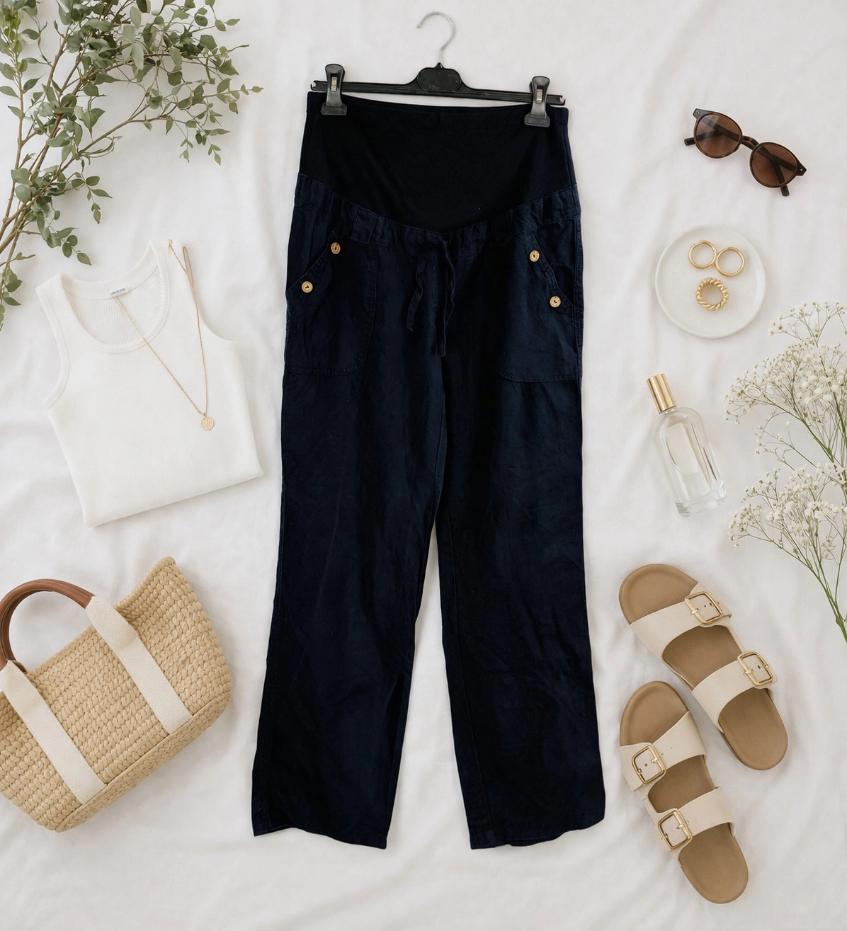Granatowe lniane spodnie ciążowe to niezwykle praktyczny i stylowy element garderoby, który pozwala na tworzenie komfortowych i modnych stylizacji na co dzień, do pracy czy na spotkania. Doskonale komponują się z jasnymi odcieniami, takimi jak biel, krem czy beż, ale także z bardziej wyrazistymi barwami, na przykład bordo czy oliwkową zielenią. Dzięki swojej funkcjonalności i naturalnemu charakterowi, stanowią niezastąpiony wybór dla przyszłych mam, które chcą czuć się pięknie i wygodnie każdego dnia.