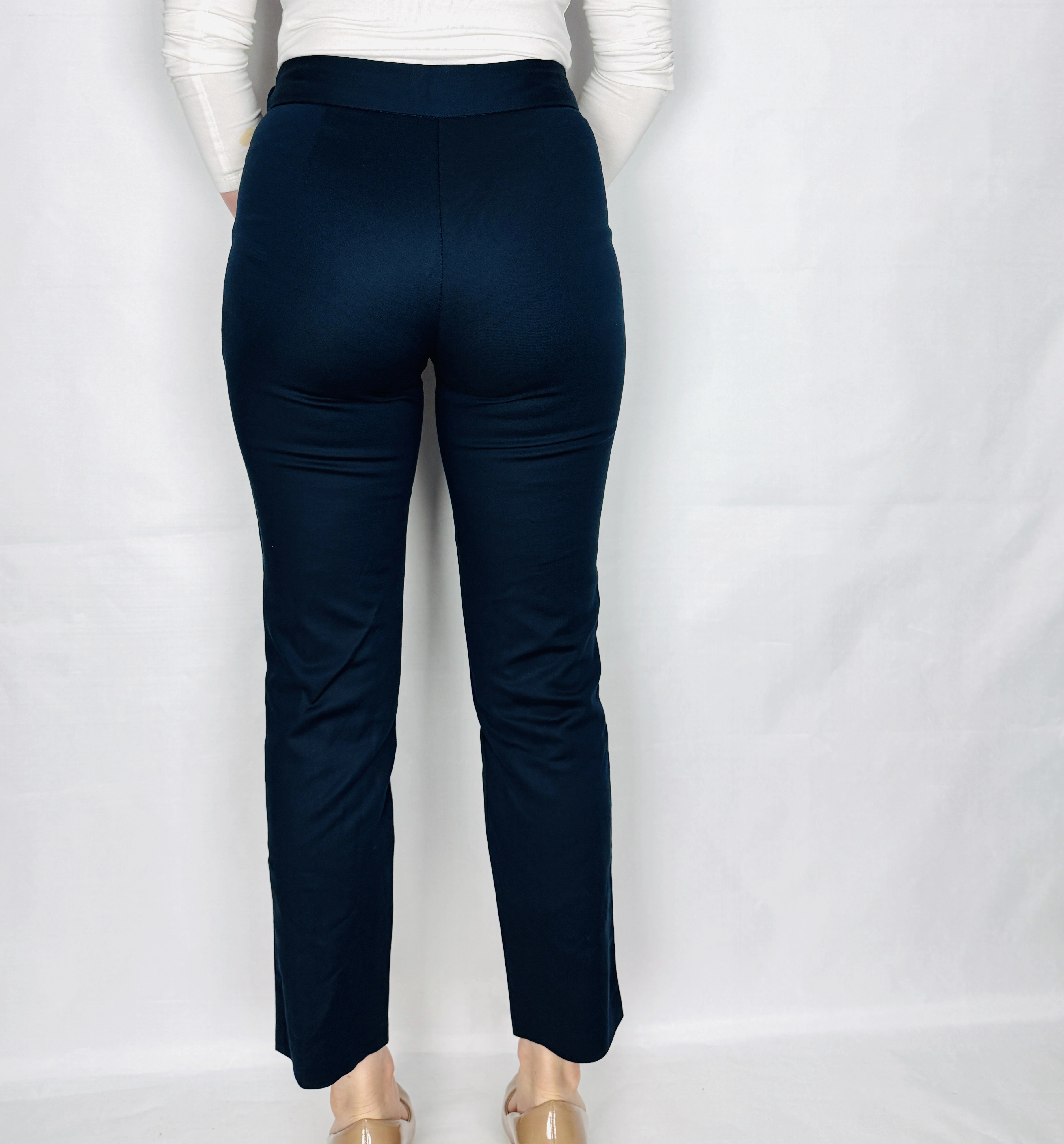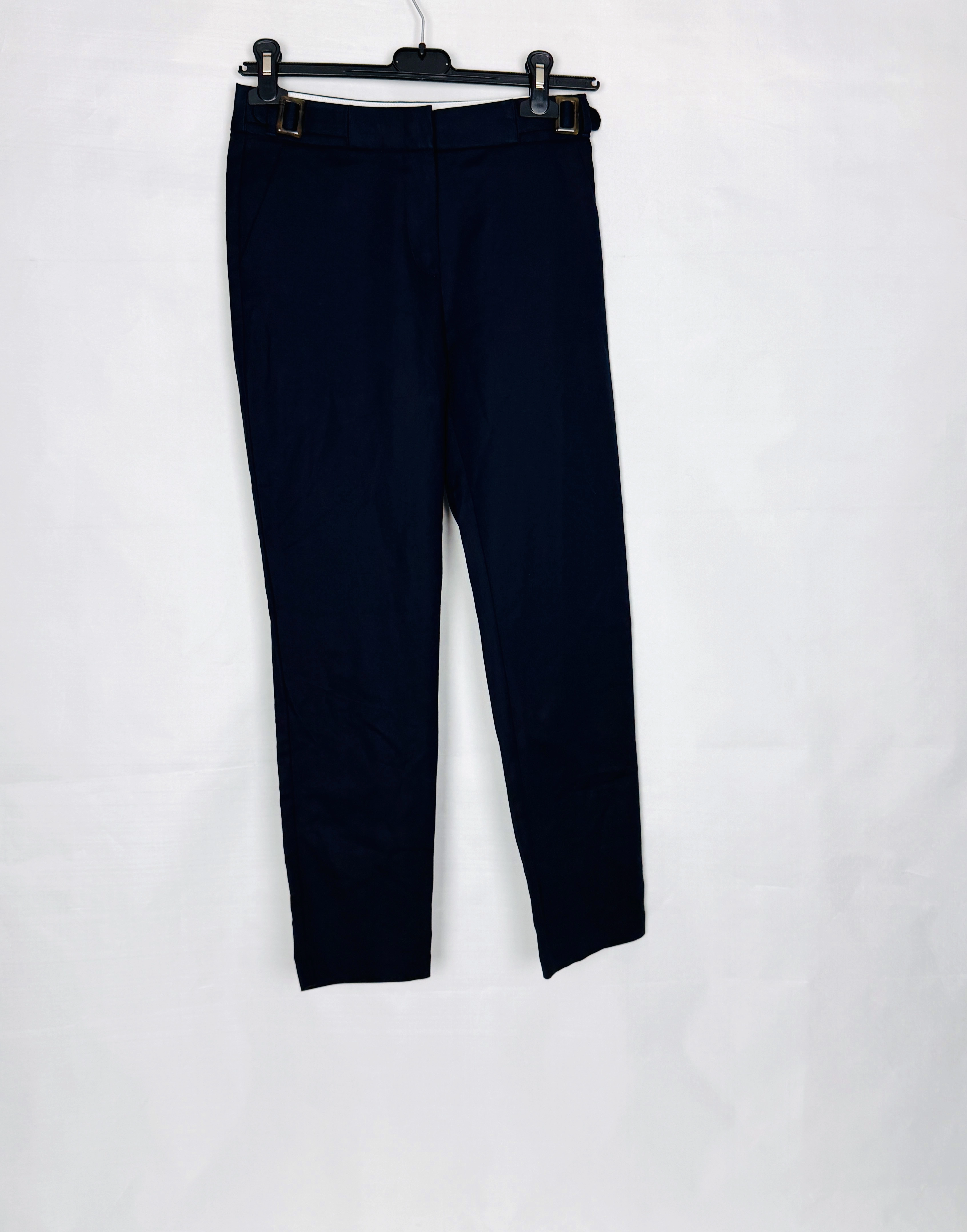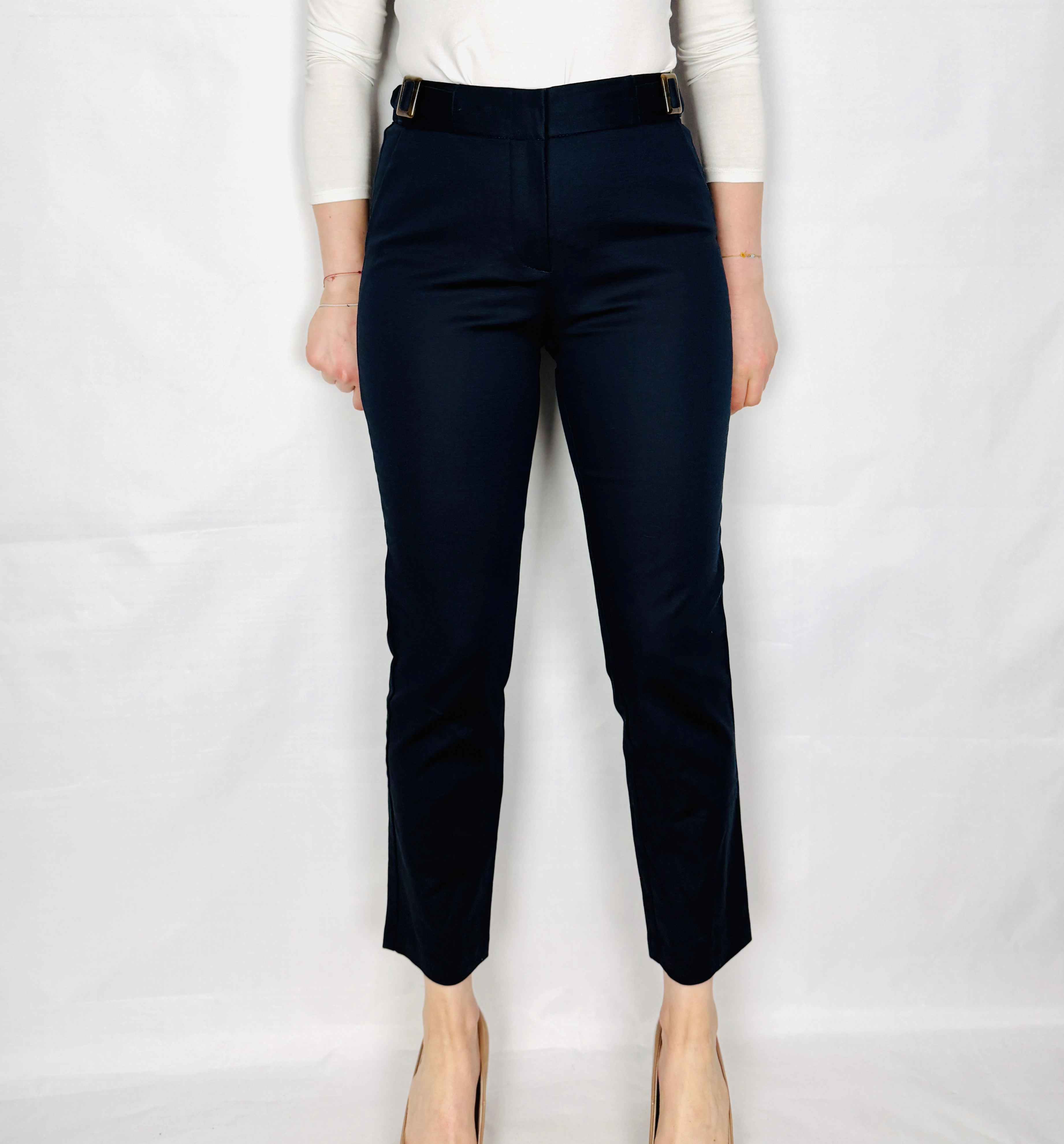 Te granatowe spodnie to połączenie klasycznej elegancji z nowoczesnym, subtelnym detalem, który przyciąga uwagę. Głęboki odcień granatu nadaje całości wyrafinowanego charakteru, jednocześnie pozostając niezwykle uniwersalnym i łatwym do stylizowania. To model, który sprawdzi się zarówno w codziennych, jak i bardziej formalnych zestawach, dodając im szyku i lekkości.