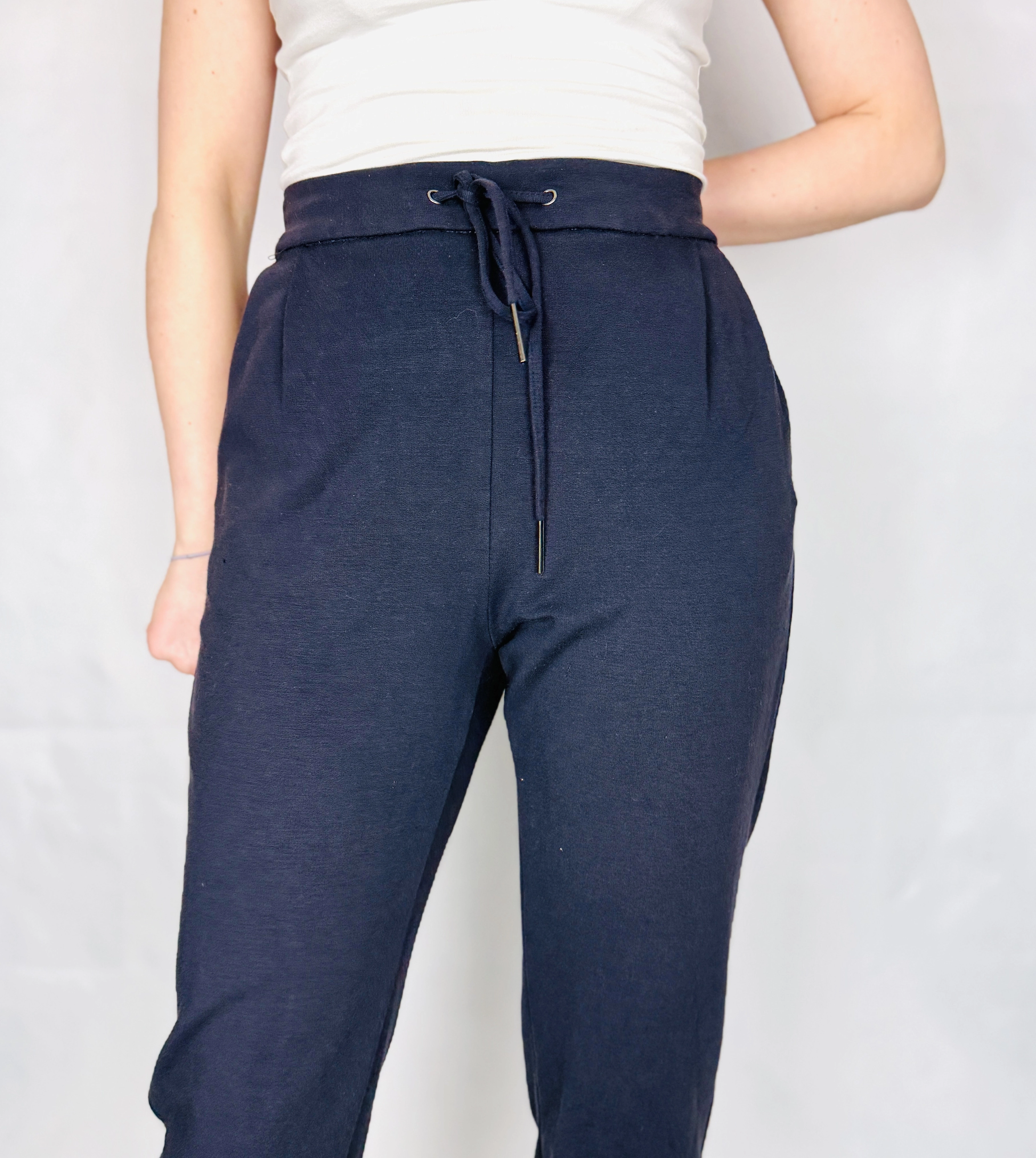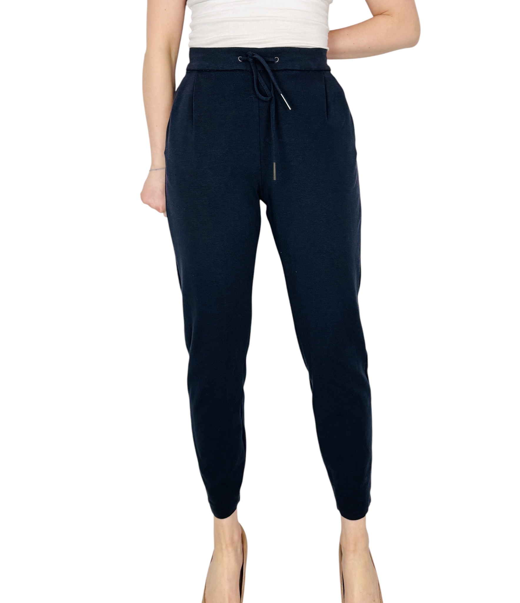 Fason ma wyraźnie podwyższony stan z szerokim, gładkim ściągaczem i dekoracyjnym wiązaniem z metalowymi zakończeniami, które nadaje lekko sportowy akcent, a jednocześnie stylową detalizację. Przód modelu zdobią delikatne zaszewki podkreślające linię bioder, po bokach znajdują się dyskretne kieszenie wpuszczane, które wzmacniają użytkowy charakter. Nogawki są zwężane ku dołowi i zakończone wąskim ściągaczem przy kostce, co tworzy efekt nowoczesnego joggeru — sylwetka wygląda dzięki temu proporcjonalnie i wysmuklająco.