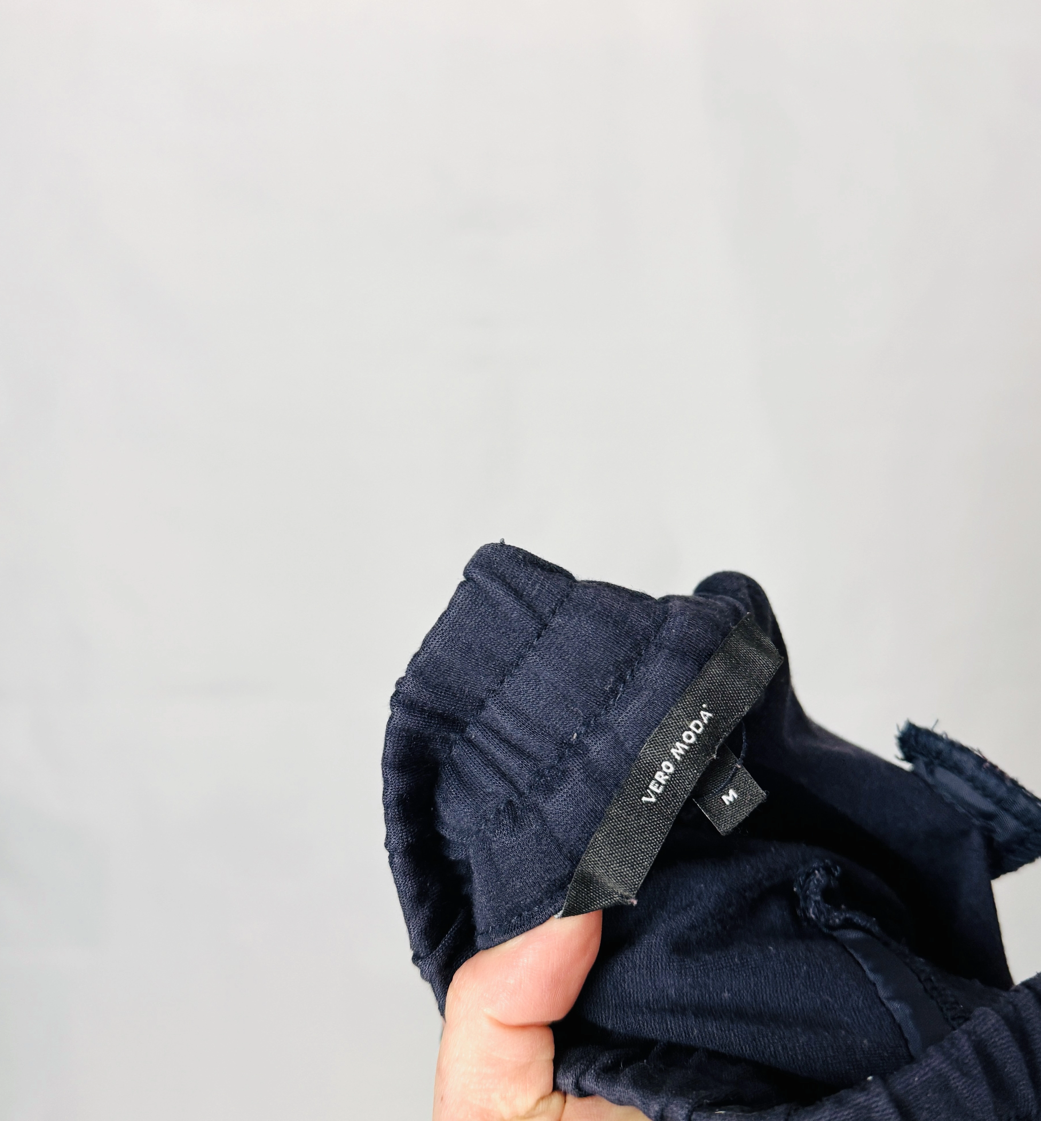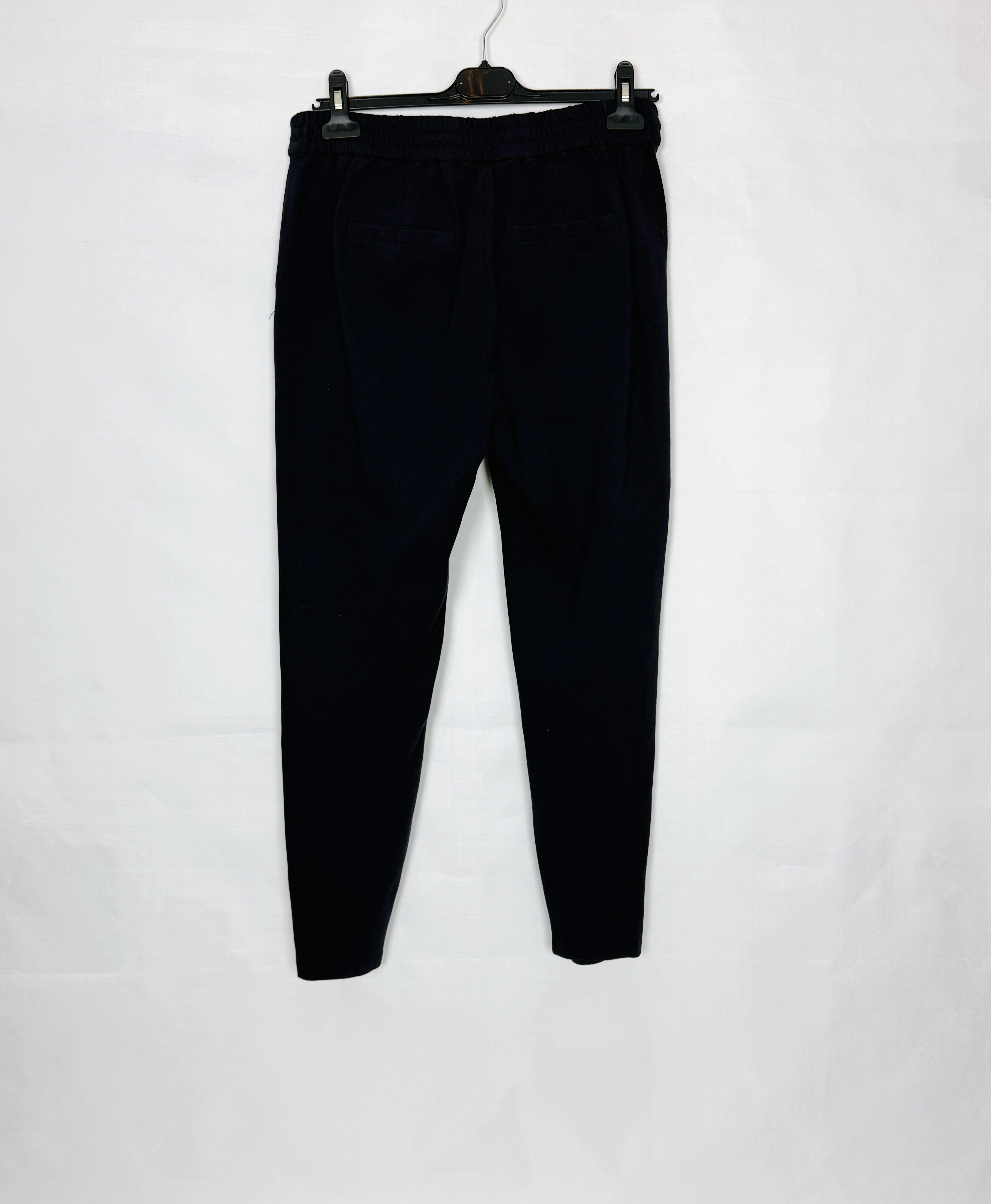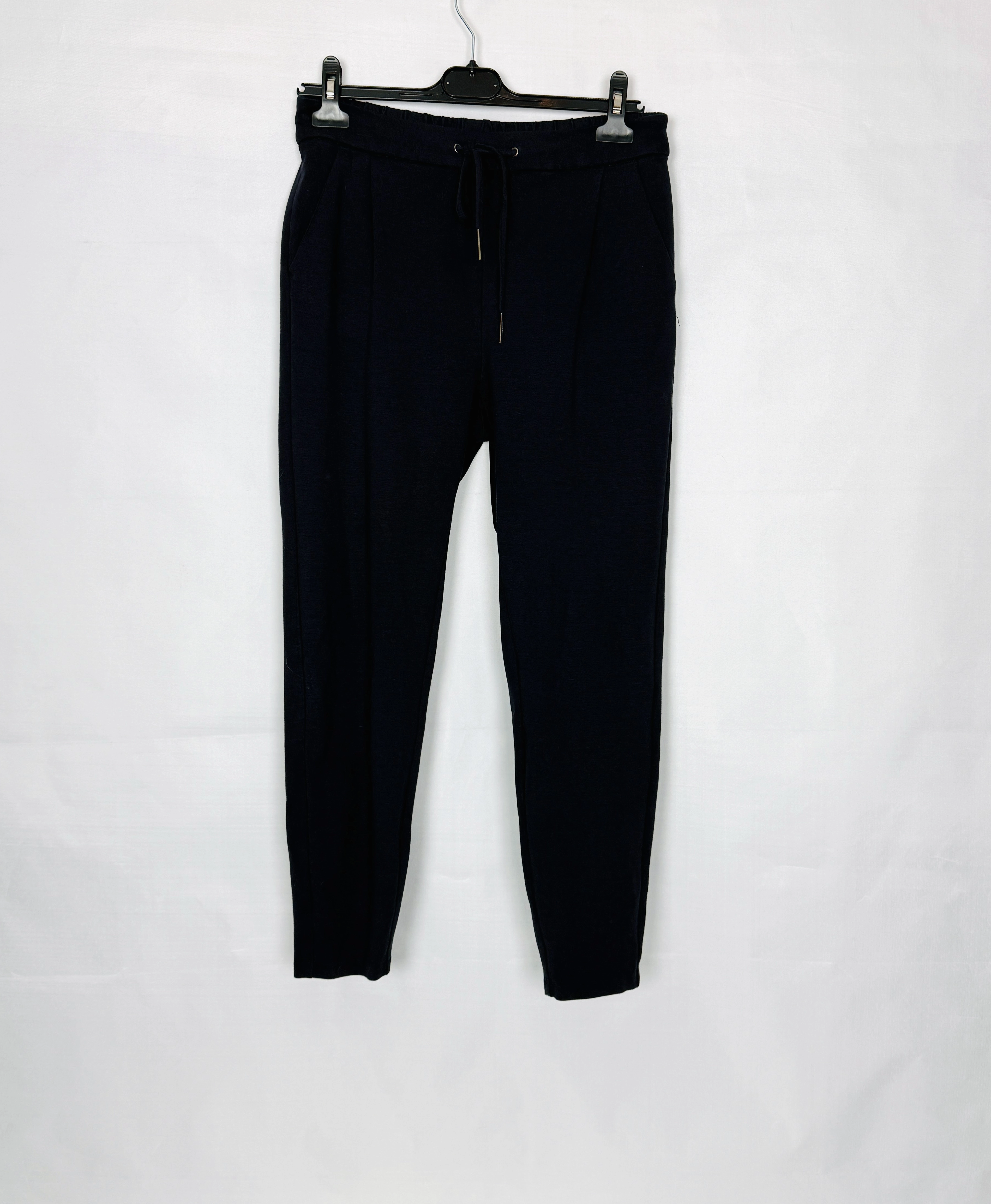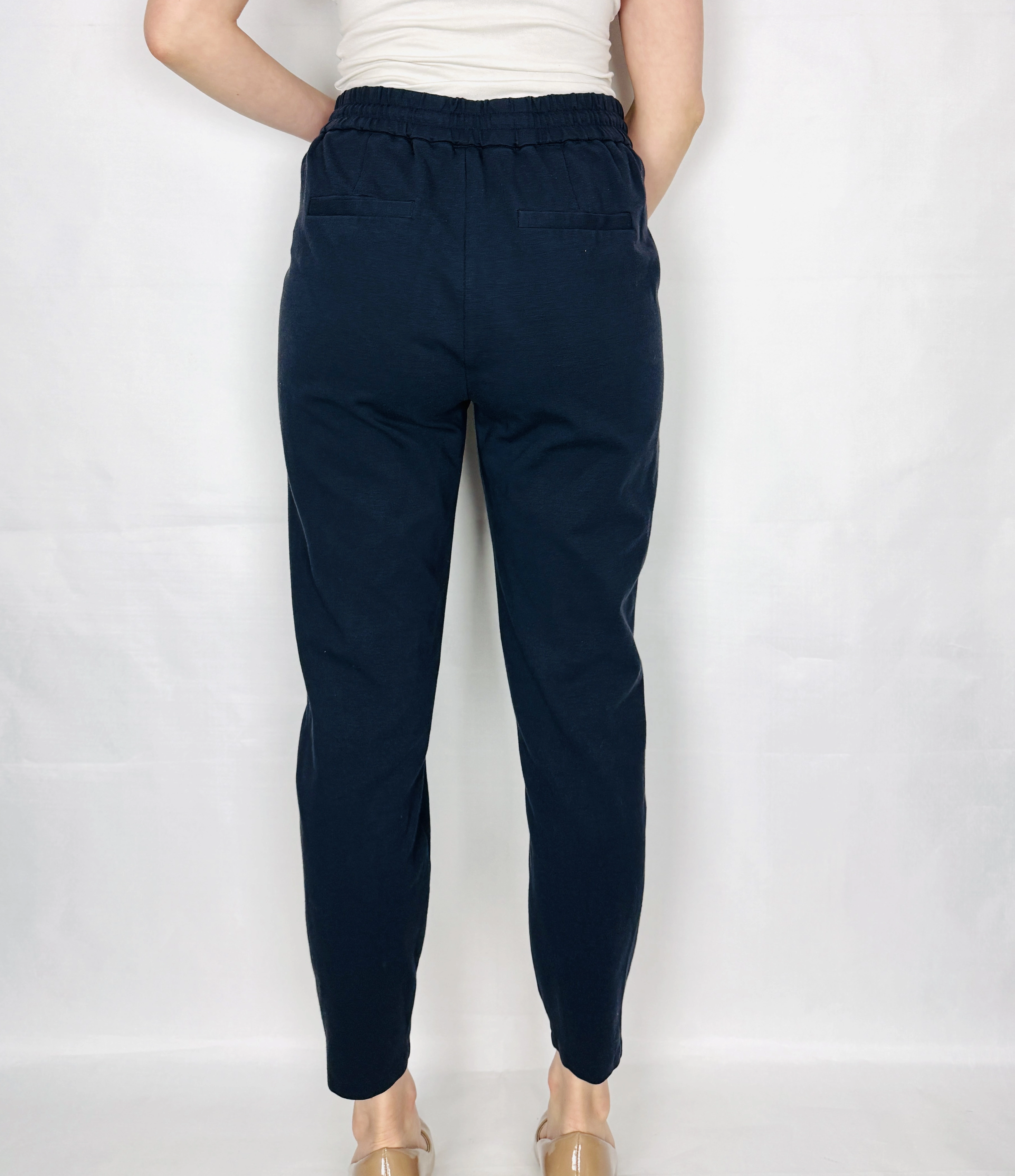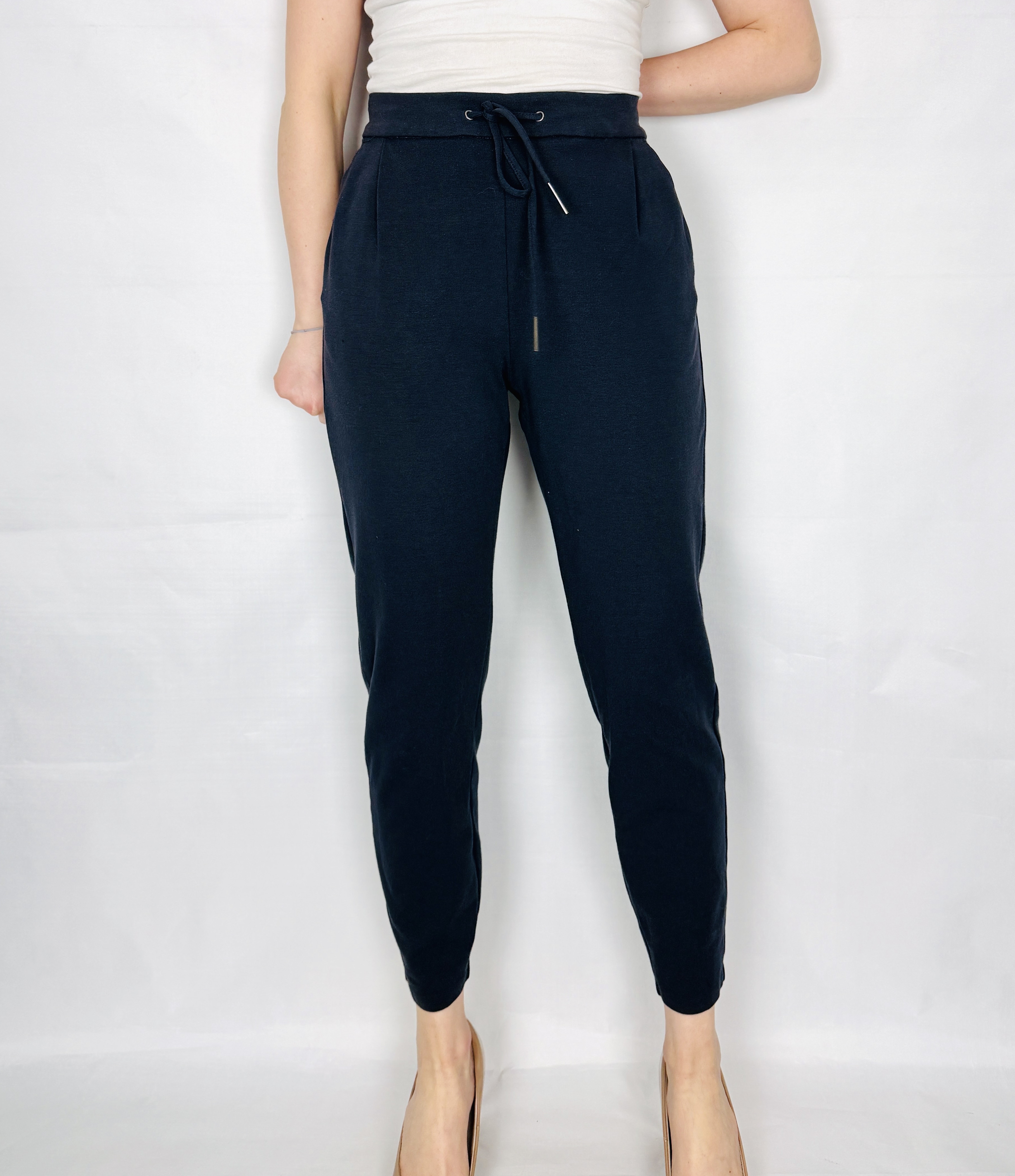 Te granatowe spodnie to kwintesencja wygodnej elegancji — prostota formy spotyka tu delikatny szyk, dzięki czemu model nabiera uniwersalnego, kobiecego charakteru. Głęboki kolor dodaje im klasy i pozwala zbudować zarówno stonowane, jak i bardziej wyrafinowane zestawy; całość emanuje spokojem i subtelną pewnością siebie, idealną dla osób, które cenią komfort bez rezygnacji z estetyki.