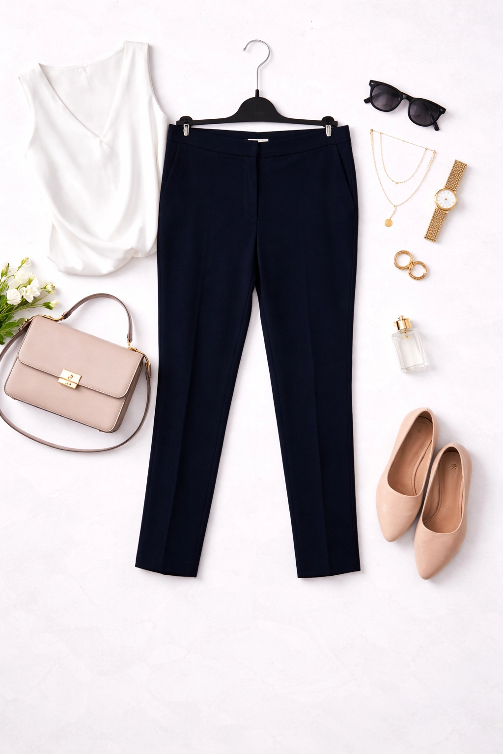 W stylizacjach te spodnie sprawdzą się znakomicie: do pracy zestaw je z gładką koszulą i klasycznym żakietem dla profesjonalnego wyglądu, na spotkanie wybierz delikatny top i loafersy, a na wieczór postaw na jedwabisty fason bluzki i obcas, by podkreślić kobiecy szyk. Granat pięknie łączy się z kremowym, beżowym i białym oraz z mocniejszymi akcentami takimi jak bordo czy butelkowa zieleń, co pozwala na kreowanie zarówno stonowanych, jak i bardziej wyrazistych kompozycji. To para dla osób ceniących ponadczasową elegancję i uniwersalność w kobiecym wydaniu.