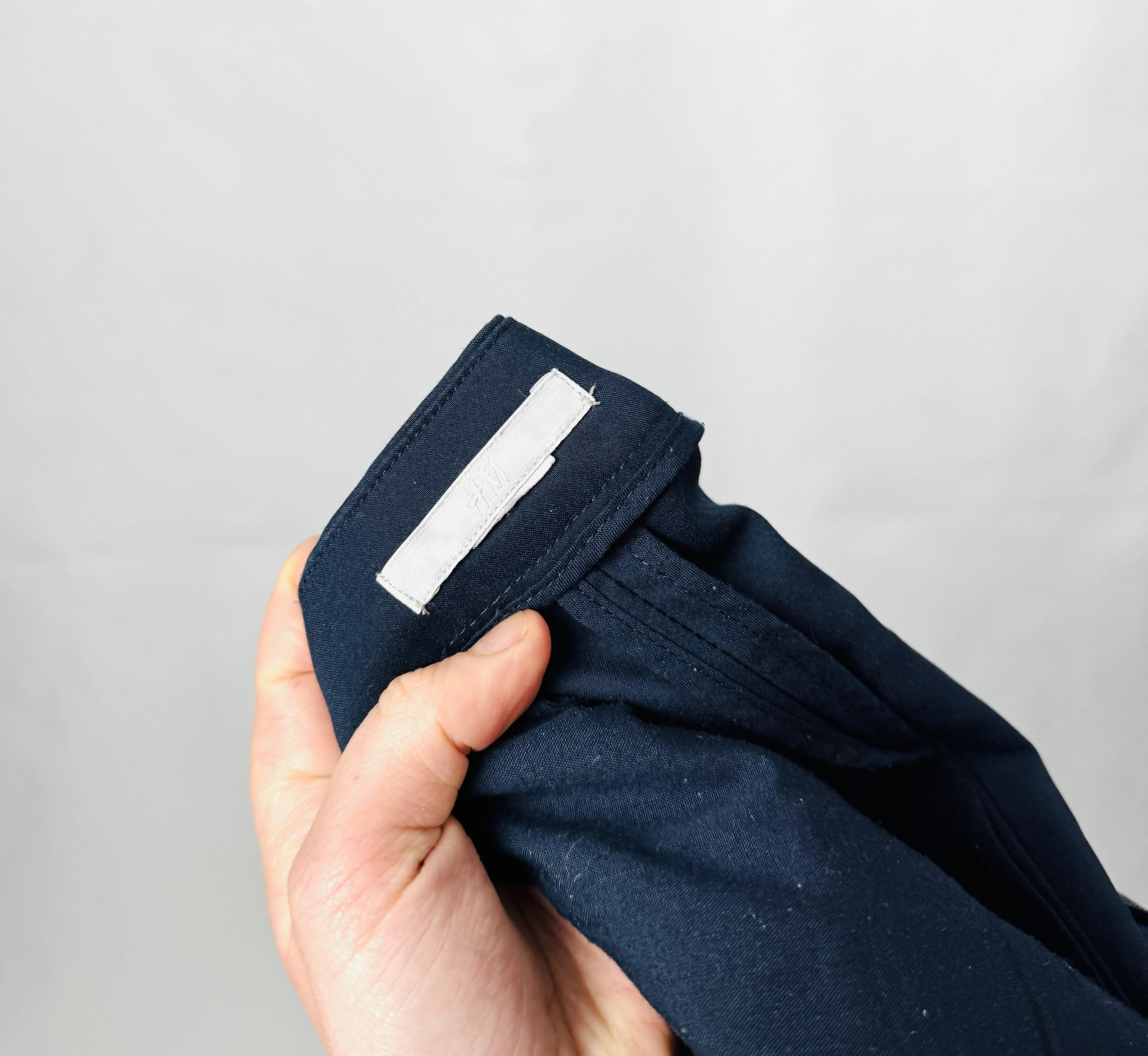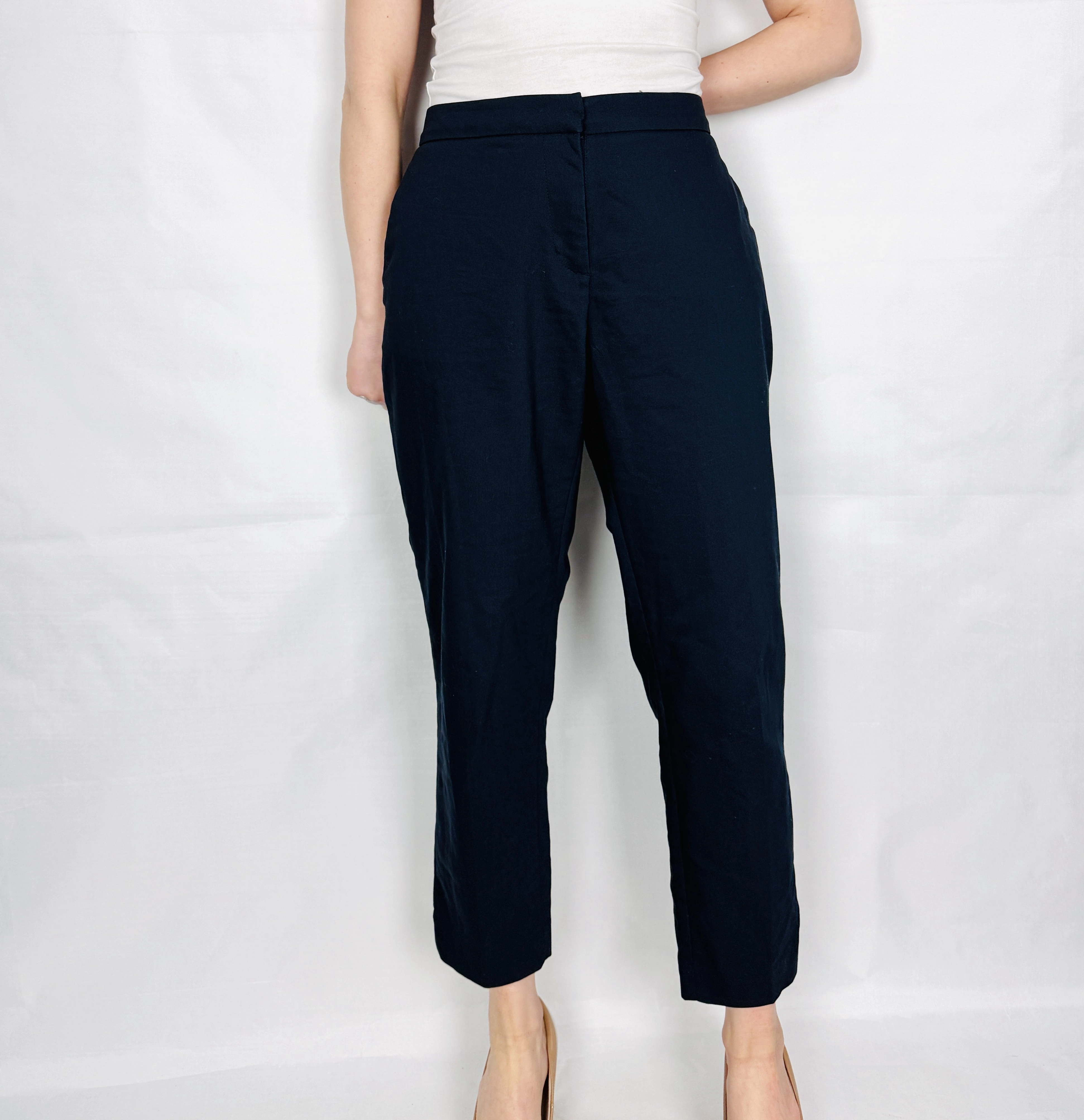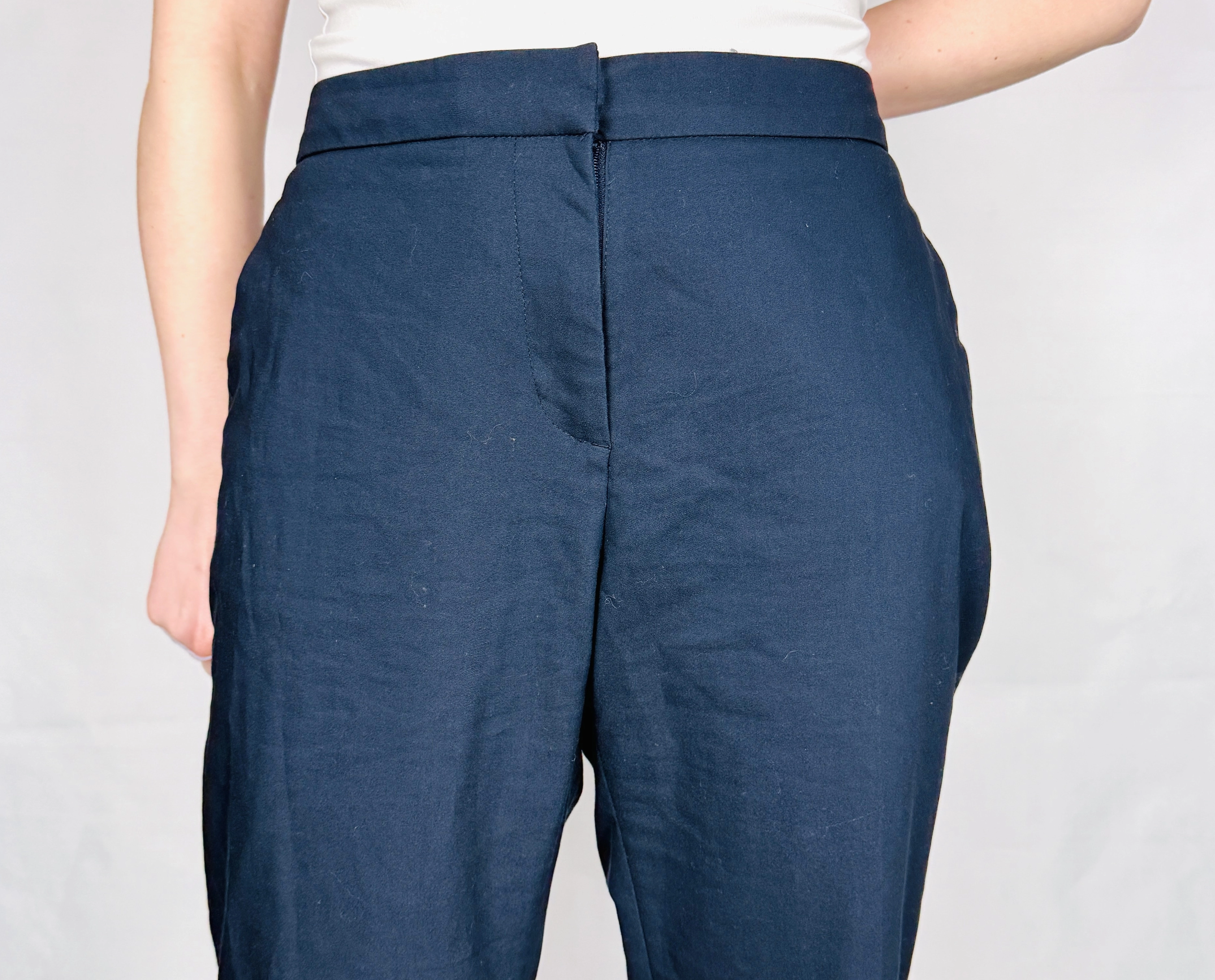 To model o spokojnym, eleganckim charakterze — głęboki granat nadaje im klasycznej wyrafinowanej nuty, a czysta, uporządkowana forma sprawia, że wyglądają zarówno kobieco, jak i nowocześnie. Spodnie emanują stonowaną pewnością siebie; są jednocześnie subtelne i wyraziste, gotowe stać się bazą wielu stylizacji — od stonowanego biurowego szyku po bardziej swobodne, miejskie zestawy. Ich prostota ma w sobie kobiecą łagodność, która łatwo łączy się z różnymi fakturami i kolorami.
