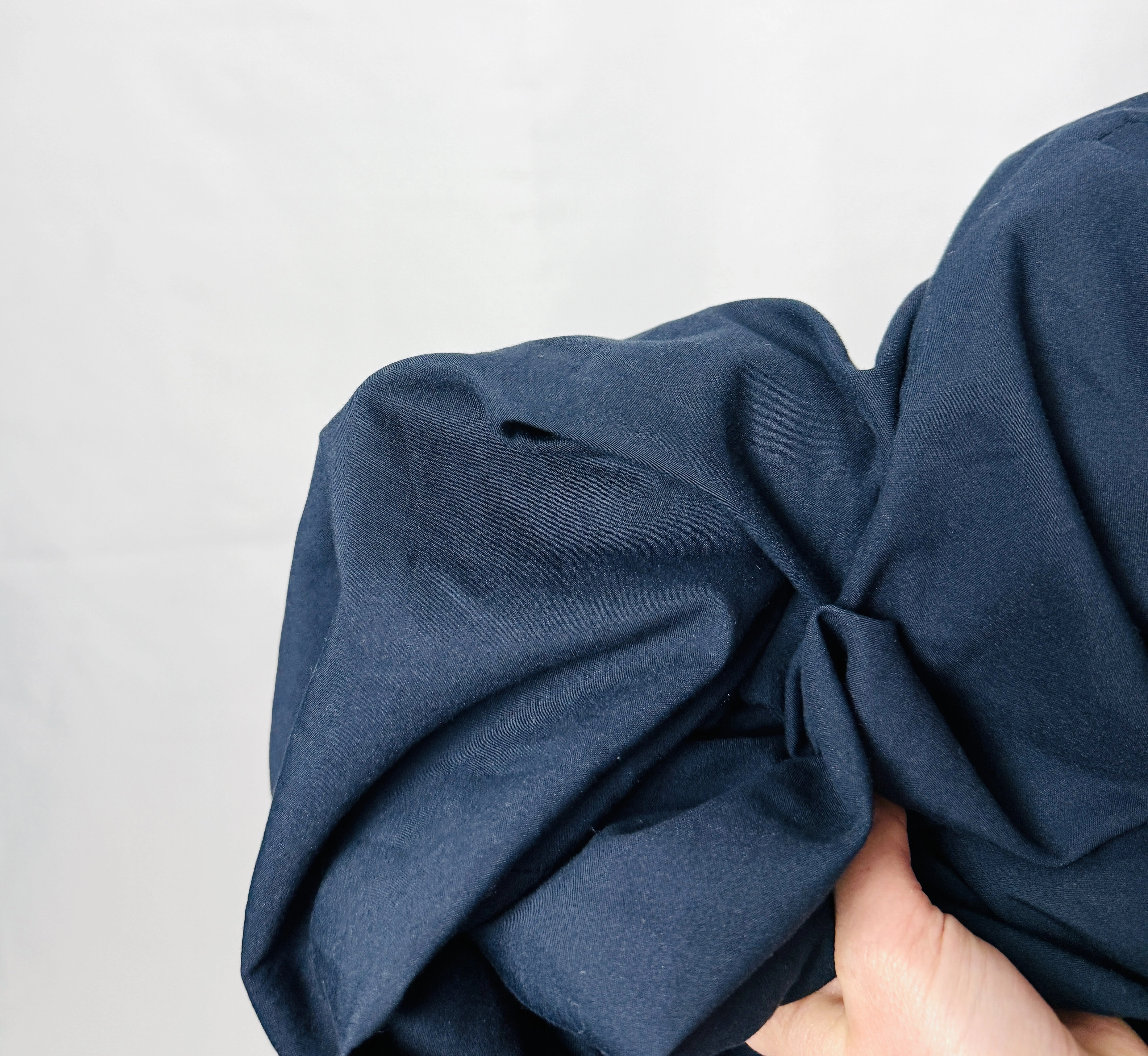 Materiał wygląda na gładszy i miękko układający się, o lekkim, subtelnym drapowaniu; tkanina sprawia wrażenie delikatnie lejącej, lecz wystarczająco strukturalnej, by trzymać formę i elegancko otulać sylwetkę. To połączenie lekkości i porządku daje efekt komfortu bez utraty szyku — spodnie poruszają się z ciałem, a jednocześnie zachowują estetyczną linię. Głęboka tonacja granatu dodaje całości powagi i subtelnego blasku, który świetnie współgra z naturalnym ruchem materiału.