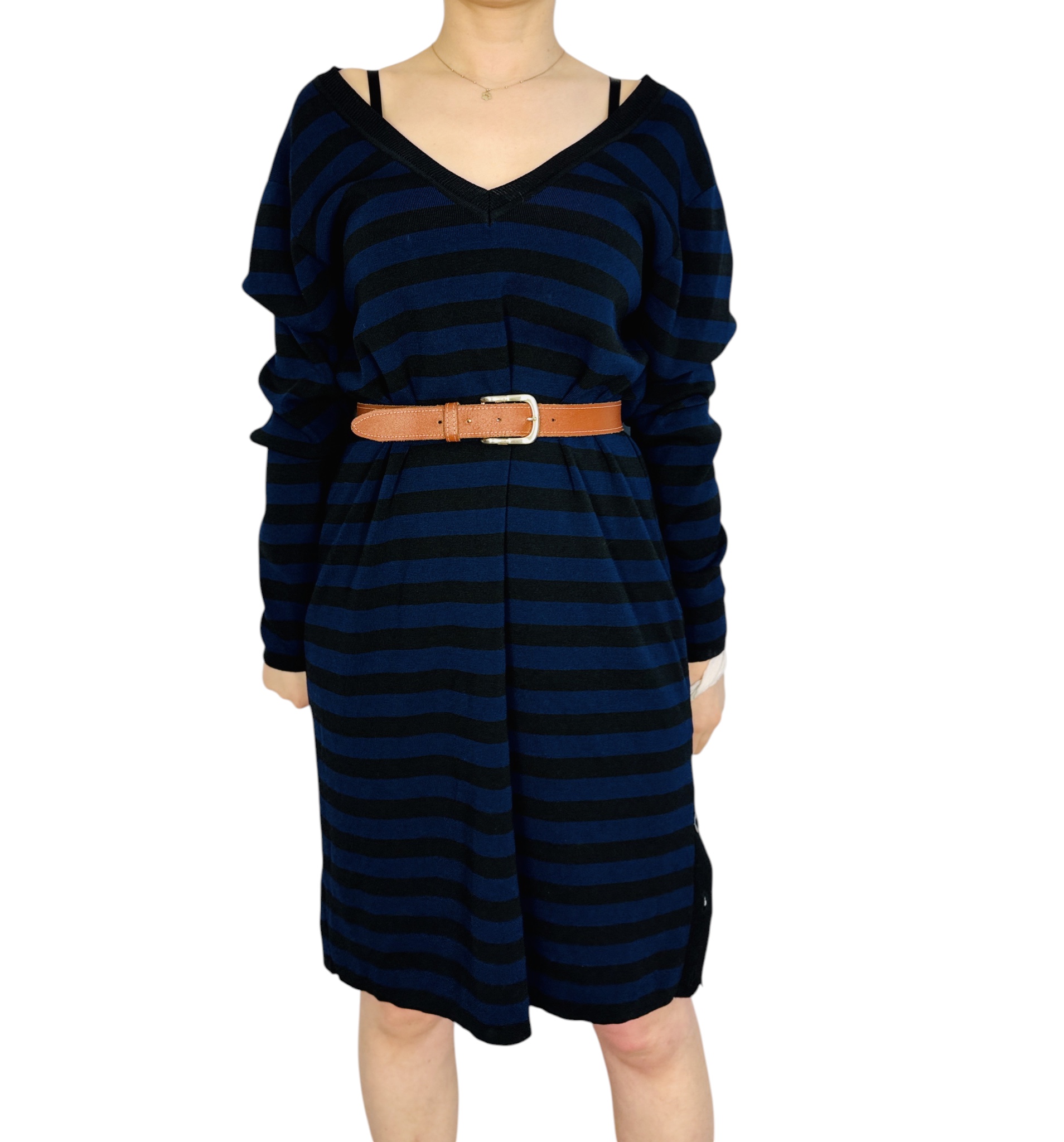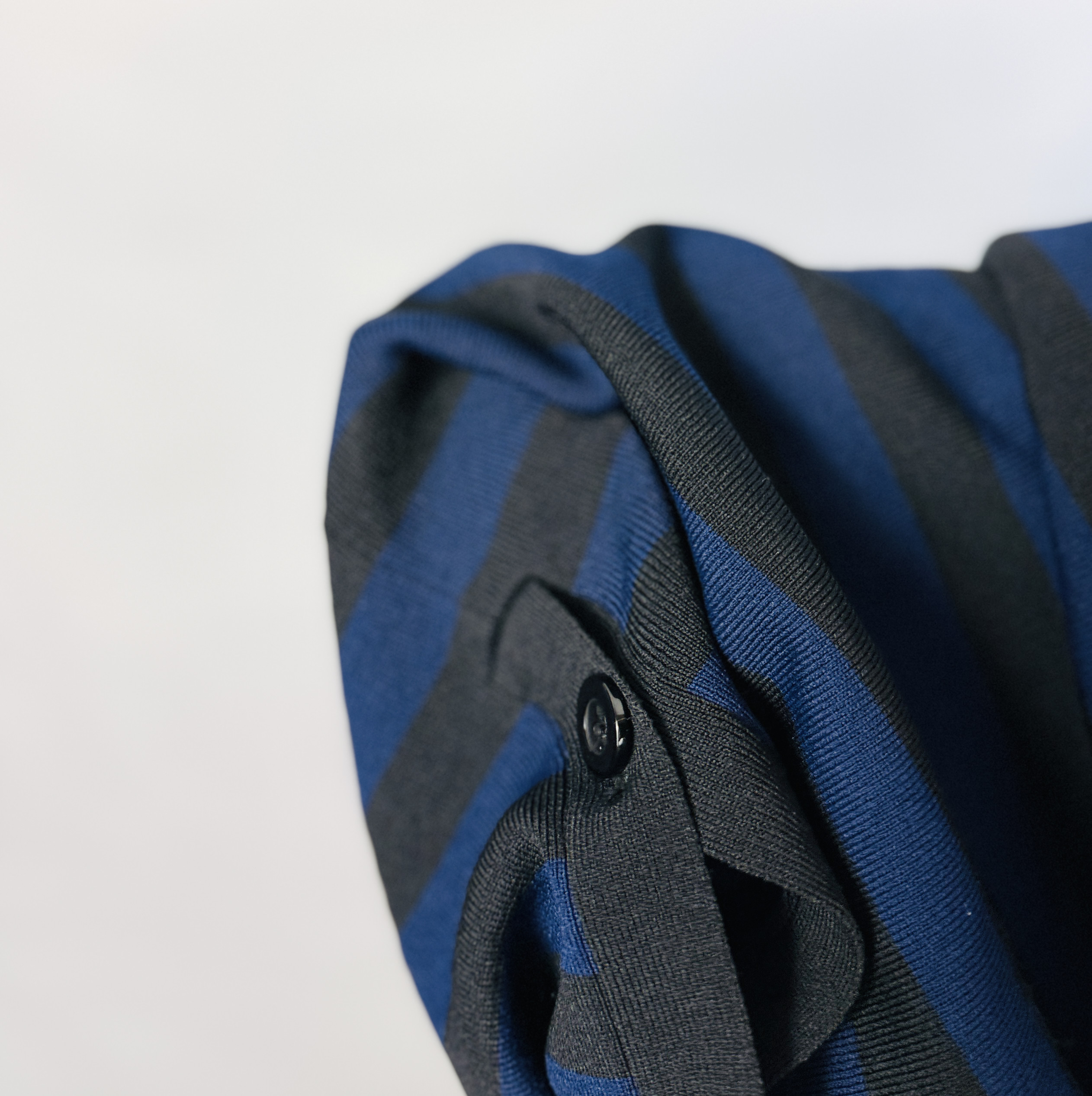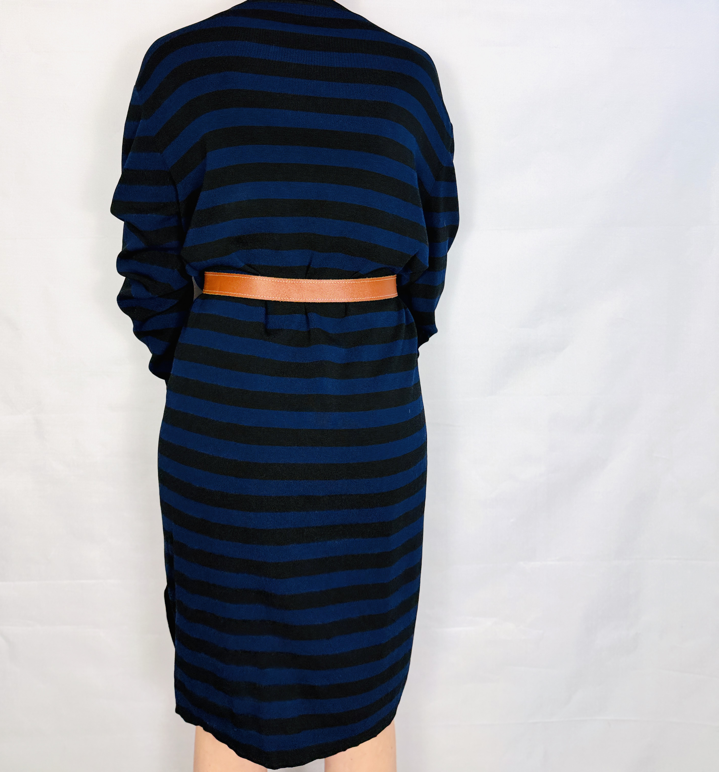 To sukienka o wyraźnym, ale stonowanym charakterze — szerokie, poziome paski w odcieniach granatowym i czarnym nadają jej graficznej siły, a zarazem spokojnej elegancji. Fason łączy prostotę z kobiecą nutą dzięki dekoltowi w serek i uporządkowanej sylwetce; to propozycja, która sprawdzi się zarówno w codziennych, jak i bardziej oficjalnych zestawieniach, oferując klasyczny wygląd z subtelnym, współczesnym akcentem.