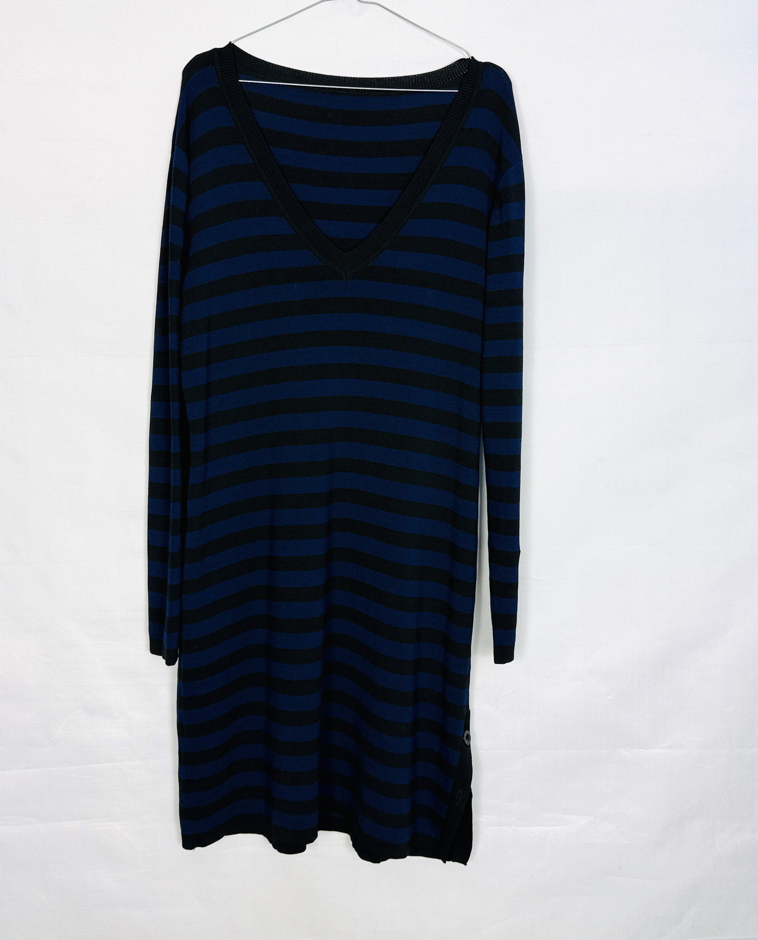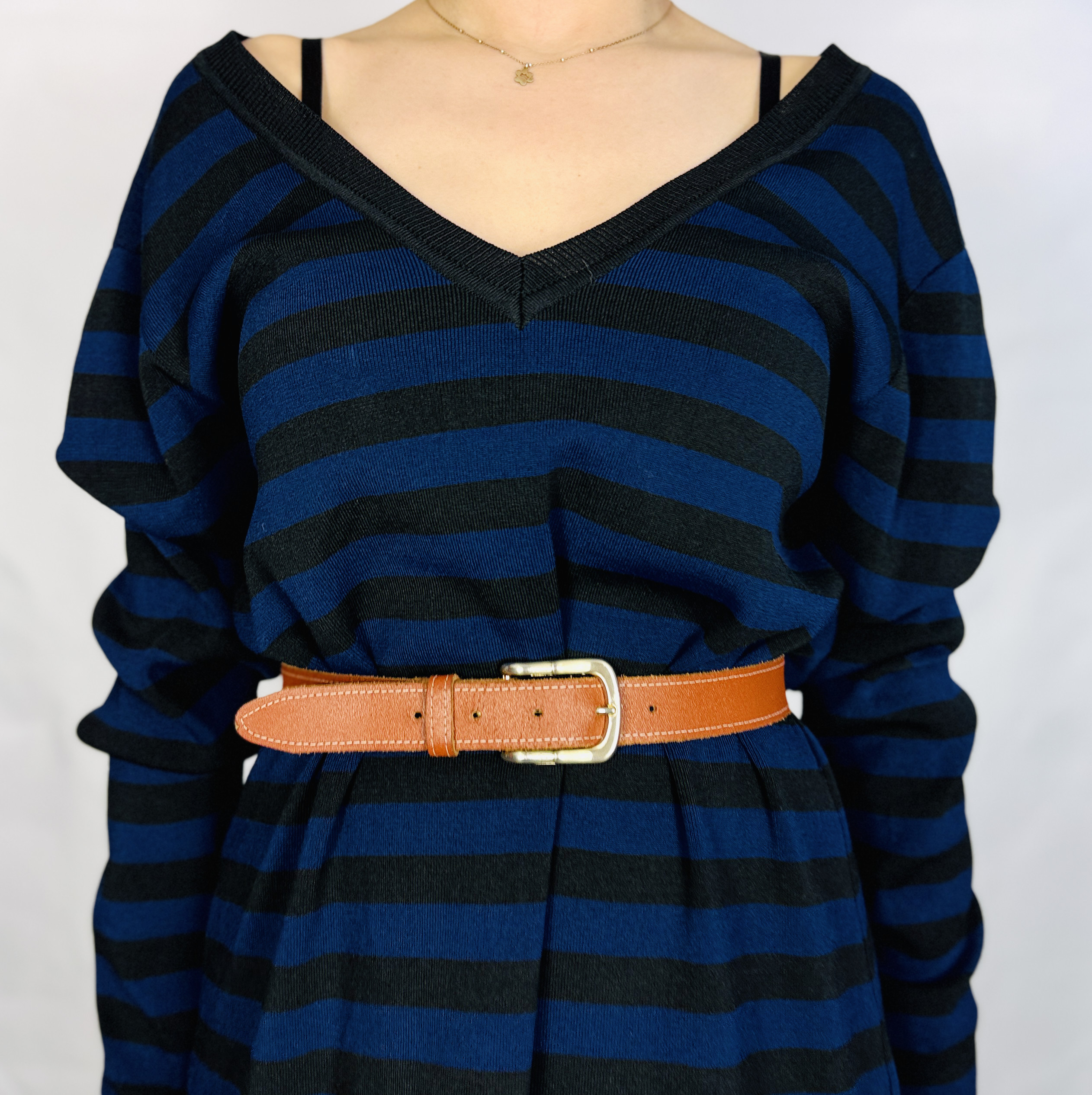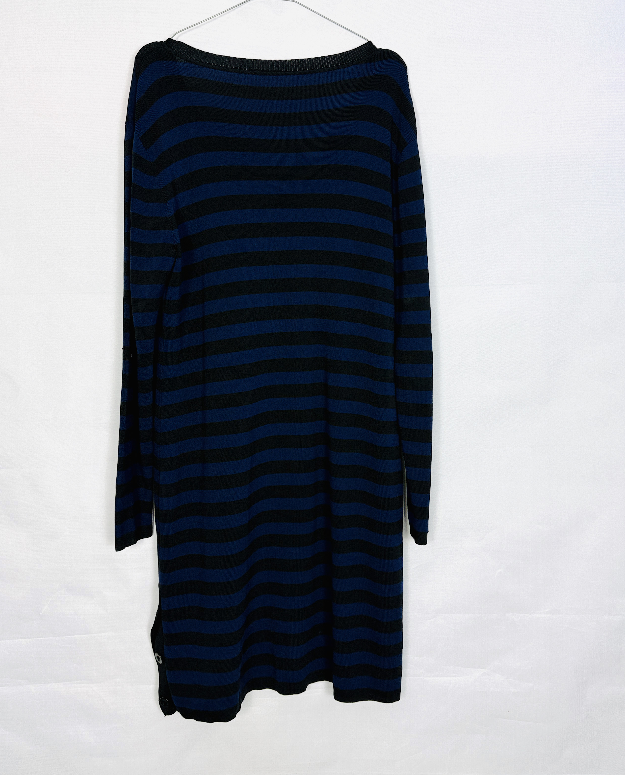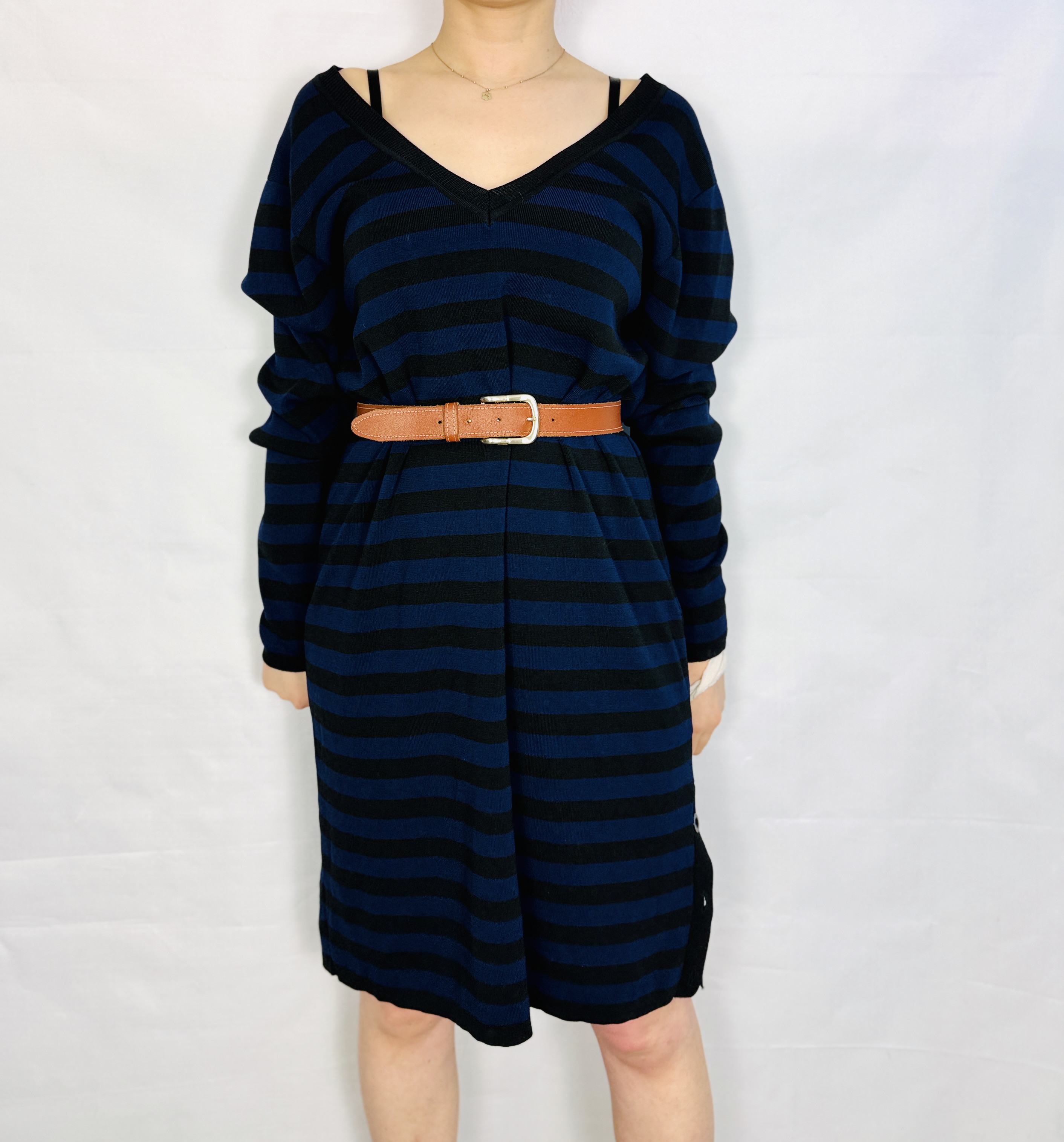 To sukienka o wyraźnym, ale stonowanym charakterze — szerokie, poziome paski w odcieniach granatowym i czarnym nadają jej graficznej siły, a zarazem spokojnej elegancji. Fason łączy prostotę z kobiecą nutą dzięki dekoltowi w serek i uporządkowanej sylwetce; to propozycja, która sprawdzi się zarówno w codziennych, jak i bardziej oficjalnych zestawieniach, oferując klasyczny wygląd z subtelnym, współczesnym akcentem.