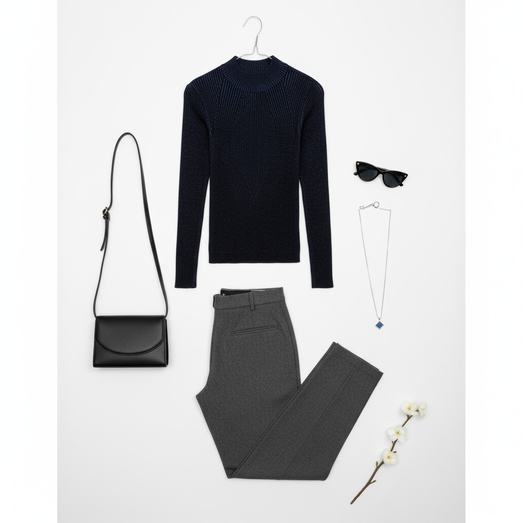 W stylizacjach sweter jest bardzo uniwersalny: na co dzień doskonale wygląda z jeansami i sneakersami lub botkami, do pracy doda szyku w towarzystwie cygaretek i klasycznego płaszcza, a na wieczór można go zestawić z elegancką spódnicą i szpilkami, by podkreślić jego bardziej wyrazowy charakter. Kolorystyka — granat i czerń — świetnie komponuje się z metalicznymi dodatkami w tonacji srebra, z kremem i beżem dla łagodniejszych zestawów, a także z głębokim bordo czy butelkową zielenią, jeśli chcesz nadać lookowi zdecydowanego akcentu. Ten sweter to elegancka baza, która potrafi zarówno wyciszyć, jak i podkreślić styl całej stylizacji.