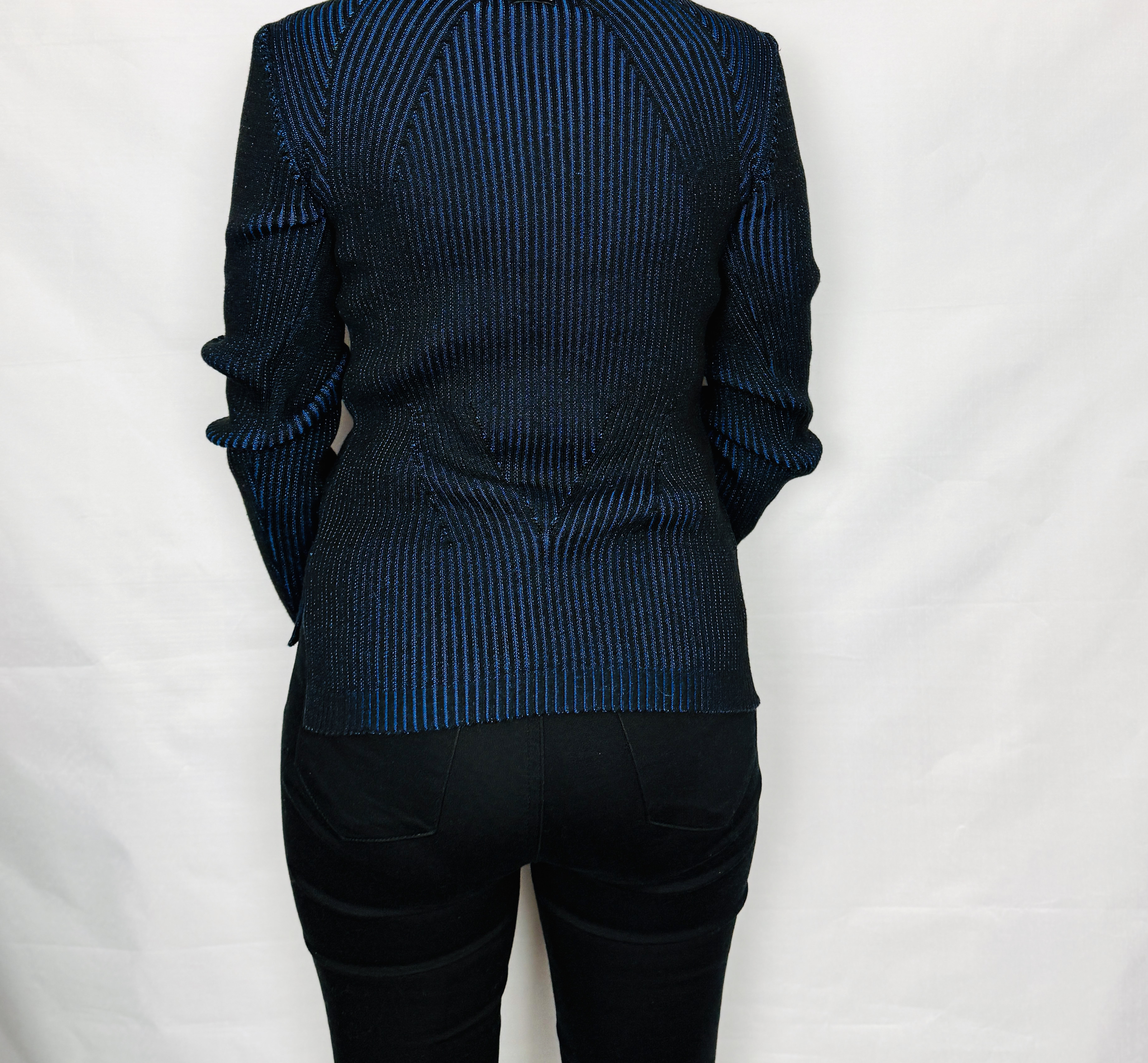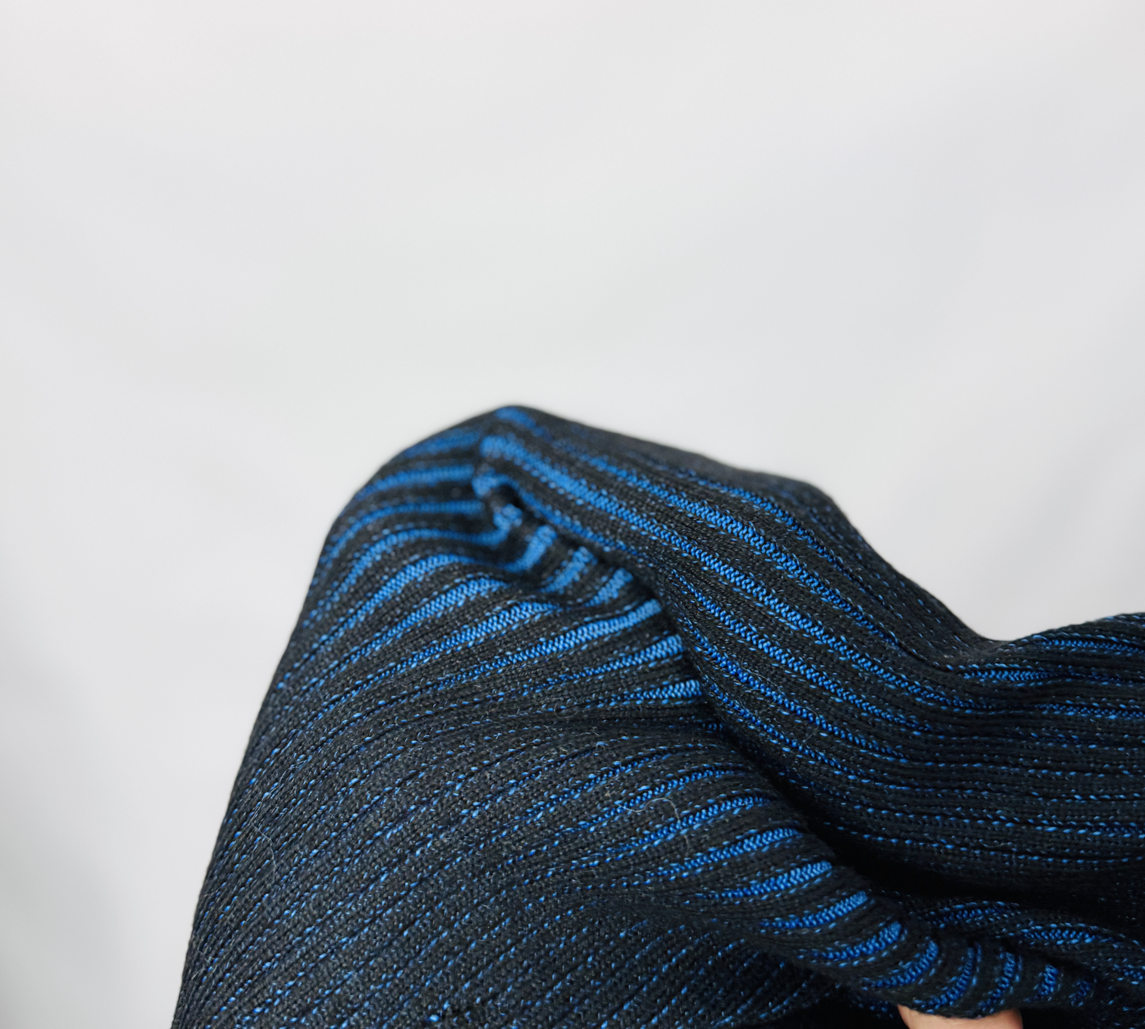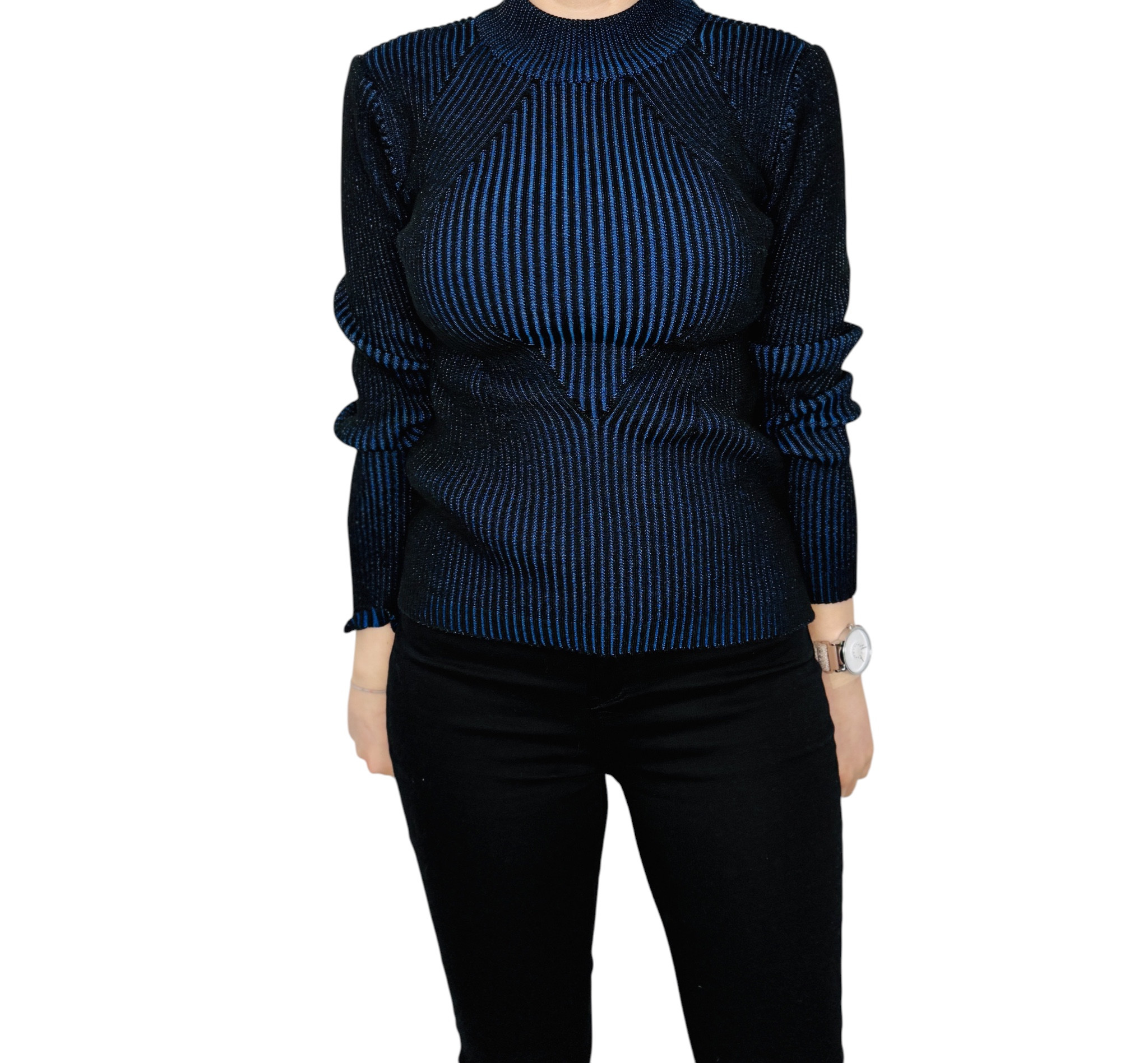 Ten granatowo czarny sweter to połączenie nowoczesnej struktury i subtelnego blasku, które razem tworzą wyrafinowany, kobiecy efekt. Głęboki granat przepuszczony między pionowymi prążkami ożywia klasyczną czerń, nadając całości eleganckiego, lecz zarazem wyrazistego charakteru. Sweter ma w sobie nutę wieczorowej finezji, ale dzięki uporządkowanej formie sprawdzi się równie dobrze w codziennych stylizacjach — to ubranie dla tych, które lubią, gdy prostota kryje dopracowany detal.