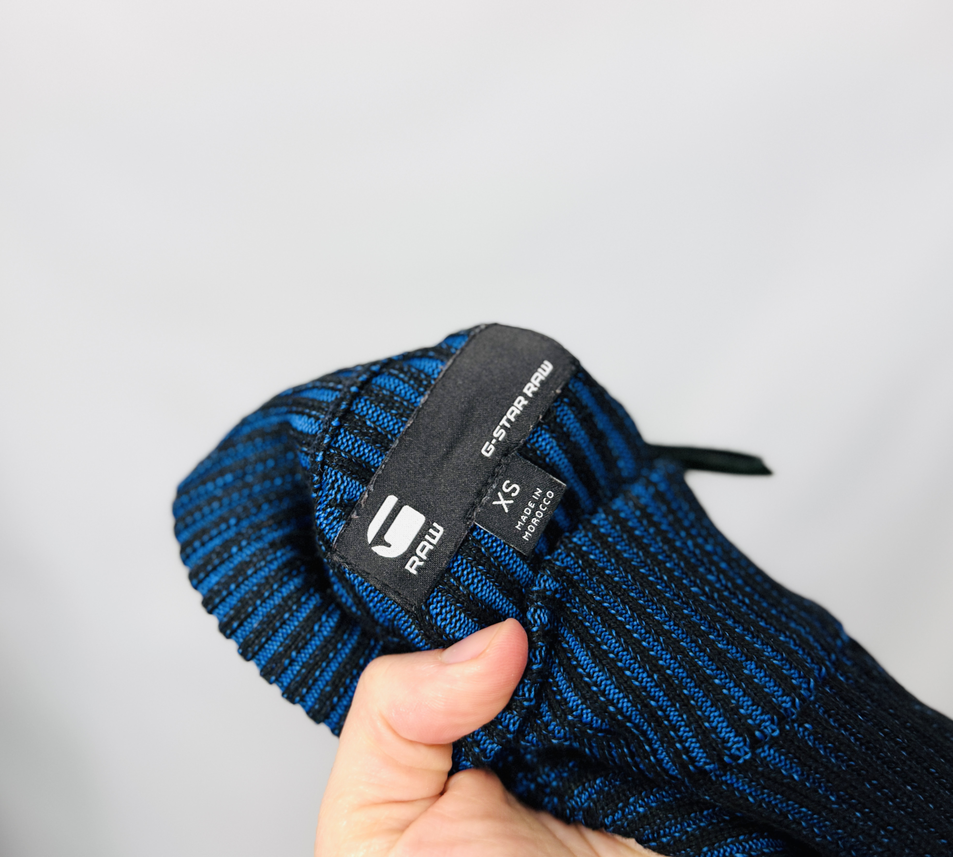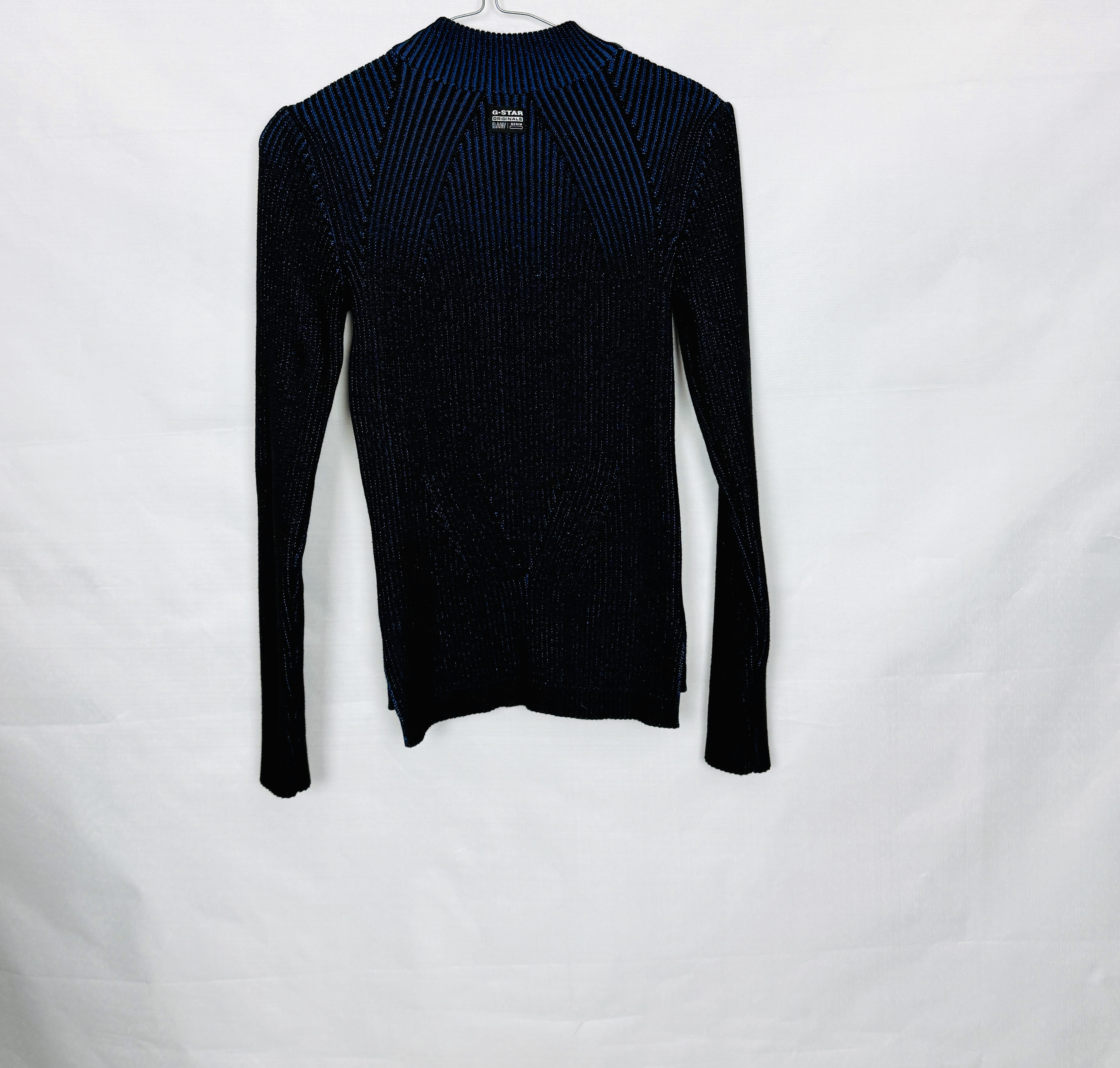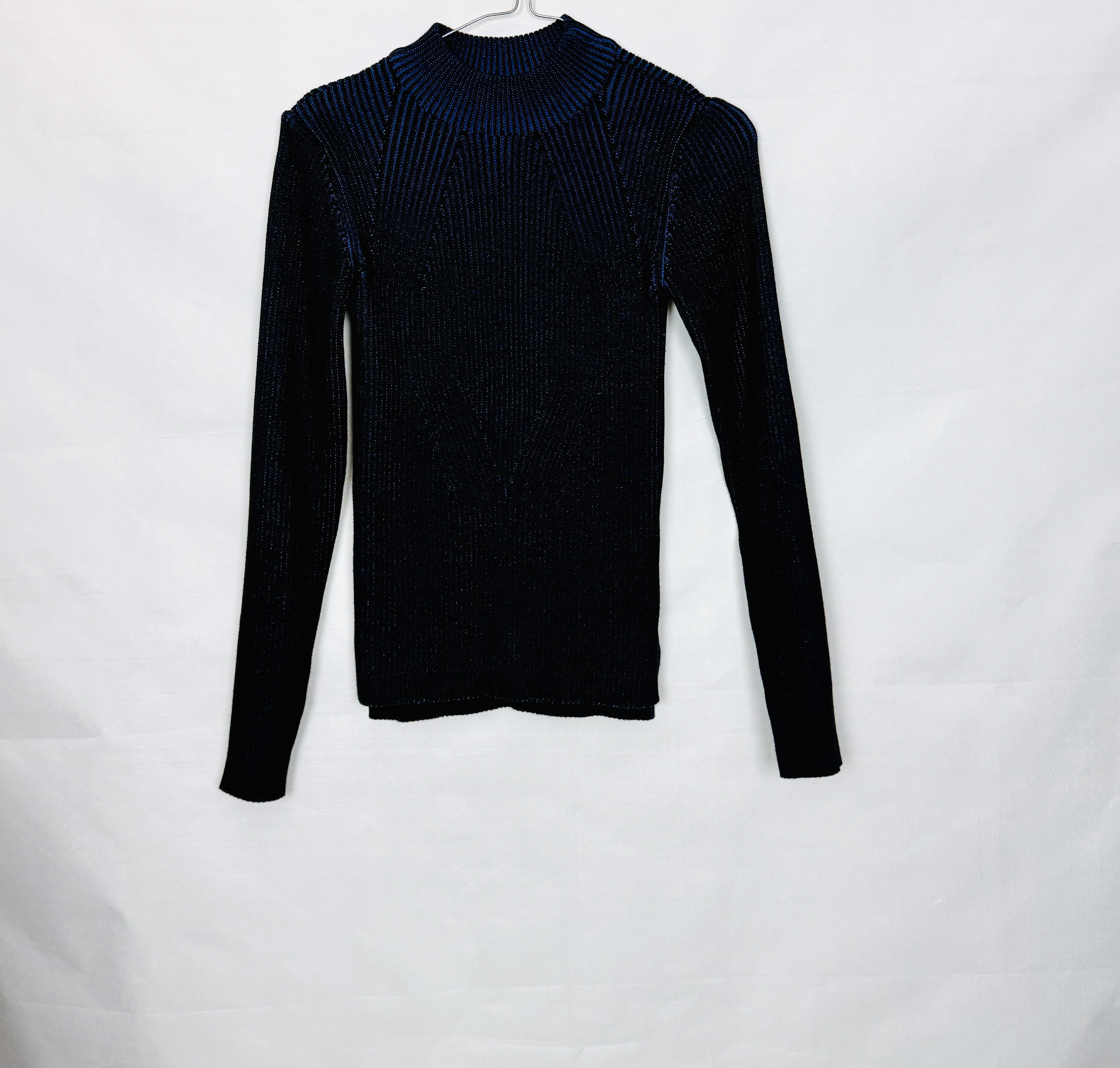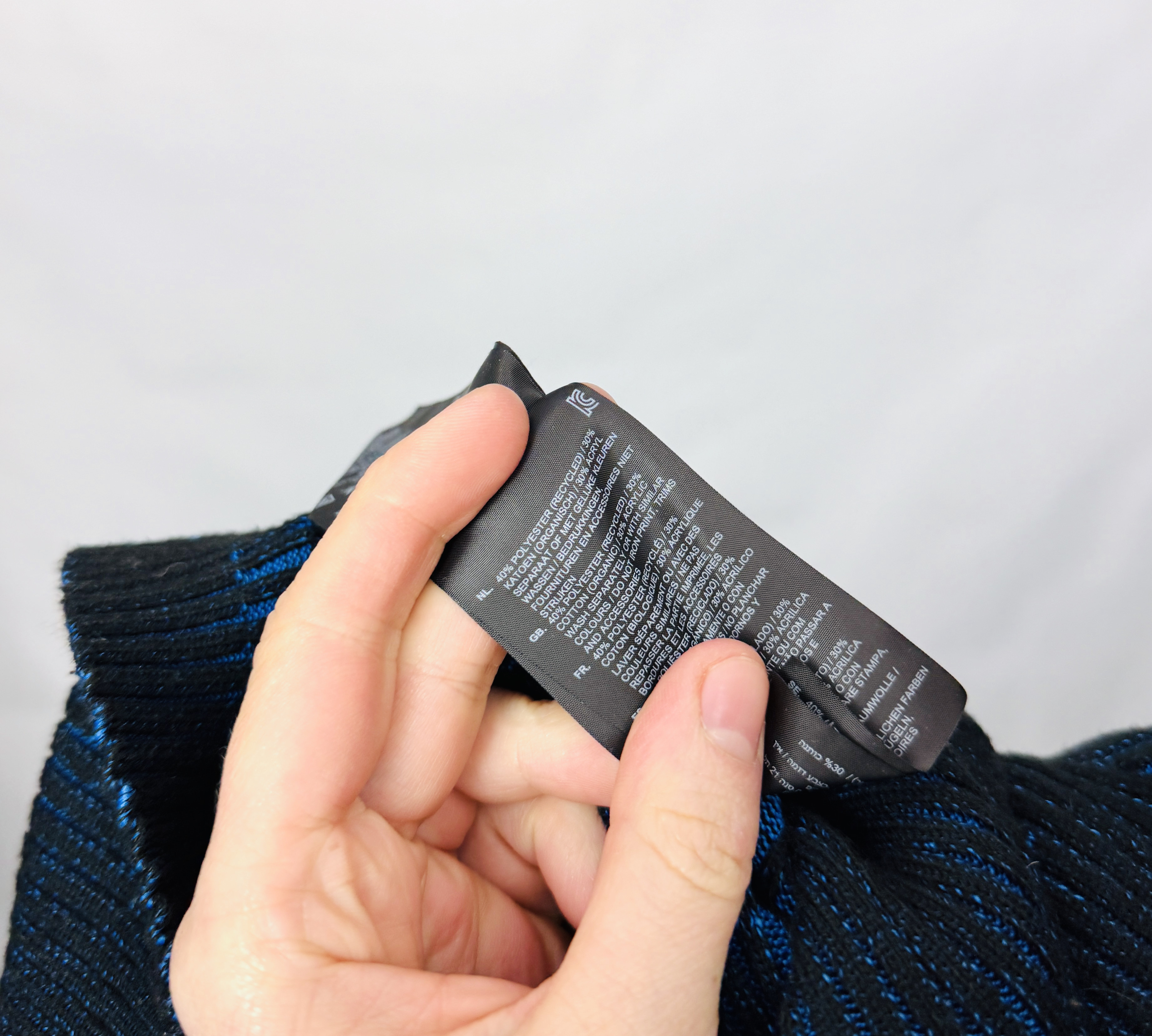 Ten granatowo czarny sweter to połączenie nowoczesnej struktury i subtelnego blasku, które razem tworzą wyrafinowany, kobiecy efekt. Głęboki granat przepuszczony między pionowymi prążkami ożywia klasyczną czerń, nadając całości eleganckiego, lecz zarazem wyrazistego charakteru. Sweter ma w sobie nutę wieczorowej finezji, ale dzięki uporządkowanej formie sprawdzi się równie dobrze w codziennych stylizacjach — to ubranie dla tych, które lubią, gdy prostota kryje dopracowany detal.