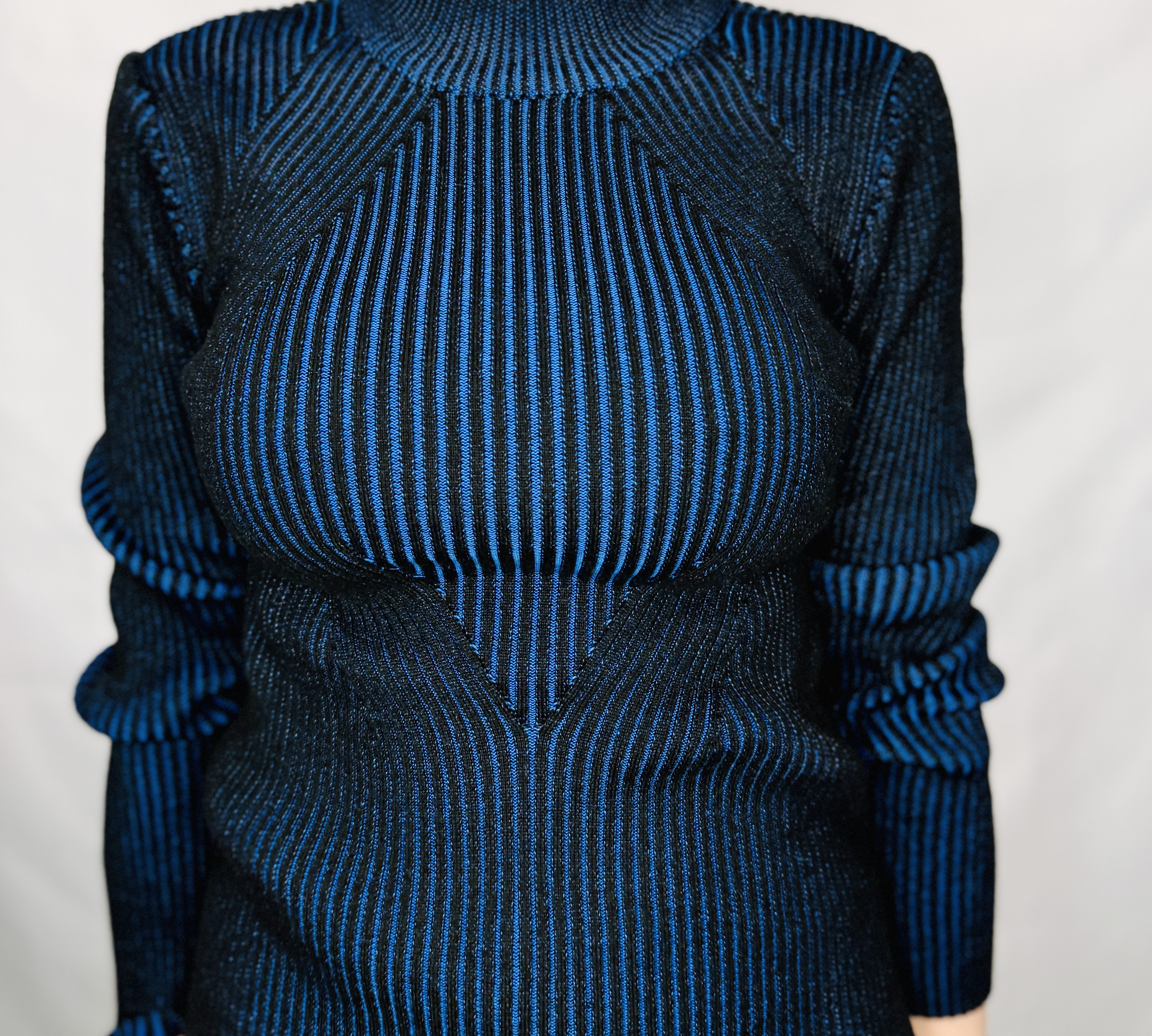 Rękawy są długie, o dopasowanej linii z delikatnym marszczeniem w okolicy łokcia, które nadaje im miękkości i naturalnego rytmu przy ruchu. Wyraźne ściągacze przy mankietach porządkują formę i podkreślają eleganckie wykończenie. Faktura dzianiny prezentuje się lekko połyskująco i elastycznie — materiał ma wyraźne prążkowanie, które jest jednocześnie dekoracją i konstrukcyjnym zabiegiem modelującym, dzięki czemu sweter pięknie układa się przy ciele, nie tracąc przy tym komfortu.