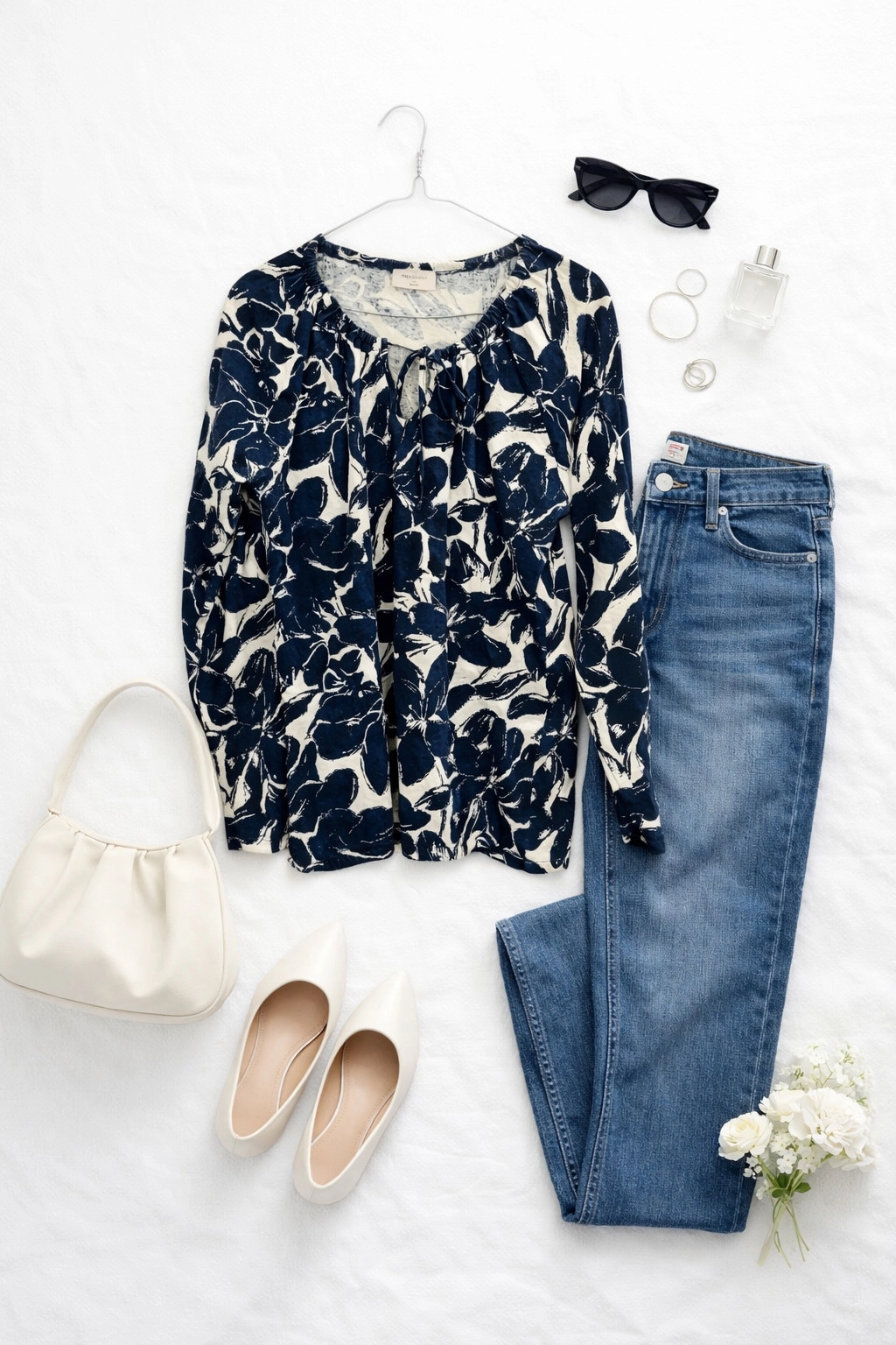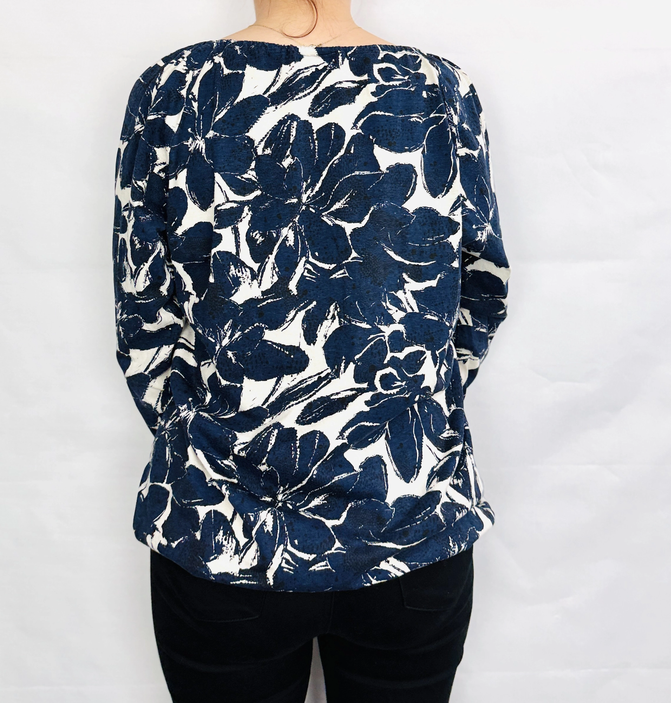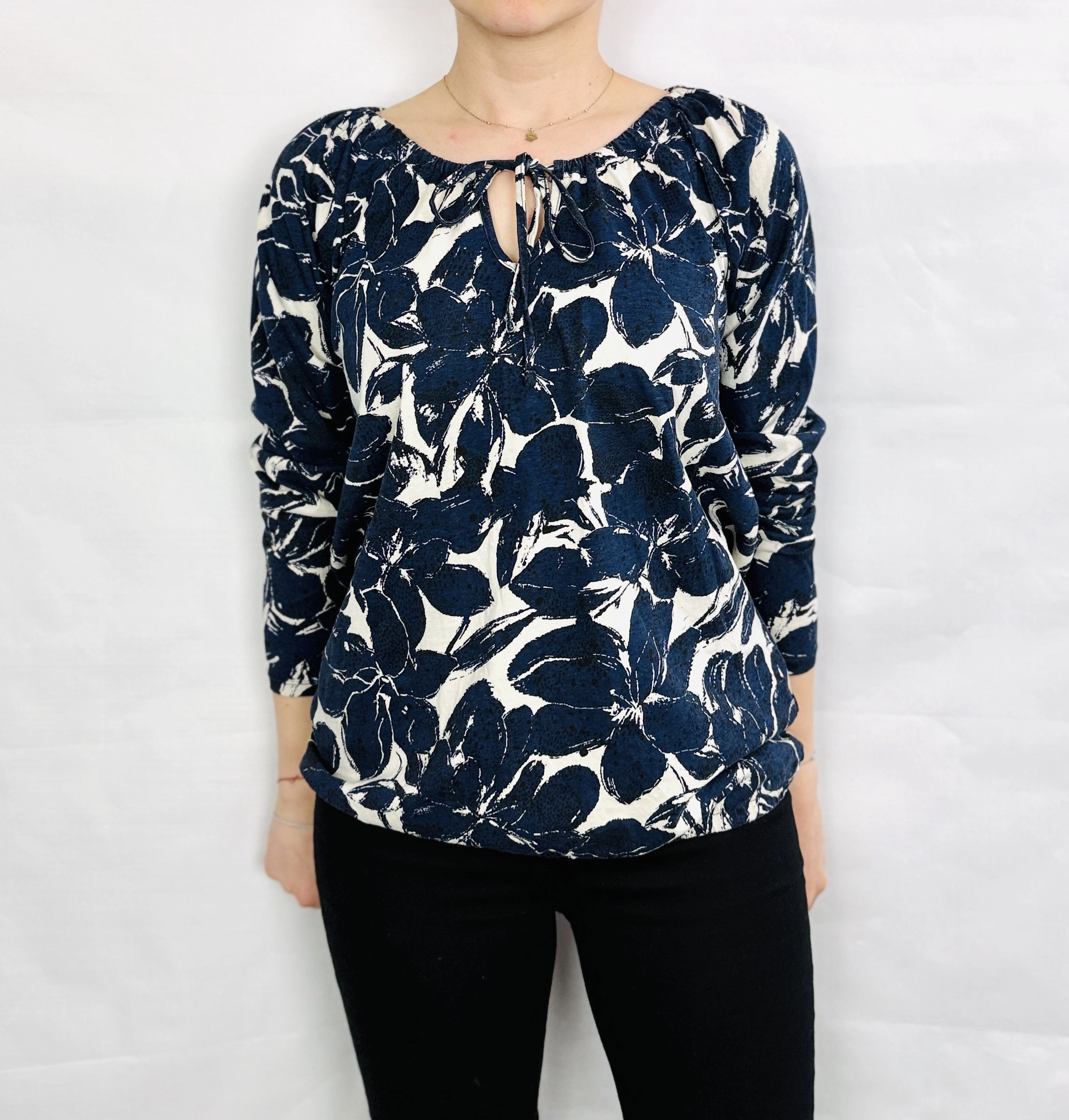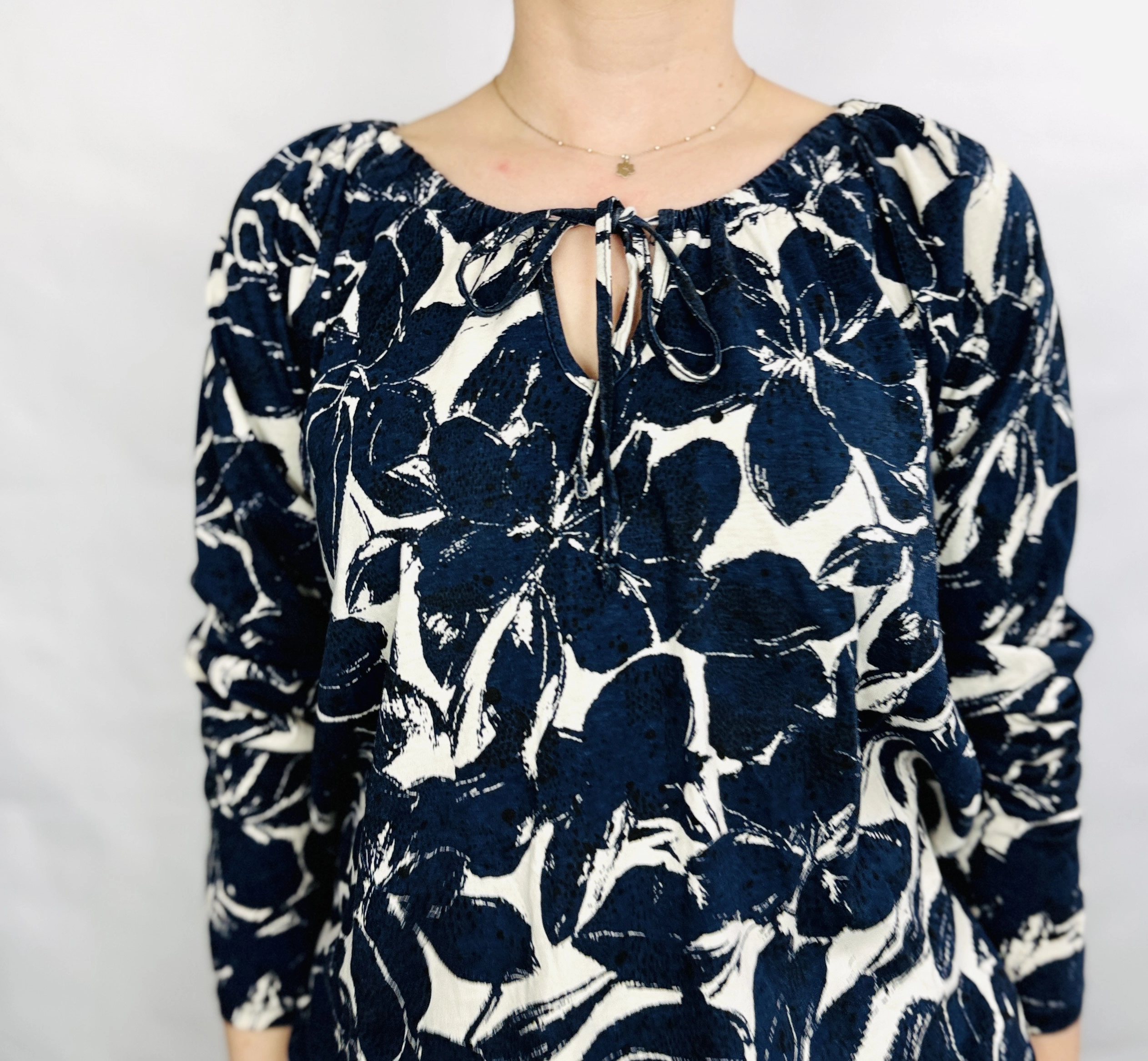 Długość bluzki sięga lekko za linię bioder, co czyni ją praktyczną i łatwą do stylizowania z różnorodnymi elementami garderoby. Doskonale komponuje się zarówno z klasycznymi jeansami, jak i eleganckimi spódnicami czy spodniami o prostym kroju, tworząc stylizacje na wiele okazji – od codziennych spacerów, przez spotkania w pracy, aż po bardziej formalne wydarzenia. Granatowo-kremowy wzór kwiatowy pozwala na łatwe łączenie z neutralnymi barwami, takimi jak granat, biel czy beż, ale także z pastelami i delikatnymi akcentami różu czy mięty, co daje szerokie możliwości stylizacyjne.