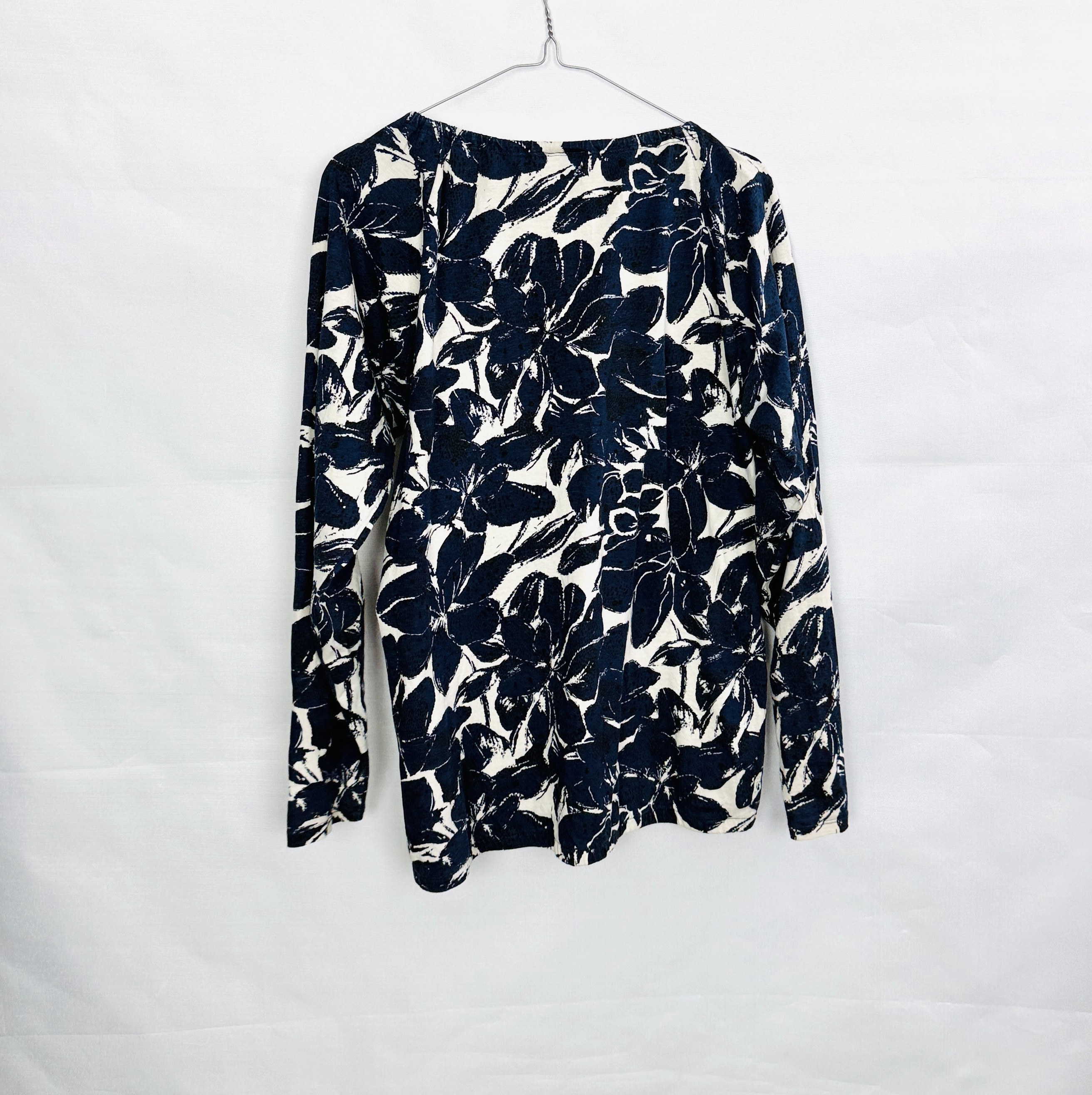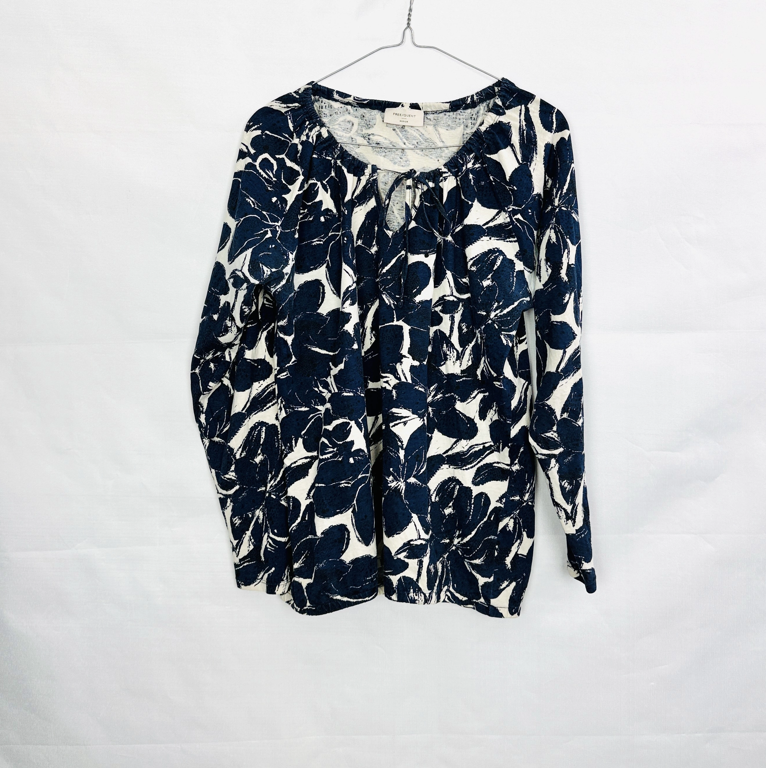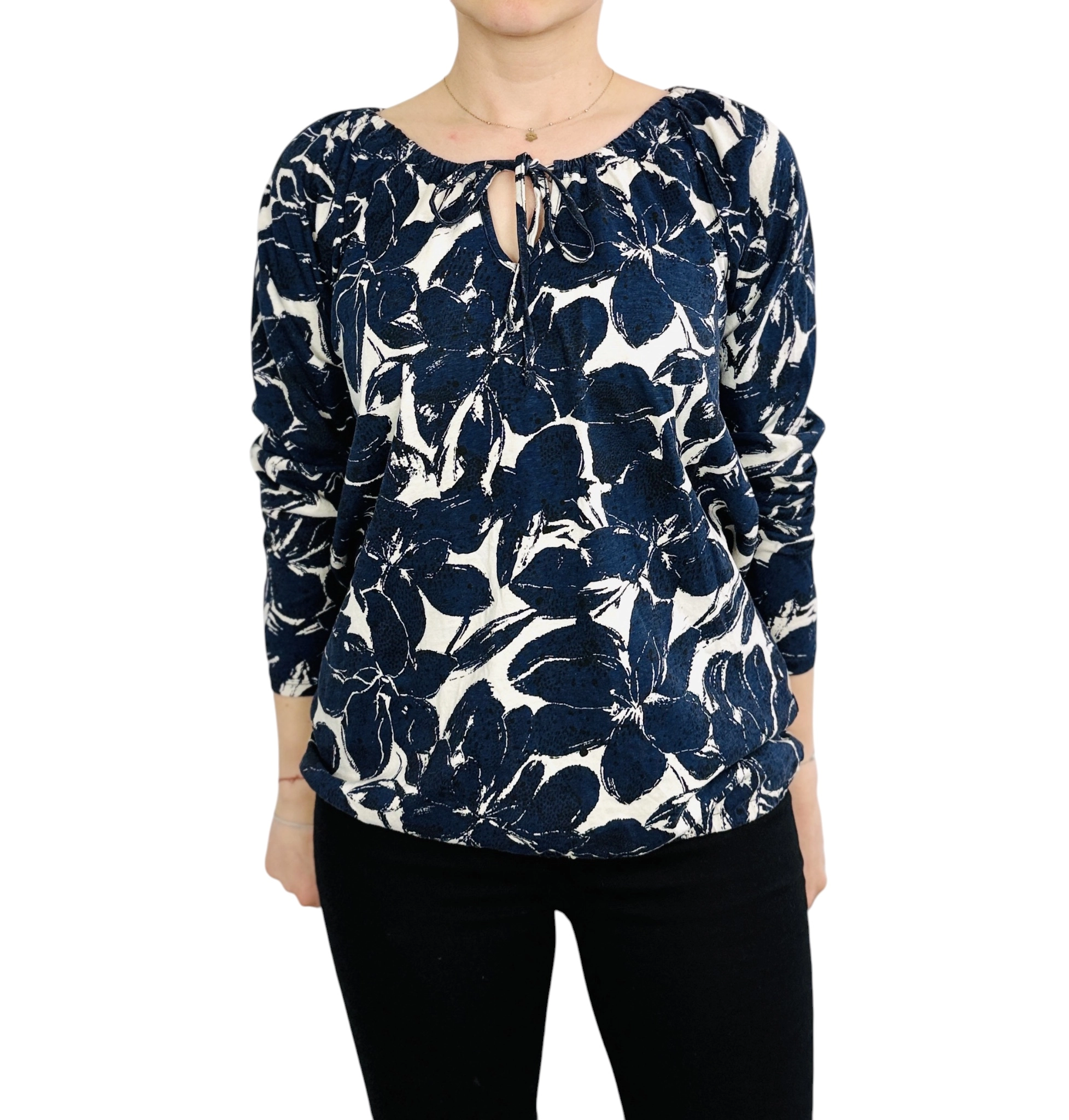 Granatowo kremowa bluzka w kwiaty z wiązaniem przy dekolcie M 38