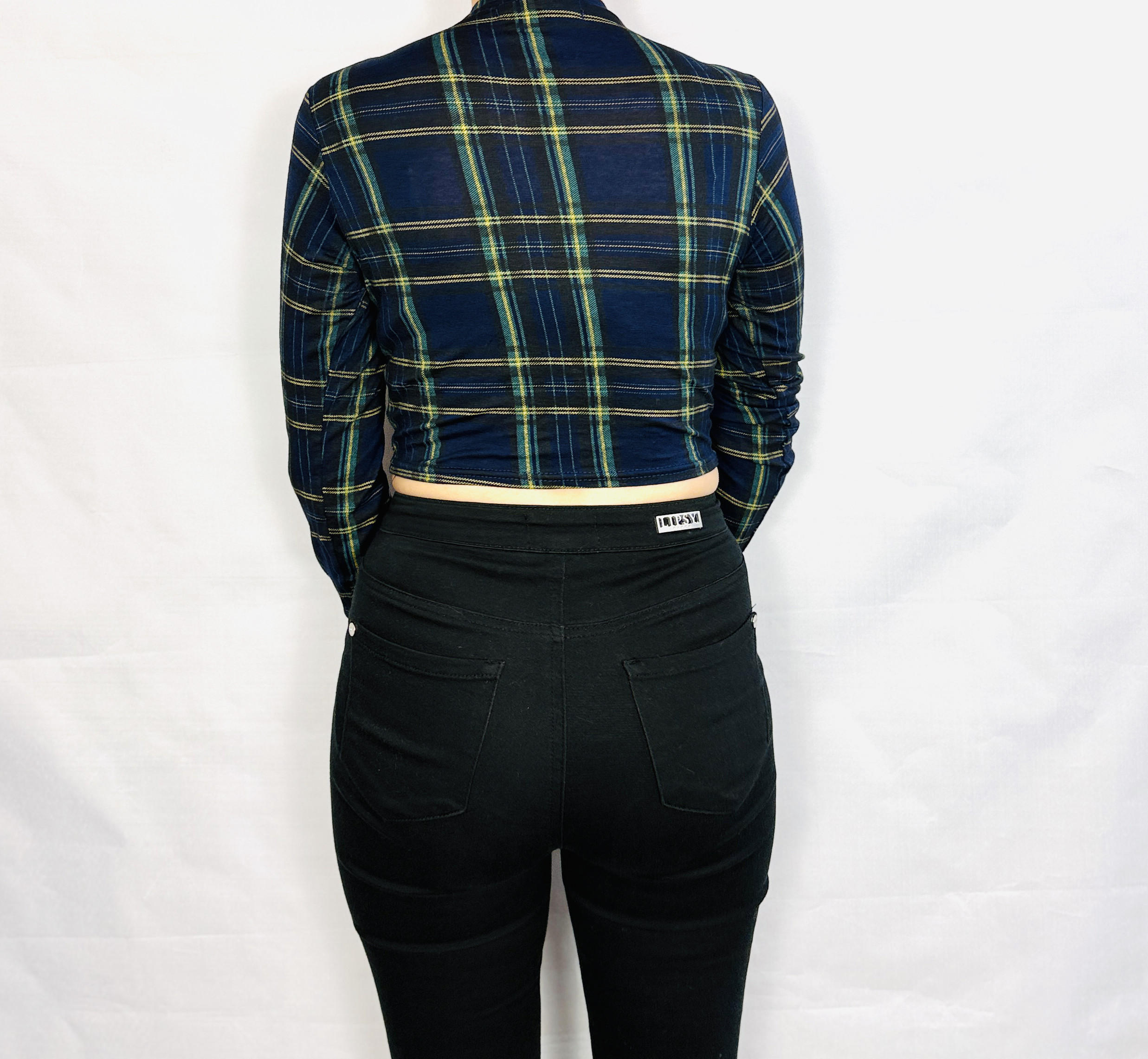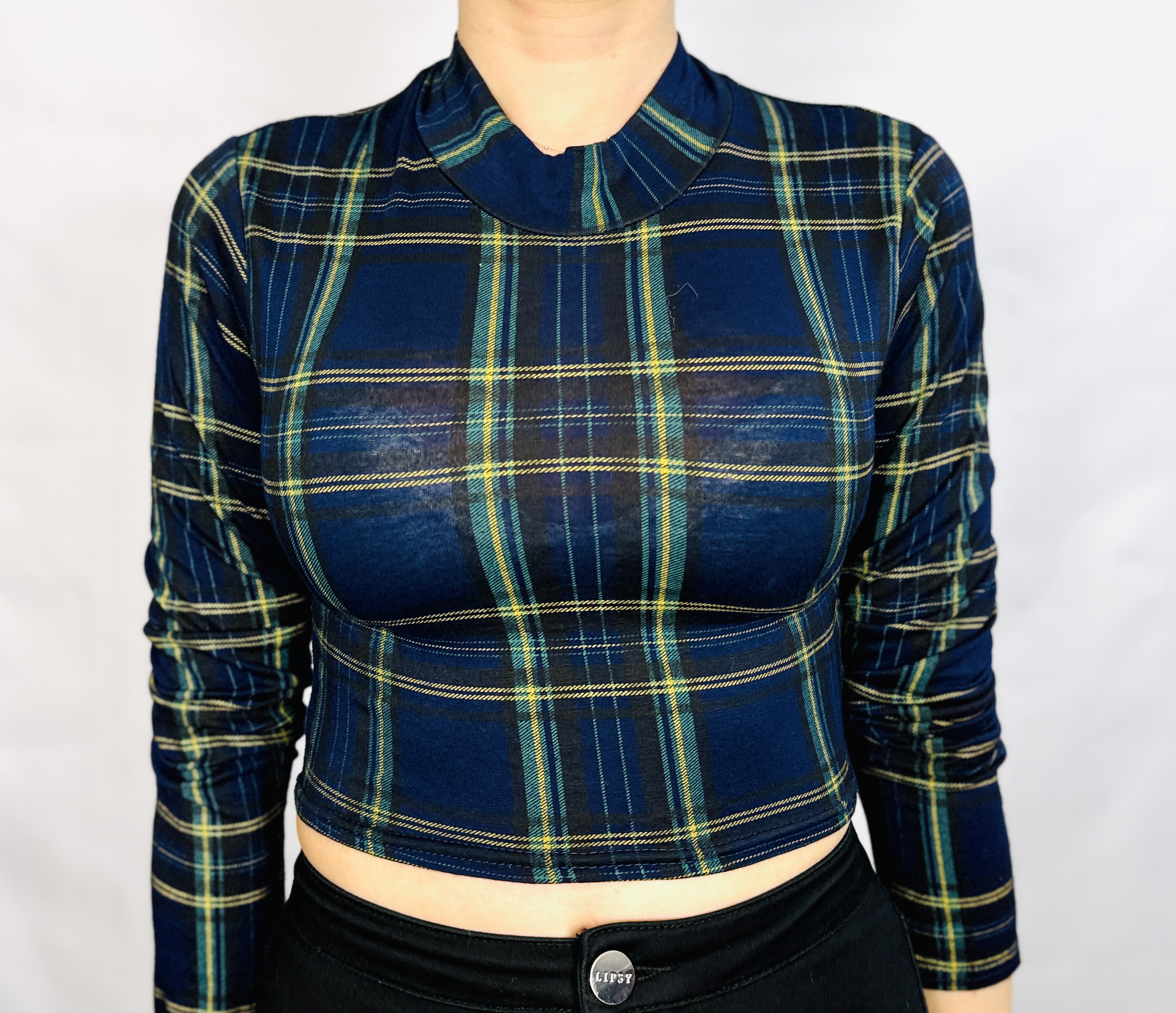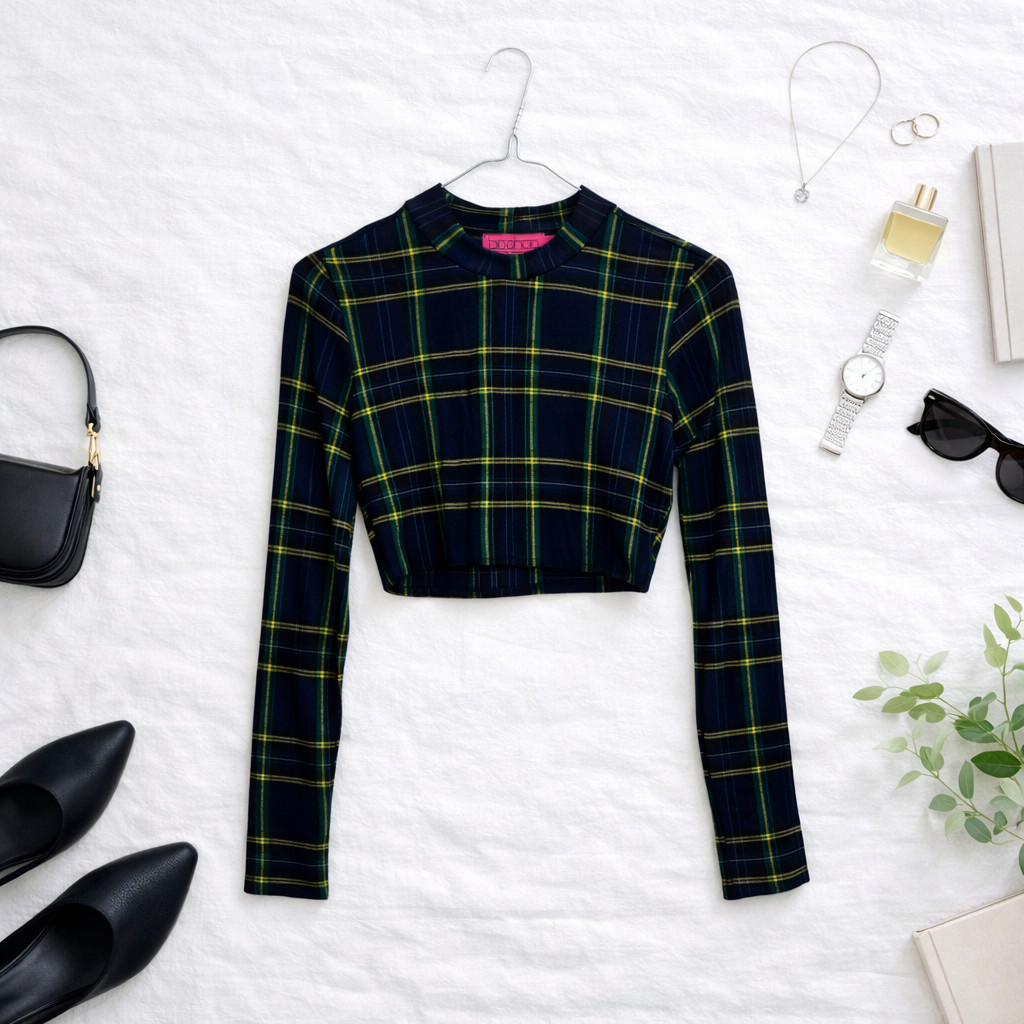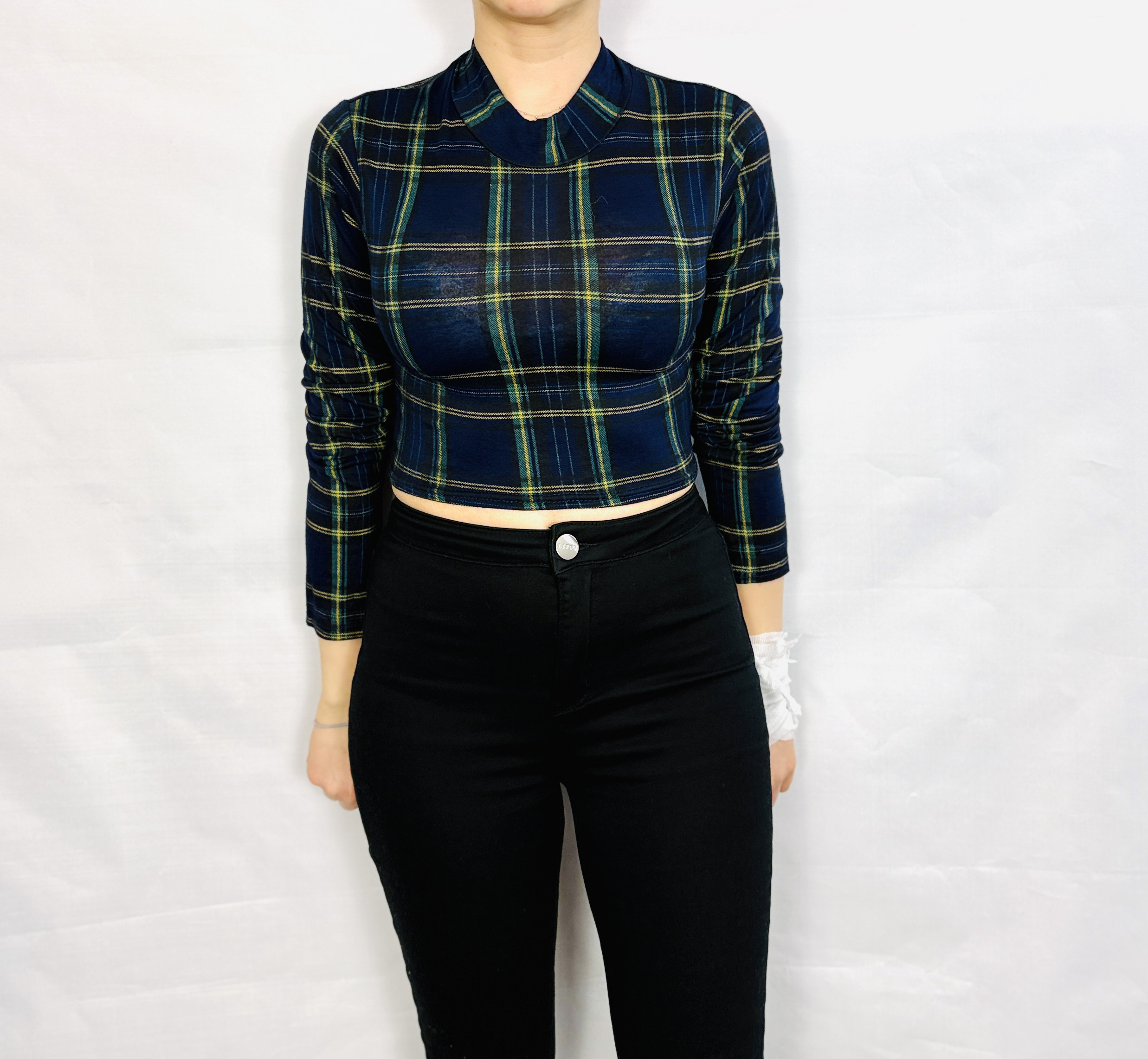 Fason korzystnie wpływa na proporcje sylwetki: krój podkreślający biust i krótka długość optycznie skracają tułów, za to wysoki stan spodni lub spódnicy wydłuża nogi, tworząc zbalansowaną całość. Krata przyciąga uwagę ku górze, co może pomóc wyrównać proporcje u sylwetek gruszka, natomiast dopasowanie modeluje talię, co docenią sylwetki klepsydra i prostokąt, którym bluzka doda zarysowania. Dzięki elastyczności materiału fason zapewnia komfort ruchu, jednocześnie podkreślając kobiece kontury.