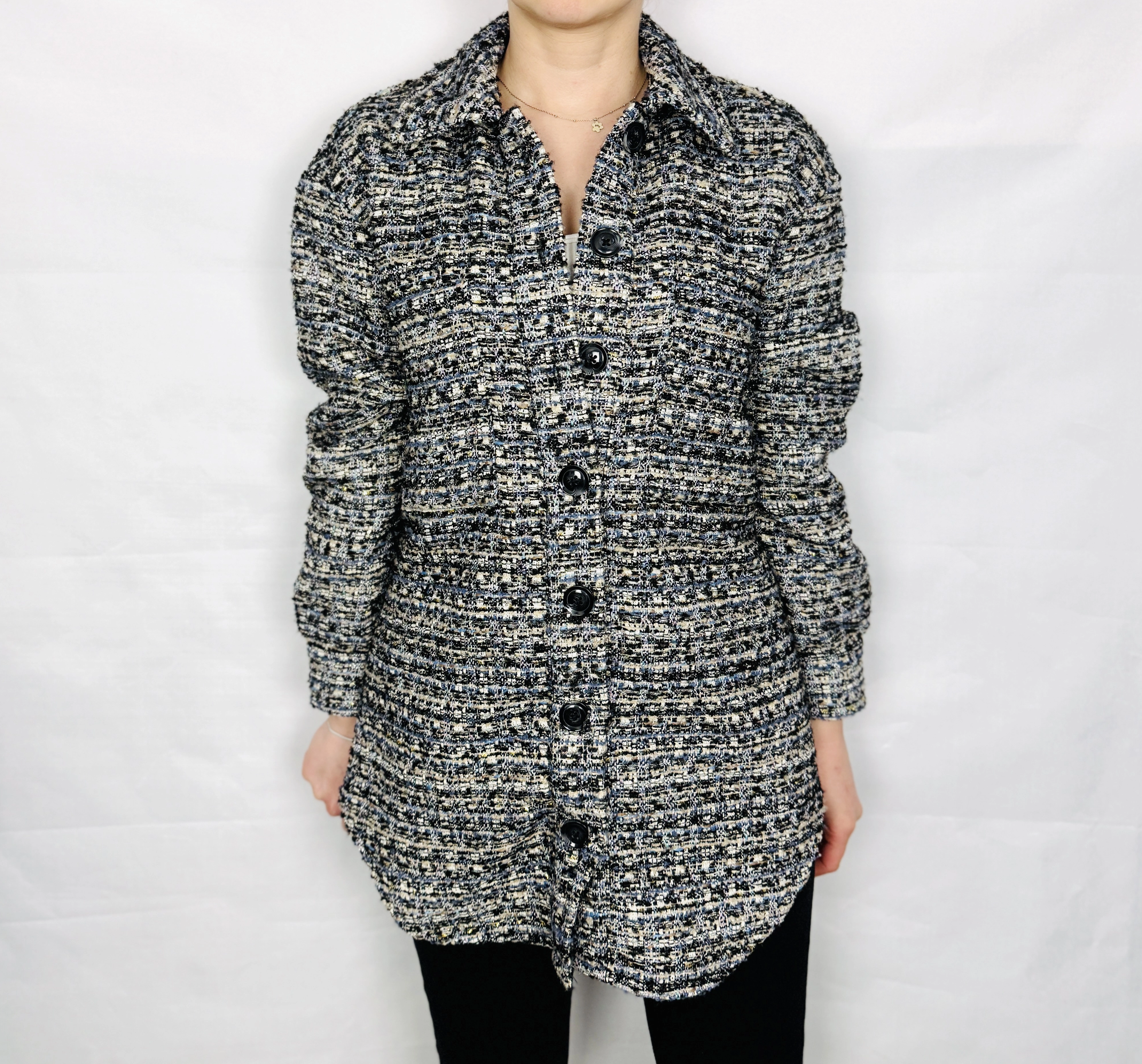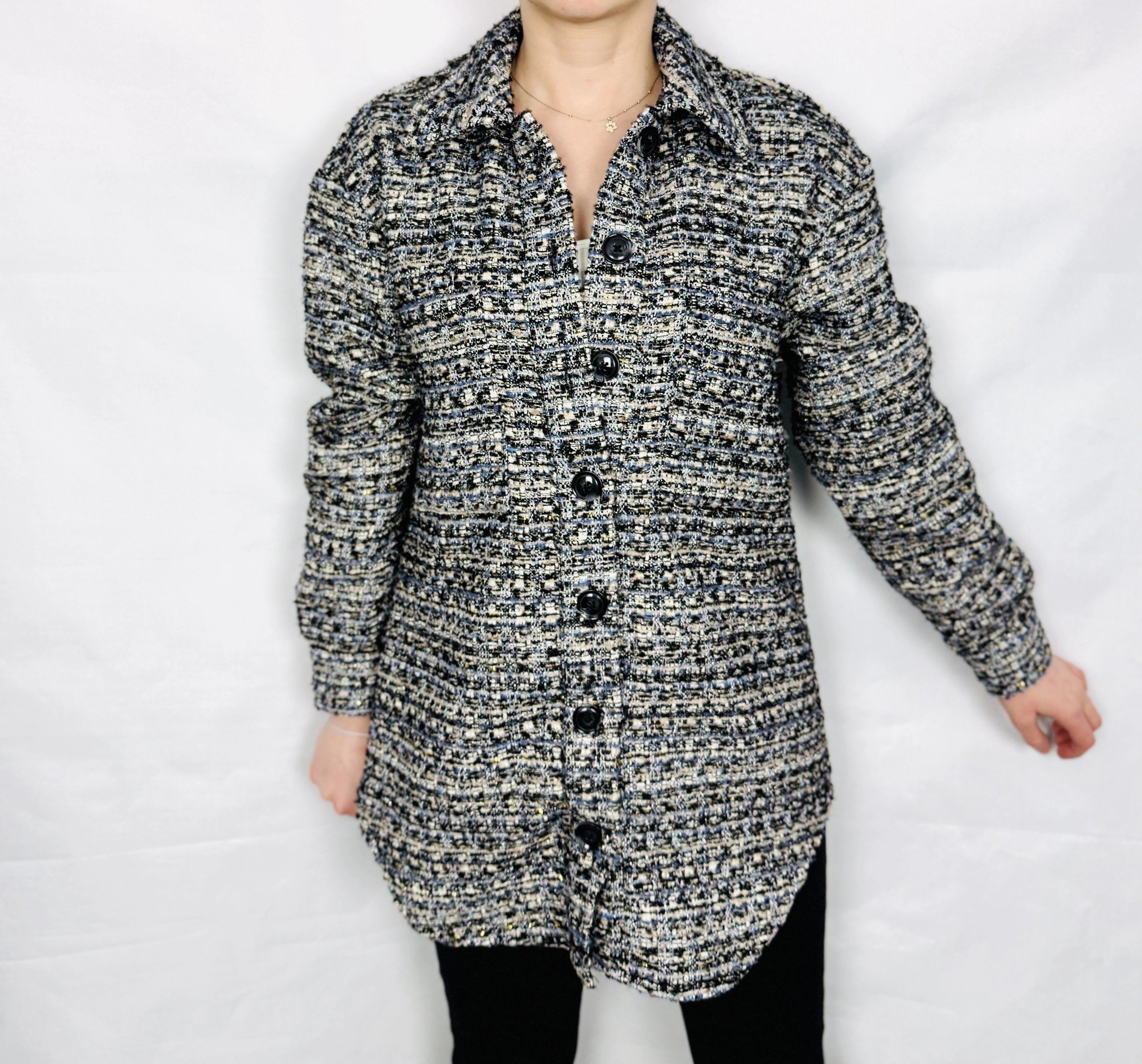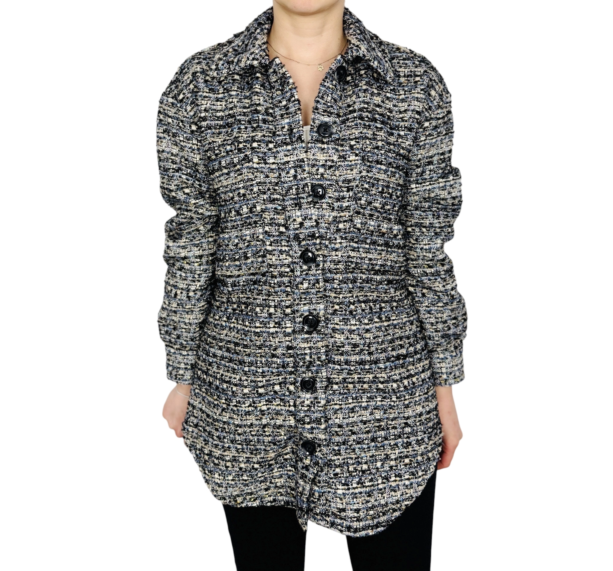Ta koszula wierzchnia to idealne połączenie nastrojowej klasyki z nowoczesnym, miejskim stylem, które wprowadza do kobiecej szafy wyjątkowe poczucie ciepła oraz nienagannej elegancji. Melanżowa struktura materiału w odcieniach szarości, czerni i bieli, urozmaicona subtelnymi akcentami beżu, tworzy niezwykle głęboką i szlachetną kompozycję, która od razu przyciąga uwagę swoją trójwymiarowością. To ubiór, który emanuje spokojem i nastrojową pewnością siebie, stanowiąc niezastąpiony element garderoby w chłodniejsze, radosne dni. Jej fason nawiązuje do męskiej szafy, jednak dzięki starannemu wykończeniu i nastrojowej kolorystyce, całość pozostaje w pełni kobieca, oferując unikalny balans między profesjonalnym szykiem a codzienną swobodą w nastrojowym wydaniu.
