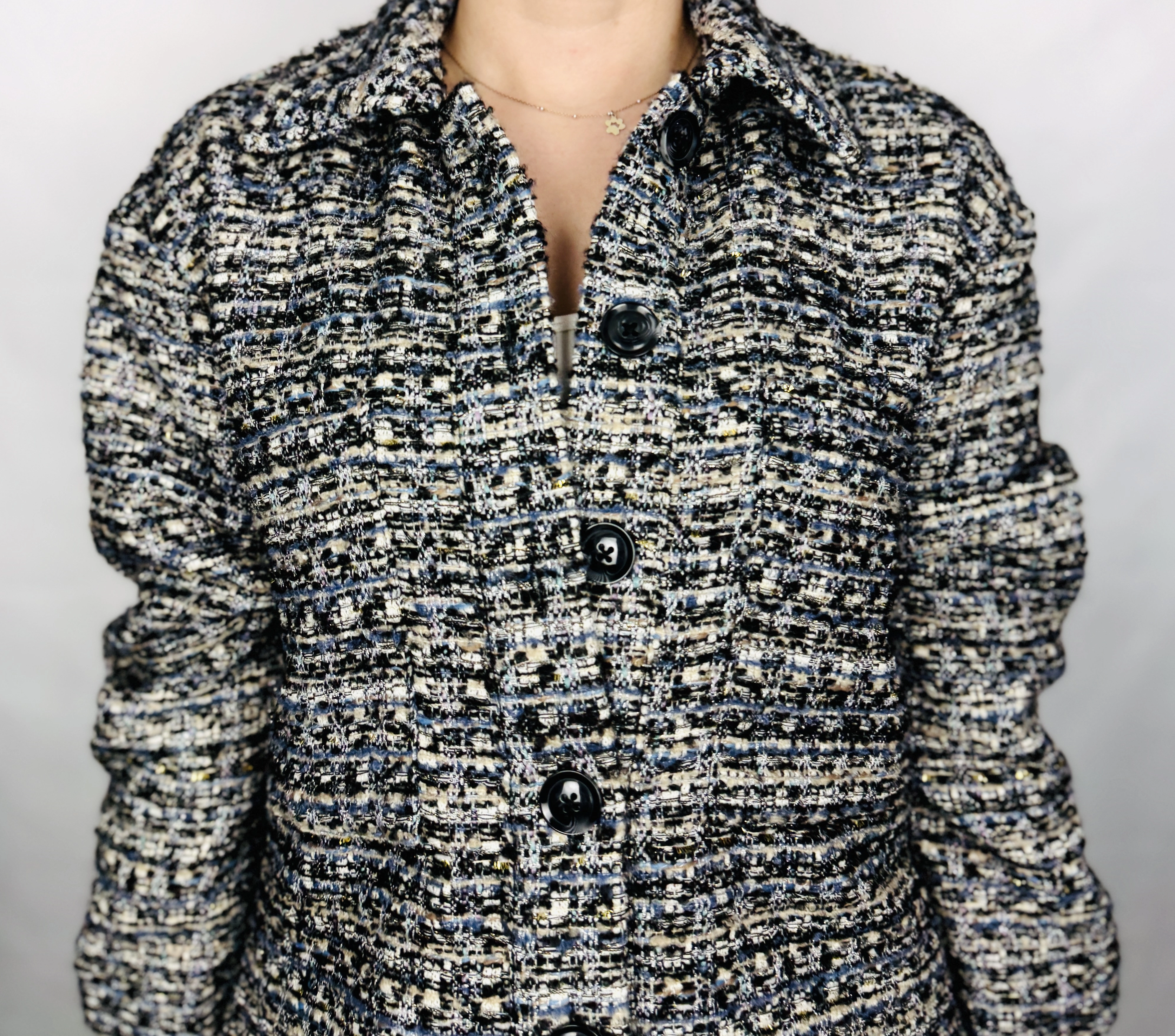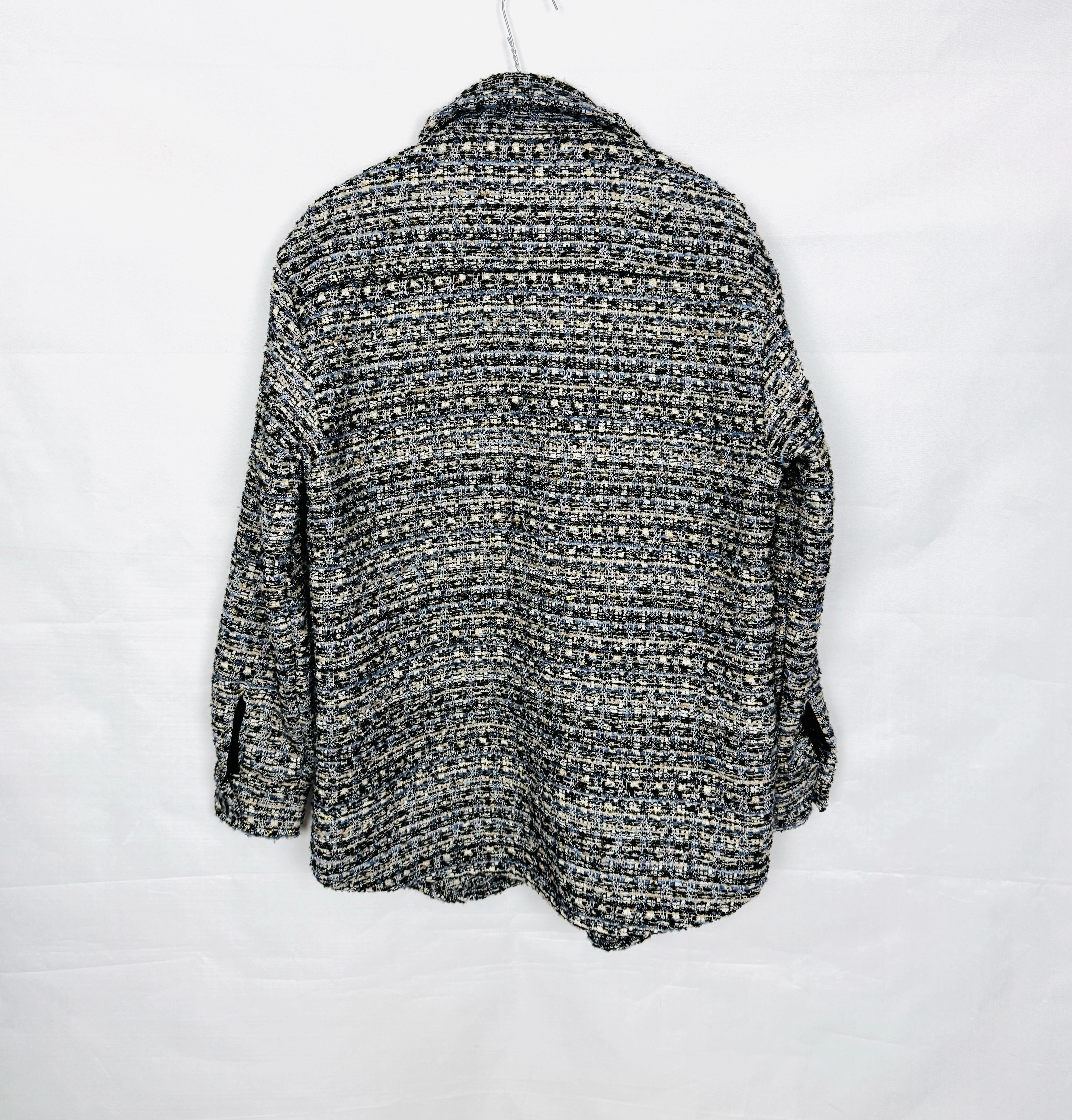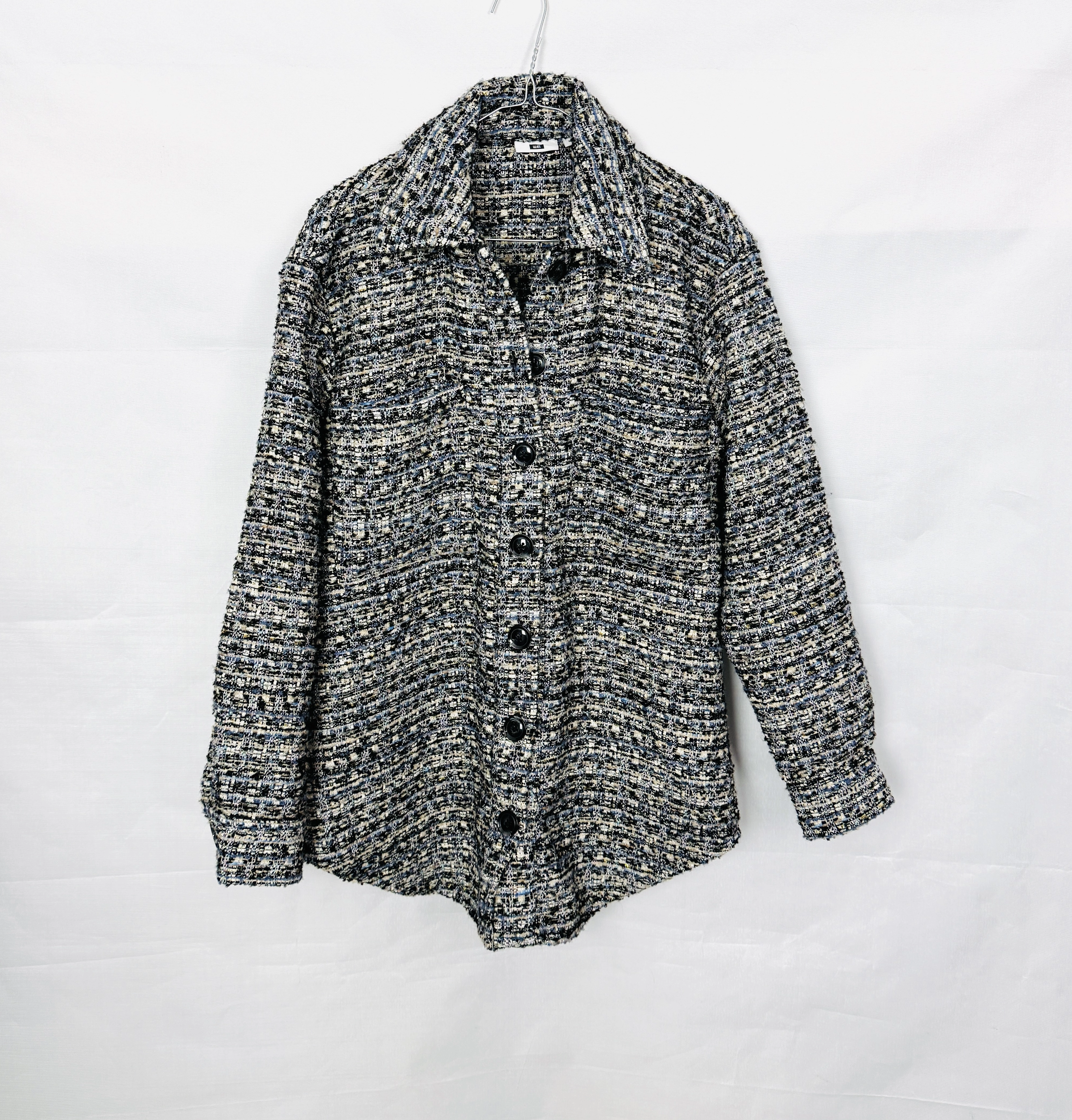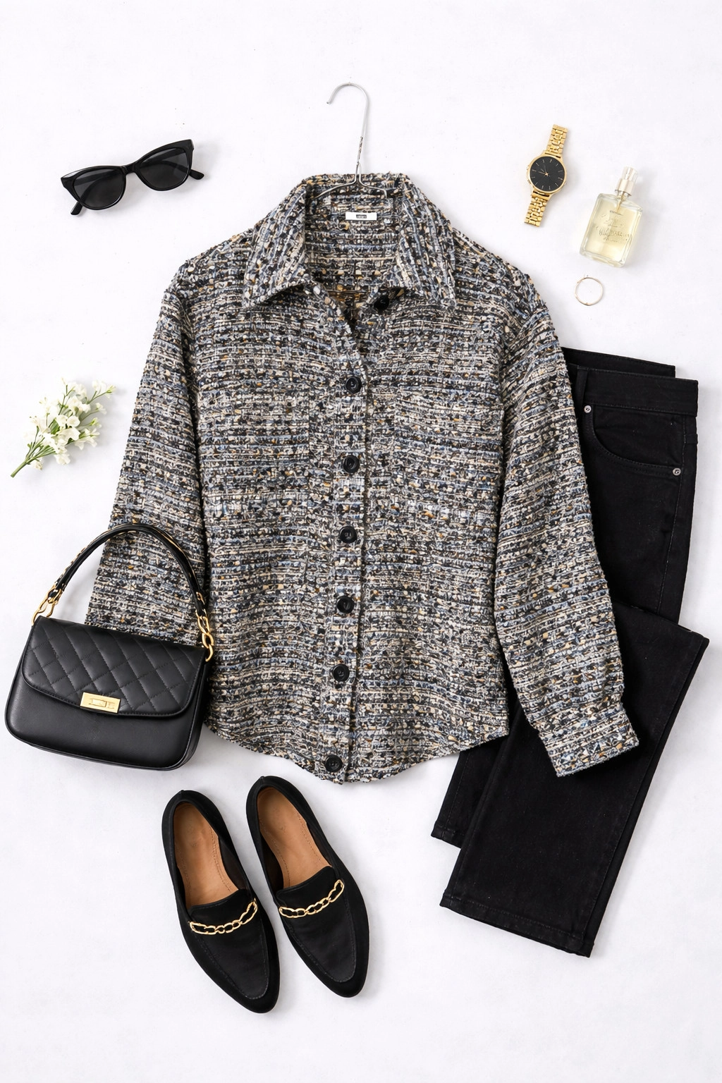 Ta koszula wierzchnia to idealne połączenie nastrojowej klasyki z nowoczesnym, miejskim stylem, które wprowadza do kobiecej szafy wyjątkowe poczucie ciepła oraz nienagannej elegancji. Melanżowa struktura materiału w odcieniach szarości, czerni i bieli, urozmaicona subtelnymi akcentami beżu, tworzy niezwykle głęboką i szlachetną kompozycję, która od razu przyciąga uwagę swoją trójwymiarowością. To ubiór, który emanuje spokojem i nastrojową pewnością siebie, stanowiąc niezastąpiony element garderoby w chłodniejsze, radosne dni. Jej fason nawiązuje do męskiej szafy, jednak dzięki starannemu wykończeniu i nastrojowej kolorystyce, całość pozostaje w pełni kobieca, oferując unikalny balans między profesjonalnym szykiem a codzienną swobodą w nastrojowym wydaniu.