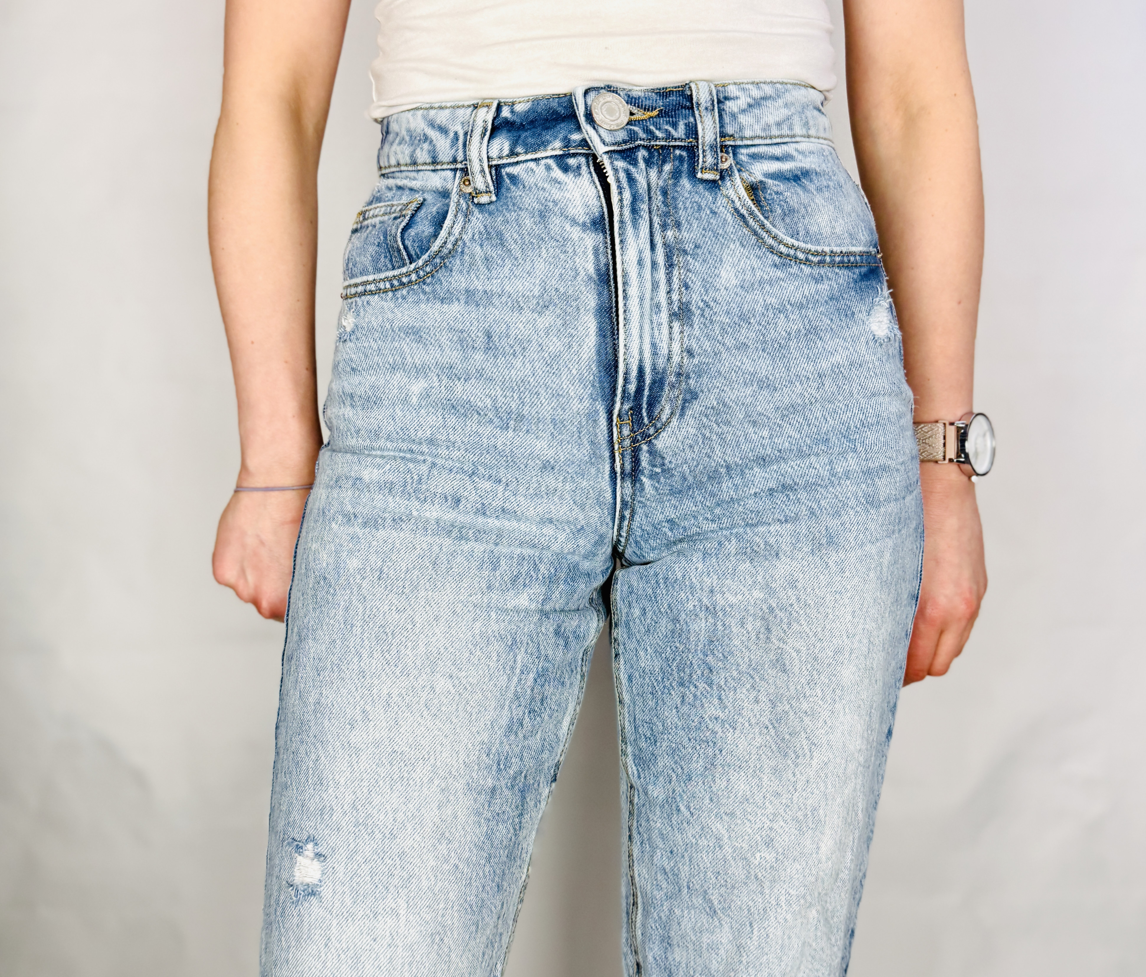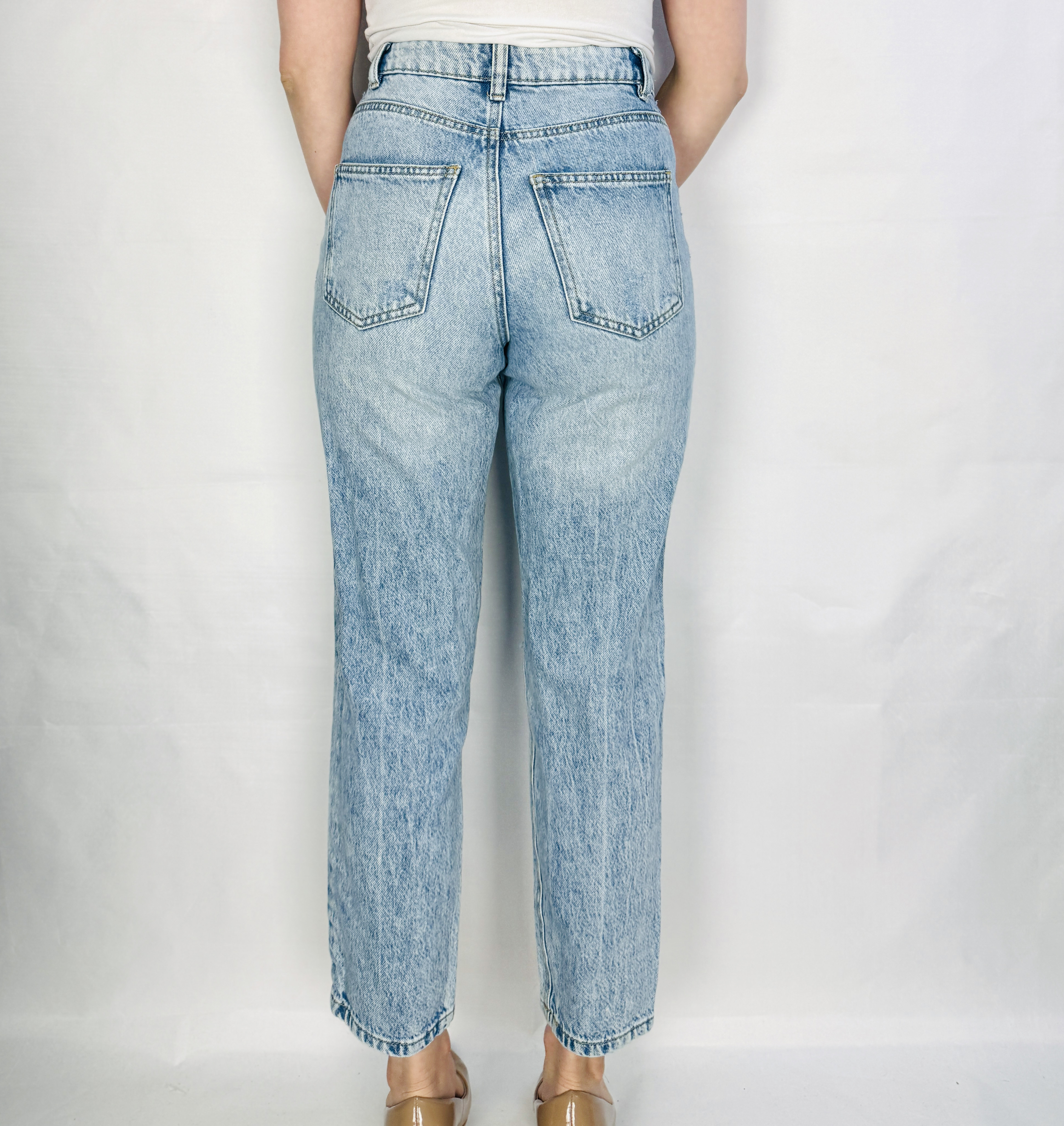 Krój to podwyższony stan, który stabilnie akcentuje talię i tworzy schludną, uporządkowaną górną linię sylwetki. Wokół talii widoczne są szlufki oraz klasyczne przeszycia, a przód wykańcza widoczny guzik nad rozporkiem, co podkreśla typową, denimową konstrukcję. Nogawka prowadzi prostą, nieco luźniejszą linią i kończy się nad kostką, co nadaje całości współczesnych proporcji — nie jest to skrajnie oversize, lecz wygodne, swobodne dopasowanie, które delikatnie opada wzdłuż ud.