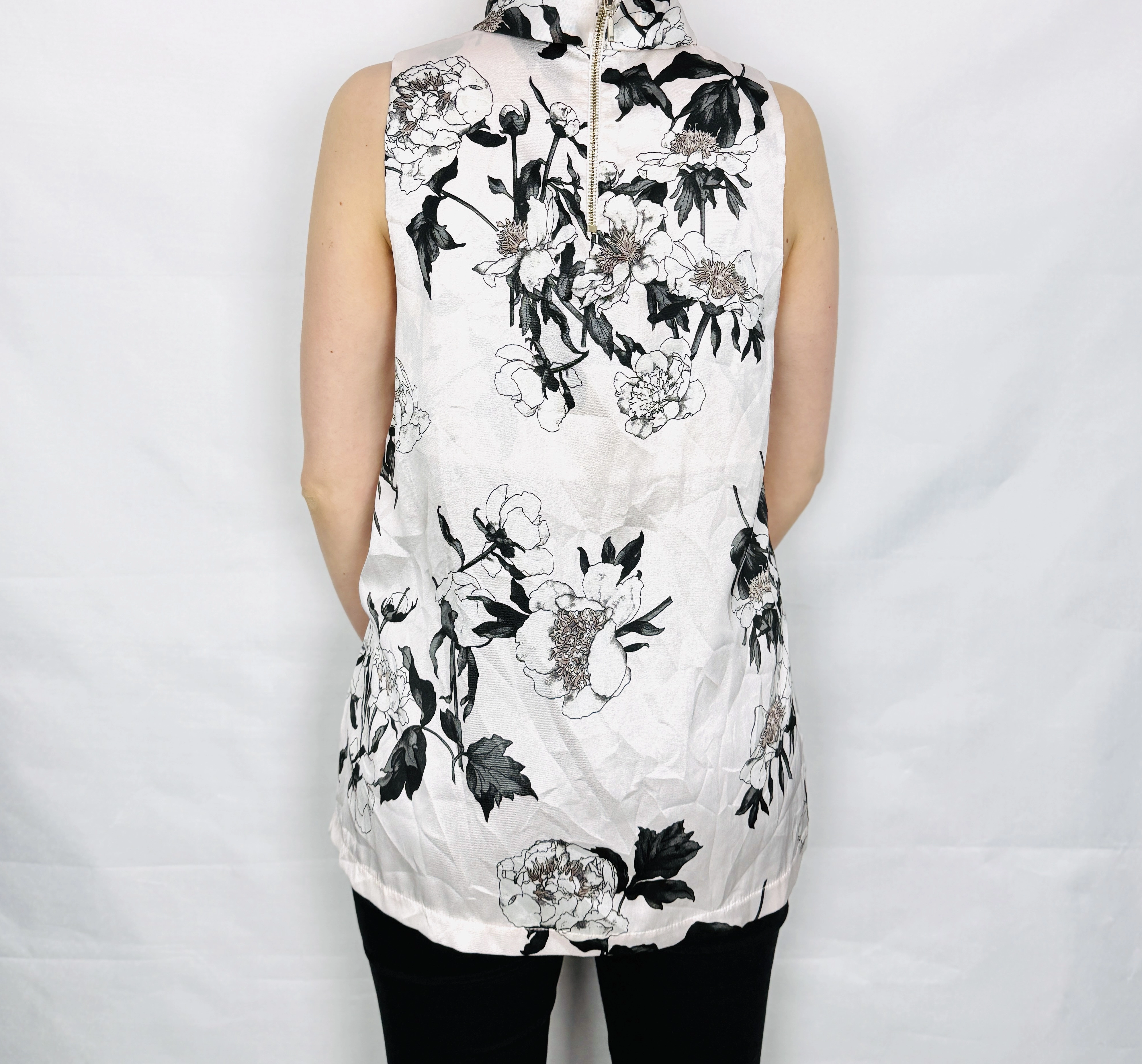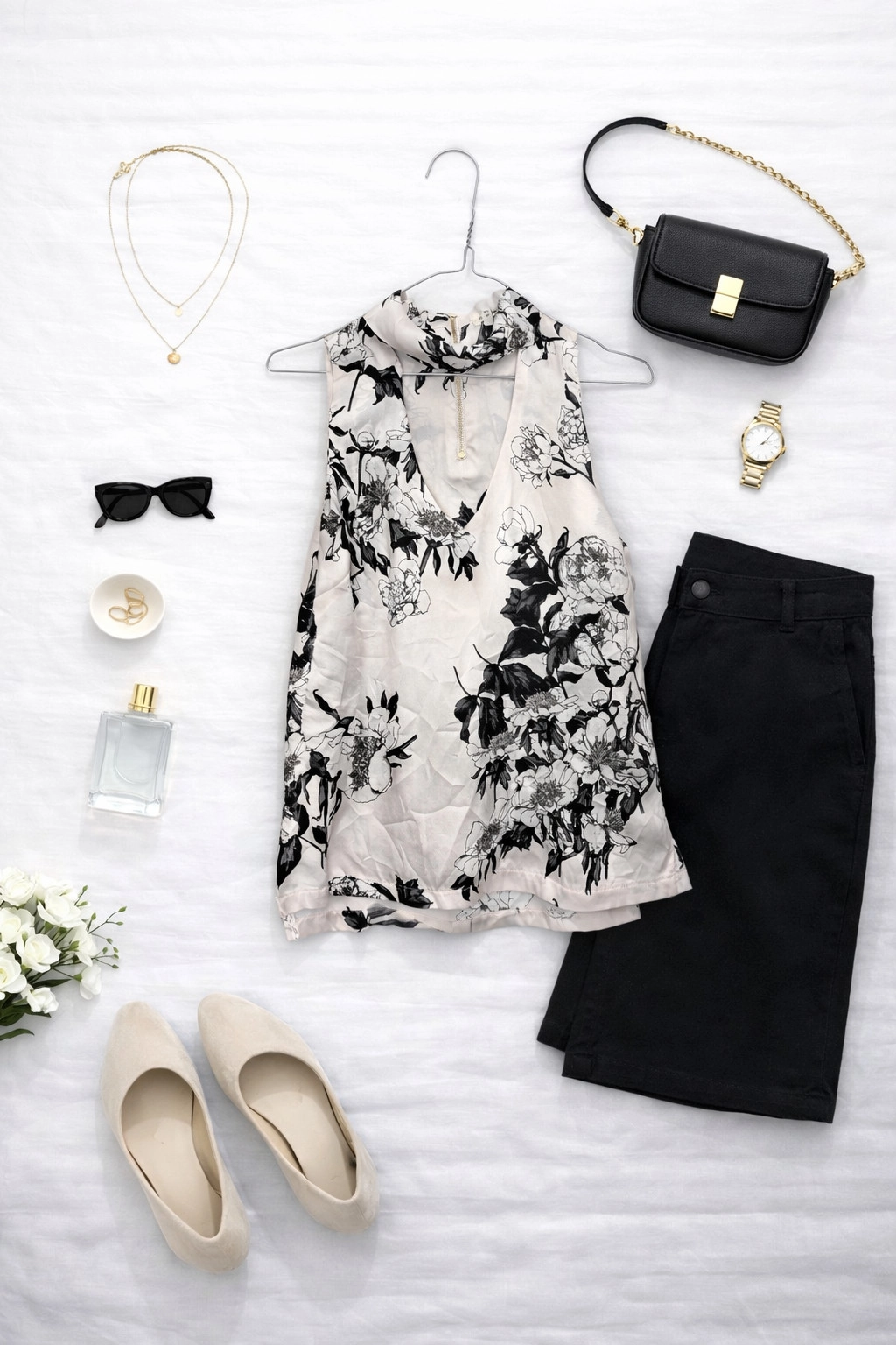 Fason bluzki opiera się na prostej, lekko luźnej linii, która swobodnie układa się na sylwetce, zapewniając komfort i subtelne podkreślenie kobiecych kształtów. Dekolt w kształcie litery V pięknie eksponuje szyję i optycznie ją wydłuża, dodając sylwetce lekkości. Wyjątkowym elementem jest szeroki pas materiału przy szyi, tworzący efekt chokera, który nadaje całości nowoczesnego, nieco zmysłowego charakteru. Bezrękawowy krój dodatkowo podkreśla linię ramion i sprawia, że bluzka prezentuje się niezwykle lekko i świeżo, szczególnie w cieplejsze dni.