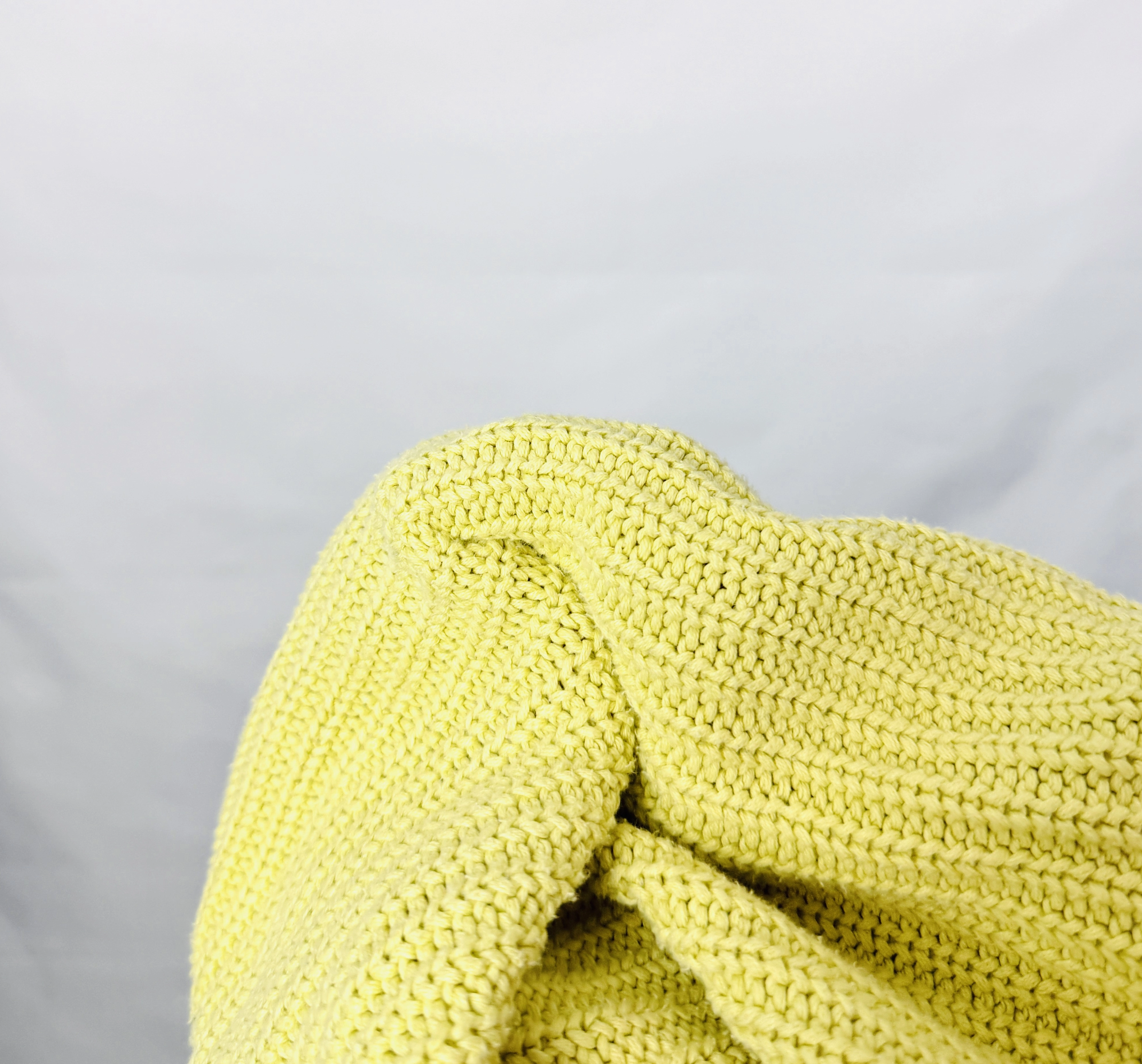 Materiał, z którego wykonano ten model, to dzianina o wyraźnym, grubym splocie, który nadaje całości trójwymiarowości i szlachetnego wyglądu. Tkanina sprawia wrażenie nieco grubszej, mięsistej i niezwykle otulającej, co czyni ją idealnym wyborem na jesienne i zimowe wieczory. Splot jest gęsty i regularny, a matowe wykończenie podkreśla czystość żółtego pigmentu. Materiał miękko układa się na sylwetce, tworząc subtelne pofalowania, które dodają konstrukcji głębi. Elastyczność dzianiny sprawia, że sweterek rewelacyjnie pracuje przy każdym ruchu, dbając o nienaganną formę i wygodę przez cały dzień.