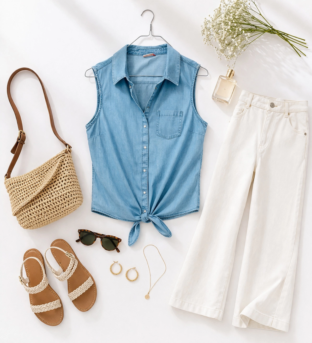 Pod względem wpływu na sylwetkę, koszula ta działa korzystnie na różne typy figur. Luźniejszy fason pozwala na maskowanie niedoskonałości w okolicach talii i brzucha, a wiązanie na dole umożliwia podkreślenie talii według indywidualnych preferencji. Brak rękawów eksponuje ramiona, co jest szczególnie korzystne dla sylwetek typu gruszka, równoważąc proporcje ciała. Jasnoniebieski odcień denimu dodaje lekkości i świeżości, a klasyczny krój sprawia, że koszula jest ponadczasowa i łatwa do stylizacji.