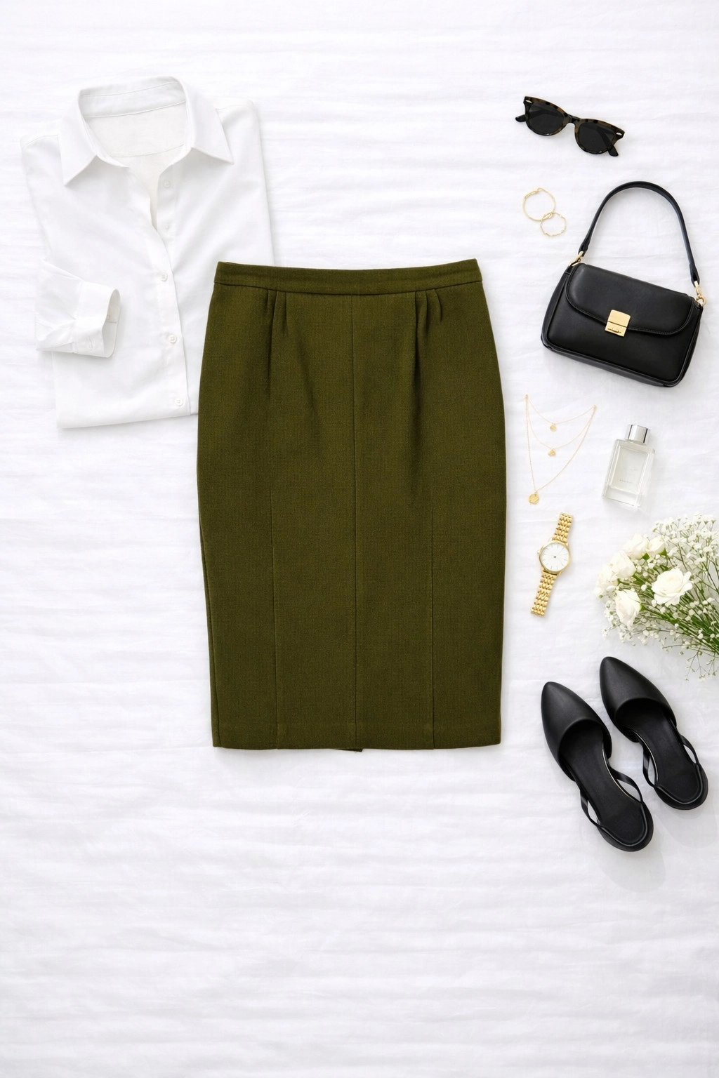 W kwestii stylizacji, ten model daje wręcz nieograniczone możliwości. Głęboka zieleń khaki fantastycznie komponuje się z bielą, kremem oraz wszelkimi odcieniami beżu, co pozwala na stworzenie świetlistego zestawu do pracy. Możesz zestawić ją z dopasowanym golfem lub zwiewną bluzką z wiązaniem pod szyją, aby uzyskać efekt nowoczesnej elegancji. Na co dzień spódnica stworzy zgrany duet z czarnym body oraz loafersami, natomiast wieczorową porą warto połączyć ją ze szpilkami w kolorze nude i złotą biżuterią, która pięknie podkreśli ciepłe tony materiału. To inwestycja, która odnajdzie się w każdej szafie kapsułowej, oferując komfort i pewność siebie w każdej sytuacji.