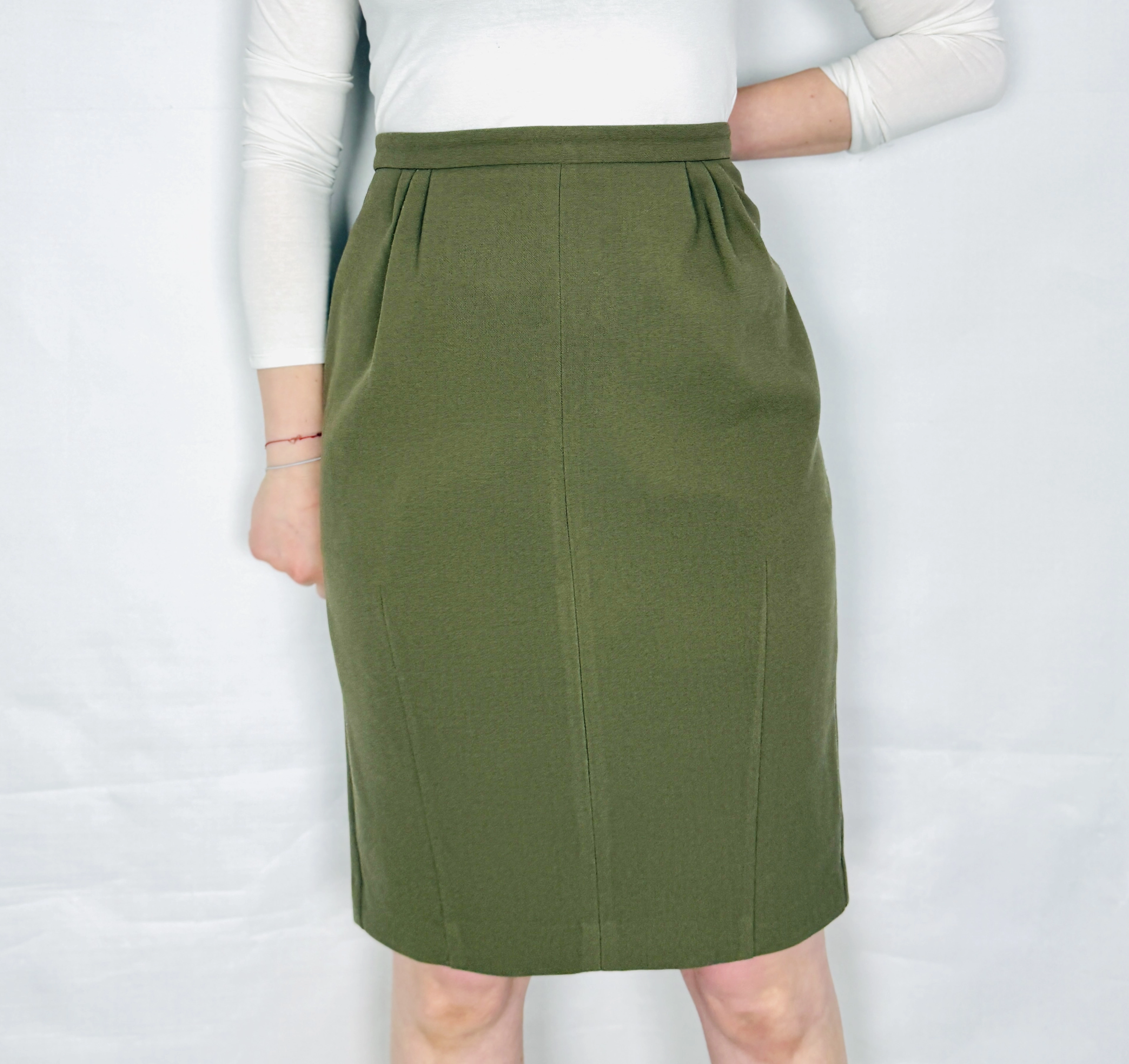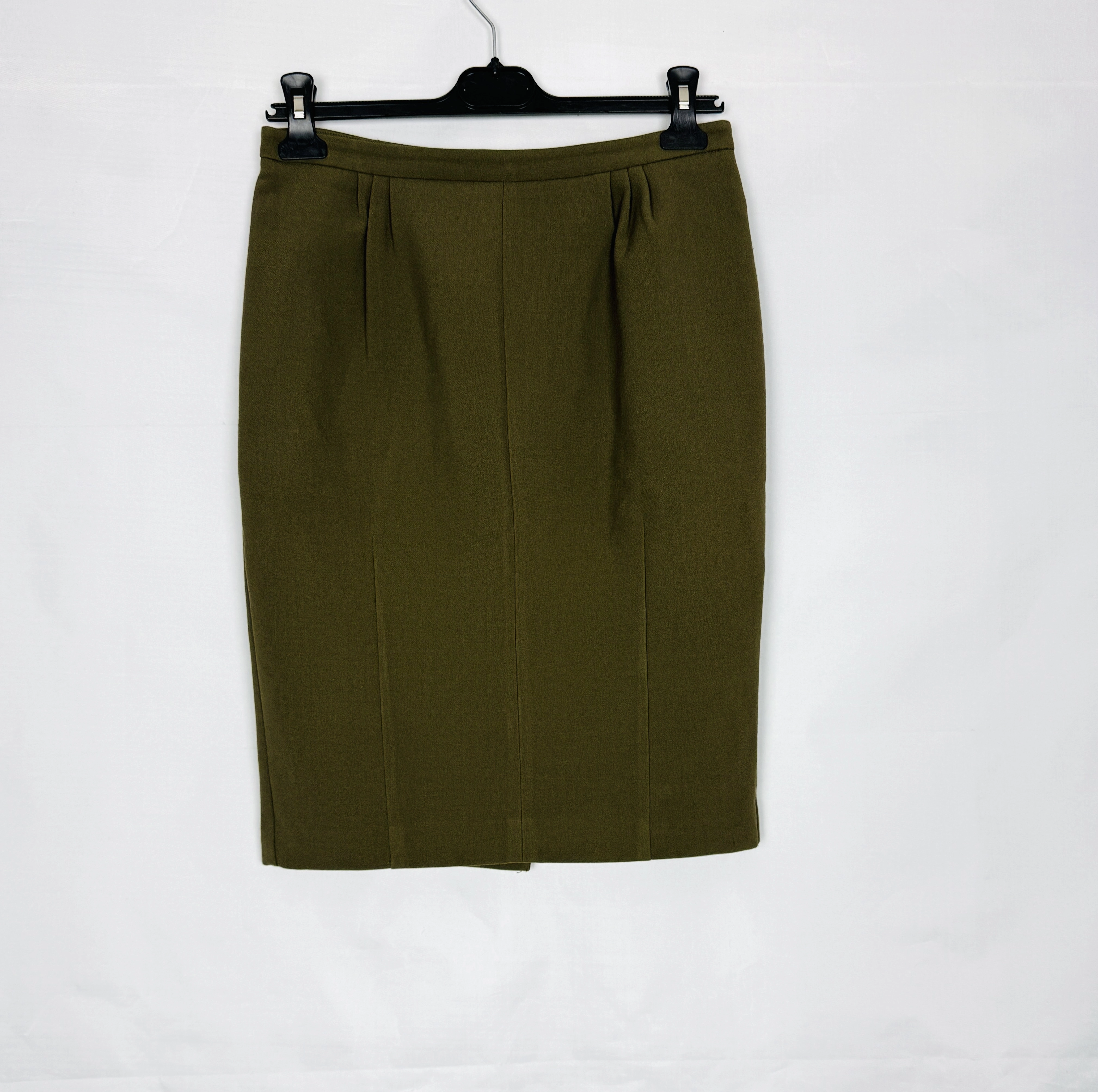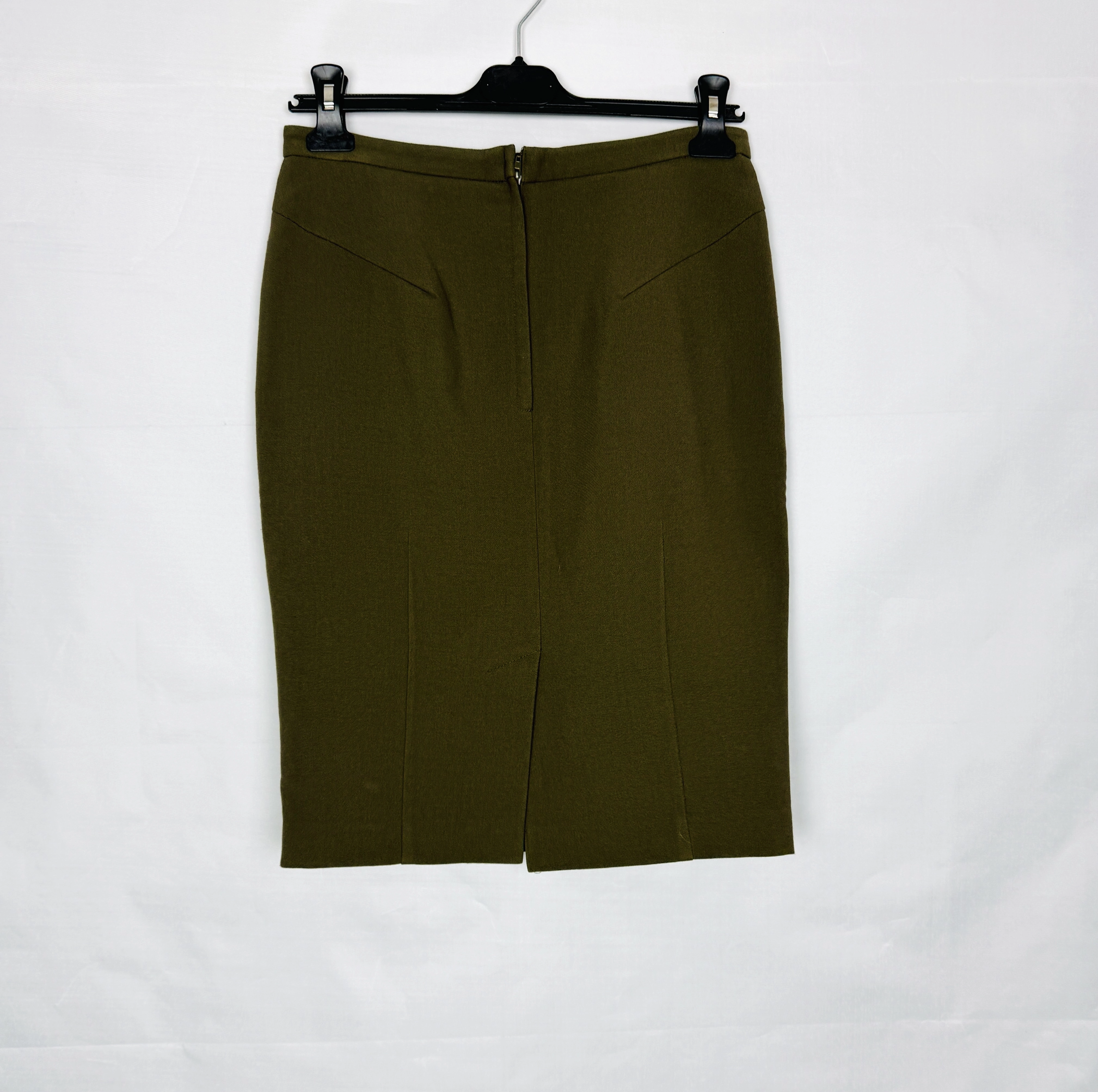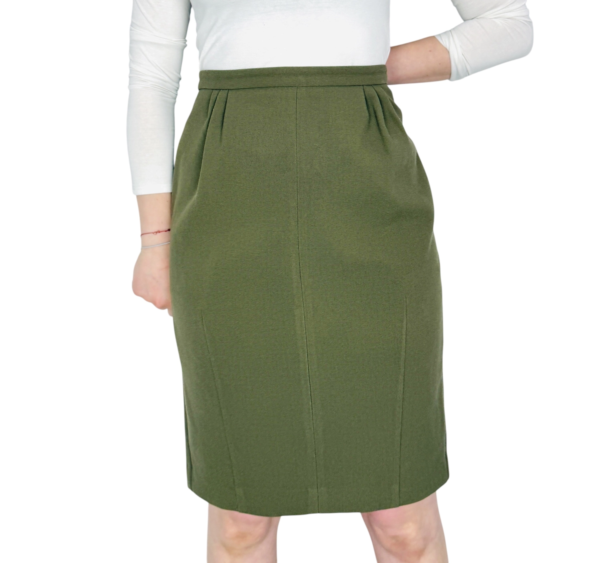 Długość sięgająca kolan nadaje całości charakteru midi, co jest rozwiązaniem niezwykle bezpiecznym i stylowym zarazem, zwłaszcza w kontekście mody biurowej. Prosta linia dołu została przełamana precyzyjnymi przeszyciami biegnącymi pionowo, co dodatkowo wysmukla dolną partię ciała i nadaje ubraniu nowoczesnego sznytu. Spódnica układa się w sposób zdyscyplinowany, a jej nieco sztywniejsza faktura gwarantuje, że przez cały dzień będziesz wyglądać nienagannie i schludnie. Brak zbędnych zdobień sprawia, że na pierwszy plan wysuwa się jakość wykonania oraz piękny, oliwkowy odcień zieleni.