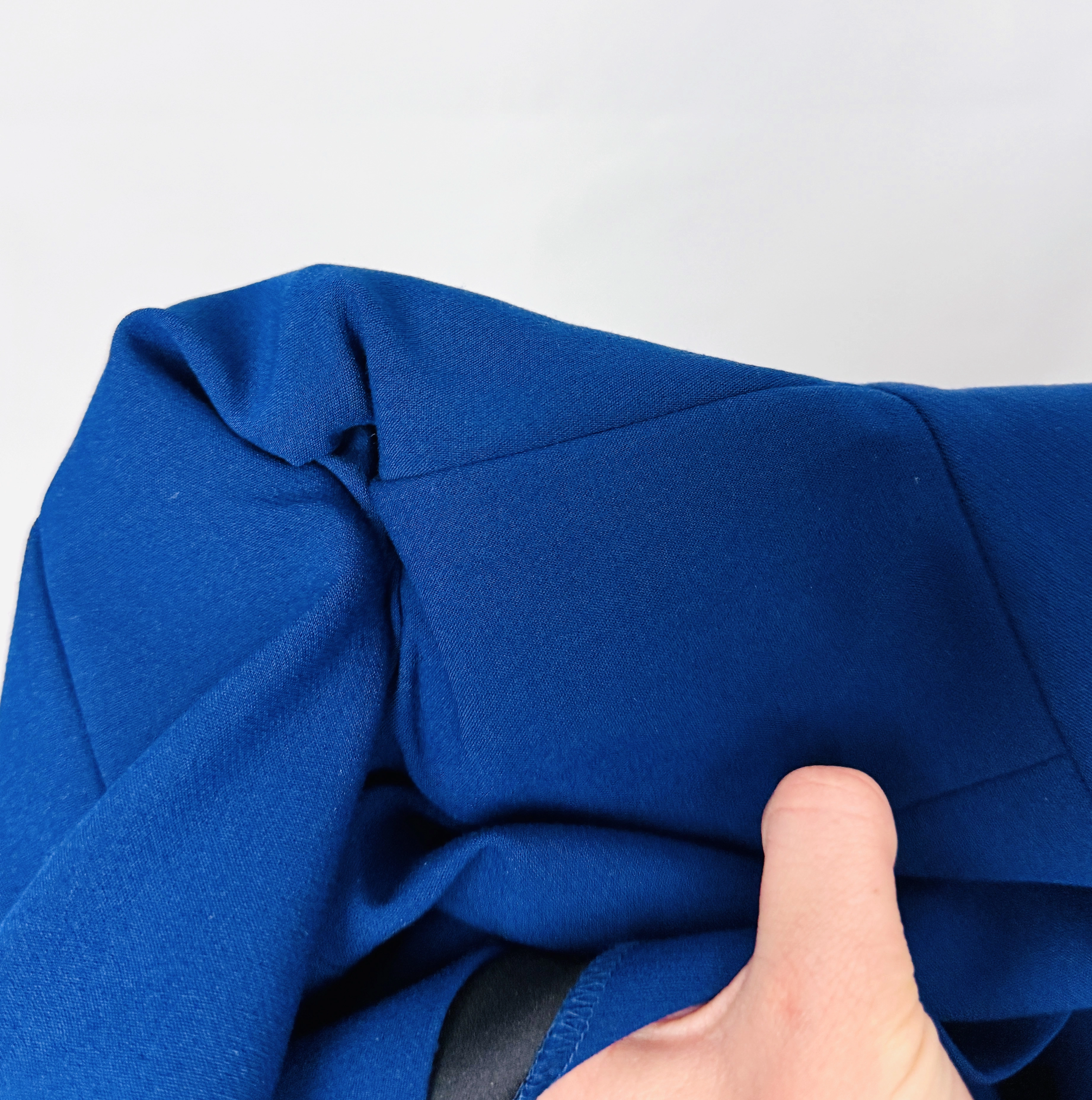 Materiał sprawia wrażenie gładkiego, miękko układającego się i przyjemnego w dotyku. Tkanina wygląda na delikatnie elastyczną, dzięki czemu dobrze dopasowuje się do sylwetki, zachowując przy tym swój kształt. Całość prezentuje się schludnie i stylowo, zarówno w ruchu, jak i w bardziej statycznych stylizacjach.