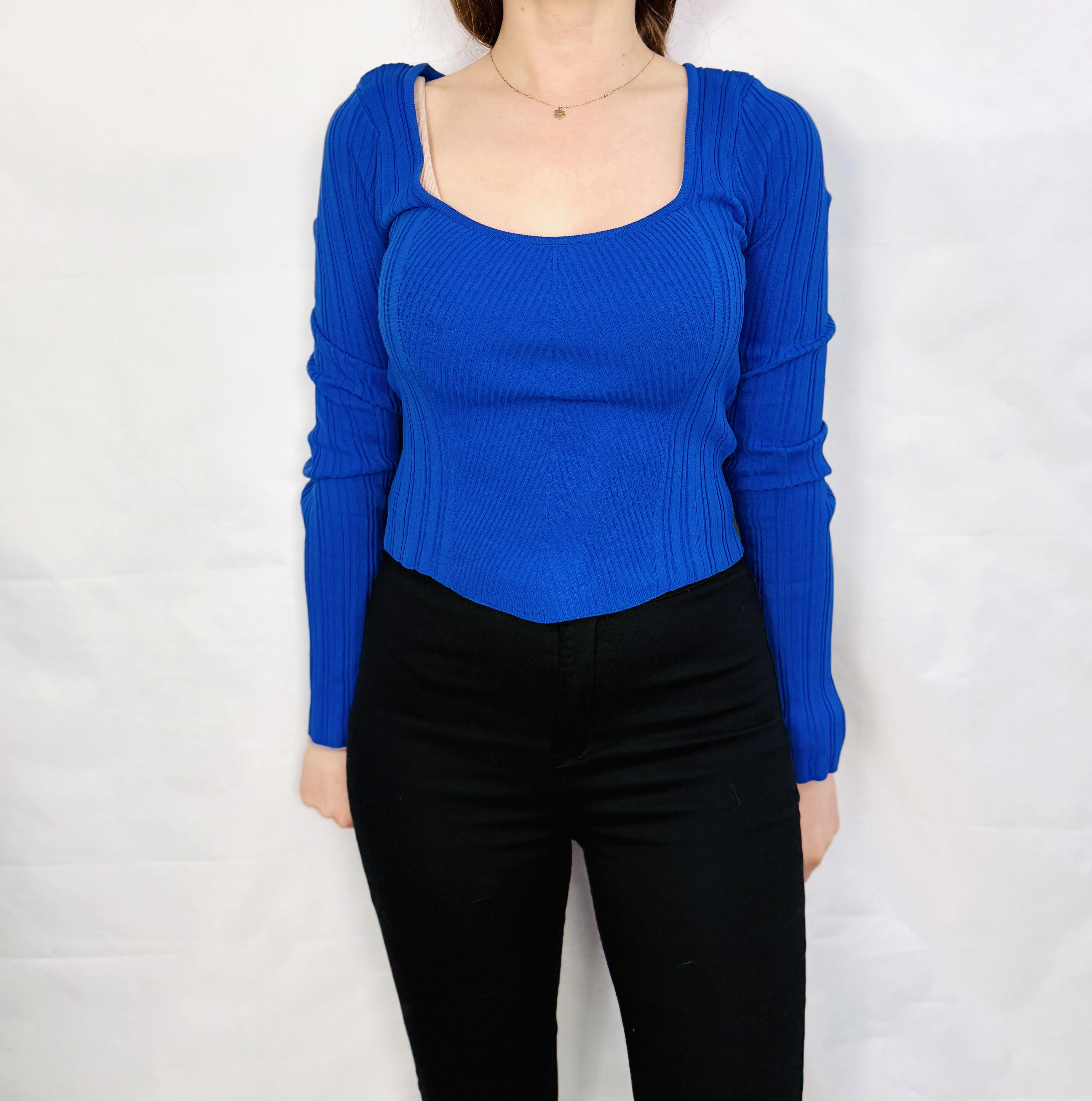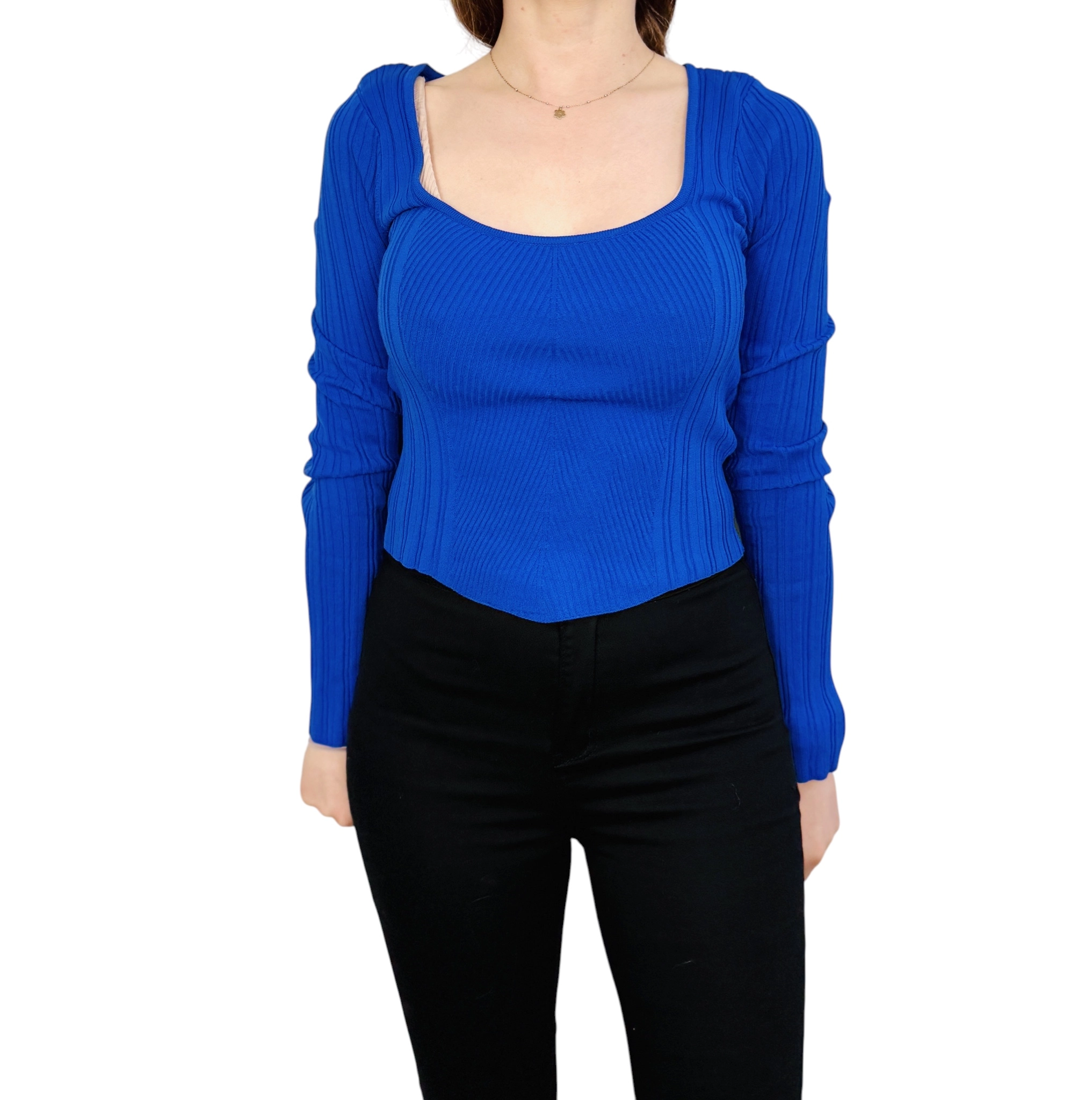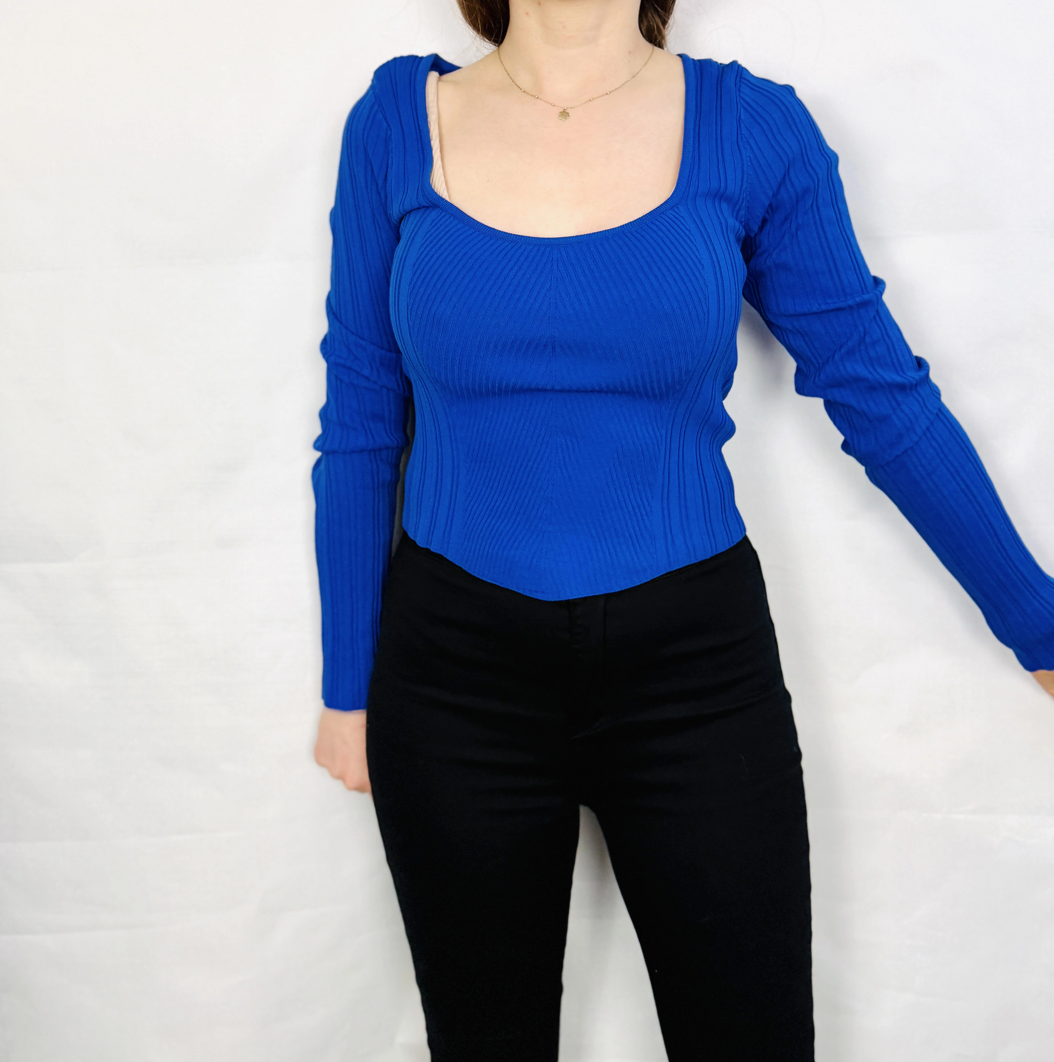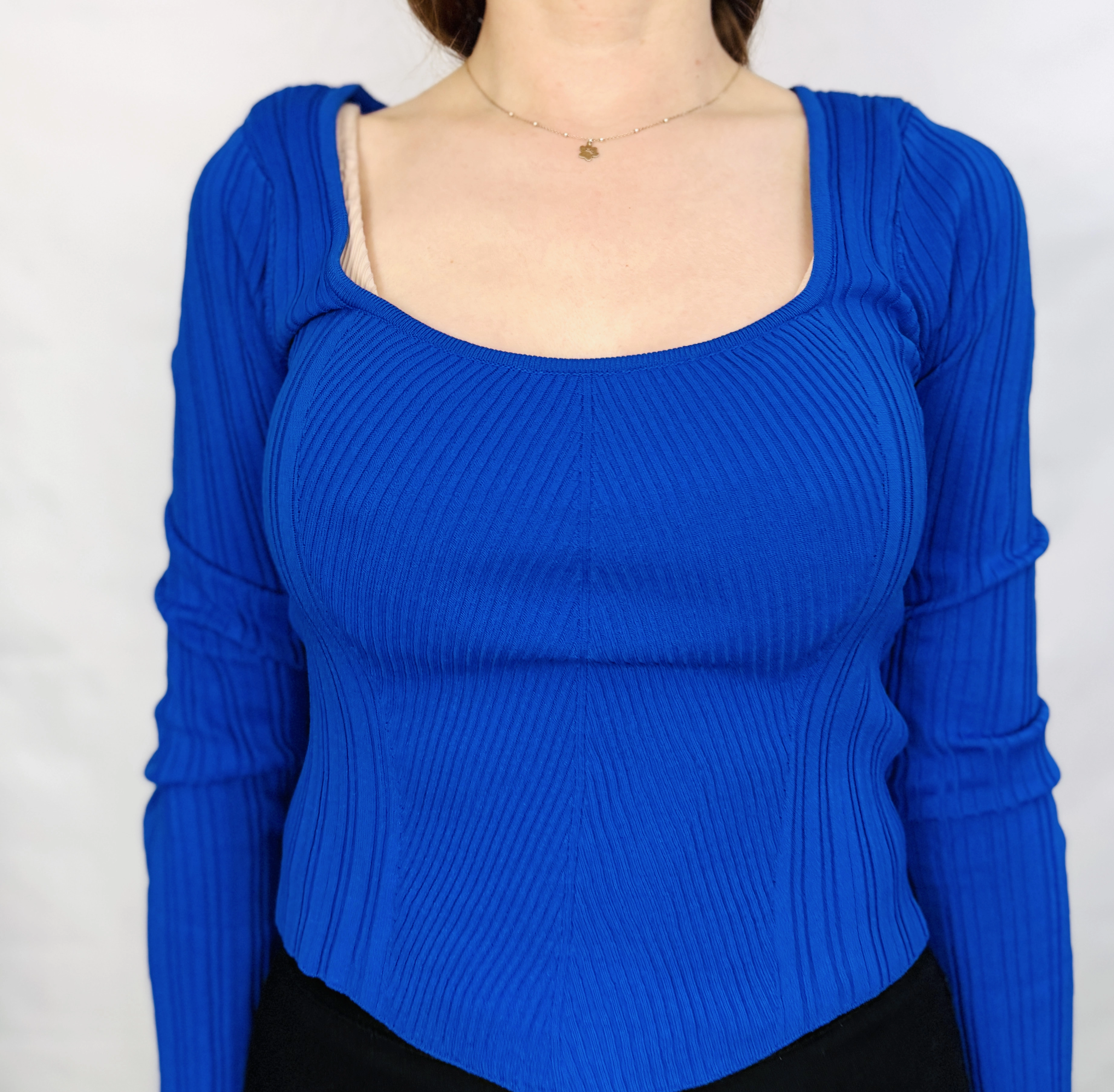 To kobiecy i nowoczesny top, który łączy prostotę z wyraźnym, modowym akcentem. Intensywny kobalt nadaje mu świeżości i siły wyrazu, a prążkowana struktura tkaniny podkreśla elegancki, a zarazem młodzieńczy charakter. Całość emanuje pewnością siebie i lekkością, tworząc propozycję idealną dla tych, które chcą subtelnie podkreślić dekolt i talię, nie rezygnując z komfortu.