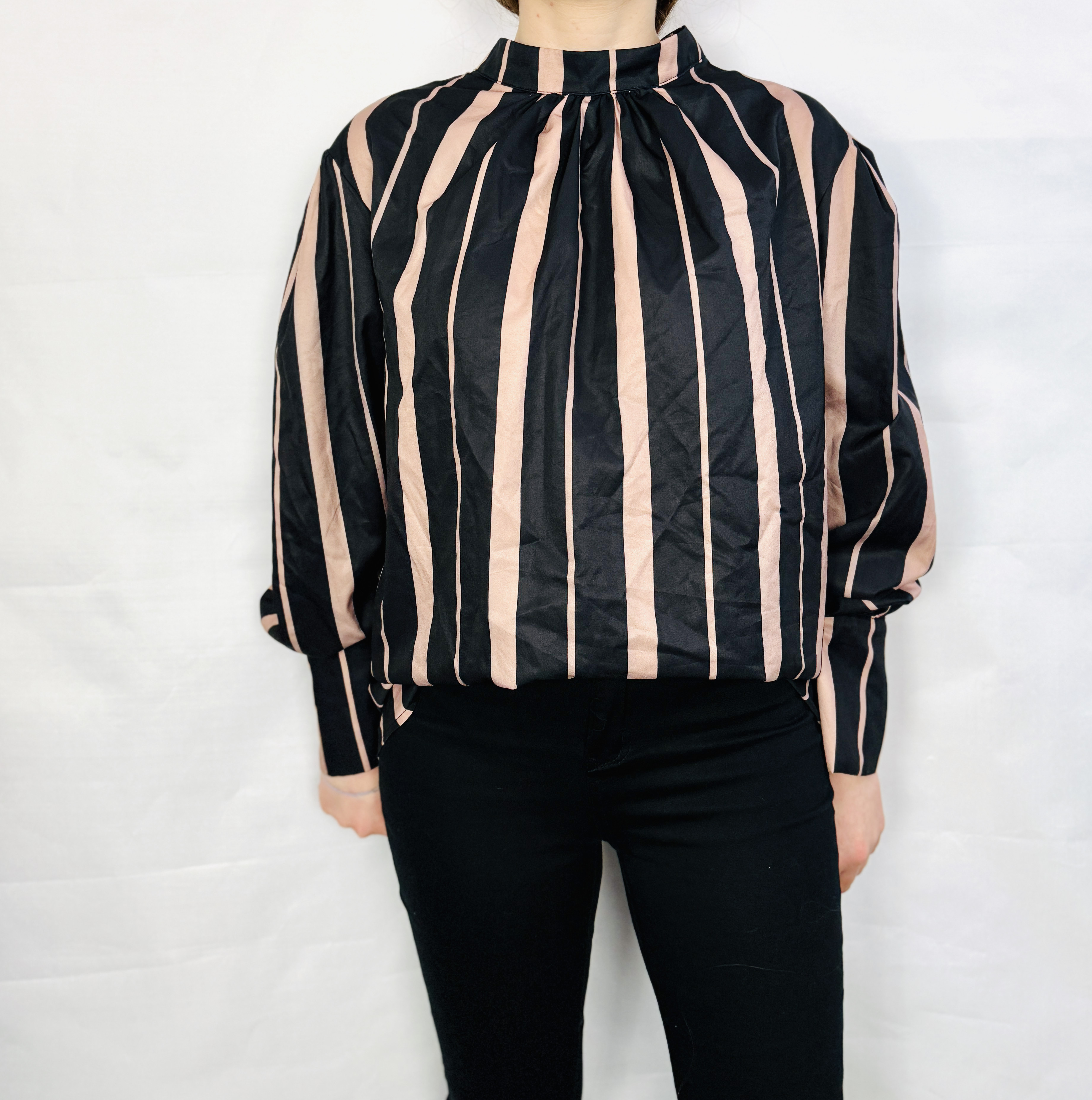 Krój bluzki jest luźniejszy, o prostej, pudełkowej linii, która miękko opada od ramion i kończy się na wysokości bioder. Stójka tworzy schludny, nieco formalny detal, a zebrane przy niej fałdki subtelnie dodają objętości w górnej partii i ładnie modelują linię ramion. Rękawy są długie i lekko bufiaste, z wyraźniejszym wykończeniem w postaci wąskich mankietów, które zbierają materiał przy nadgarstkach i nadają sylwetce lekkości oraz finezji.