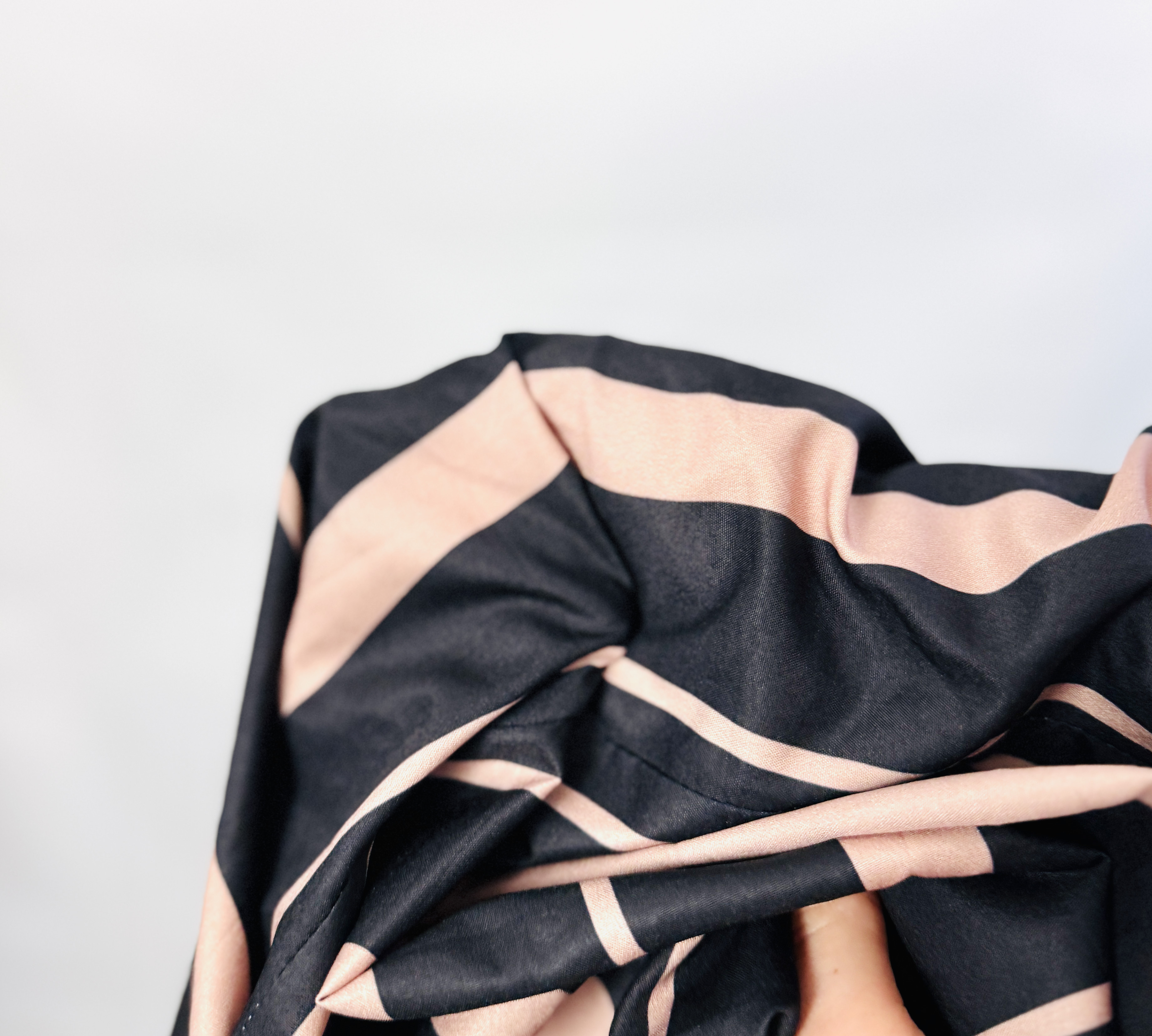Pionowe paski są równomierne i wyraziste, kreując graficzny kontrast, który optycznie wydłuża sylwetkę i wysmukla tułów. Materiał ma gładkie, delikatnie połyskujące wykończenie, które podkreśla formalny charakter koszuli, jednocześnie nie odejmując jej lekkości. Tkanina wygląda na taką, która delikatnie strukturują formę, dzięki czemu bluzka zachowuje kształt i charakter nawet przy luźniejszym kroju.