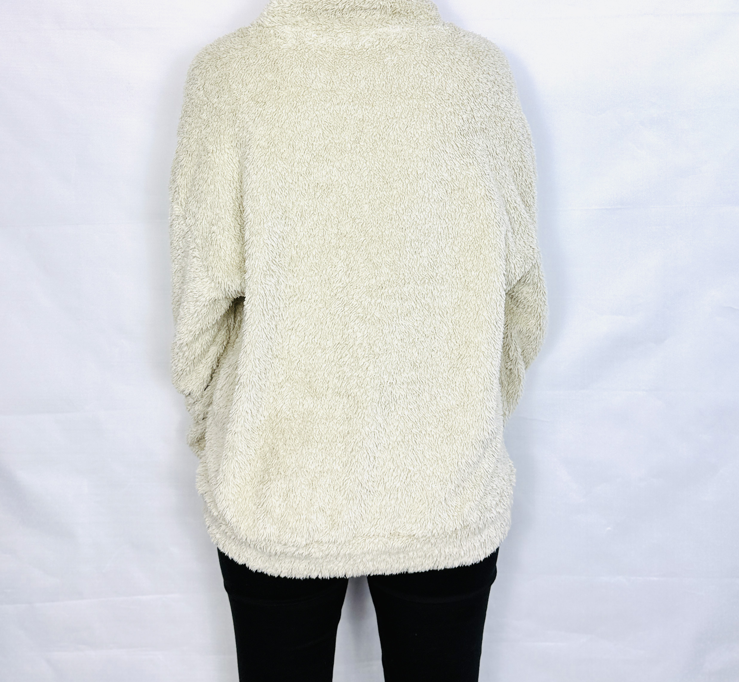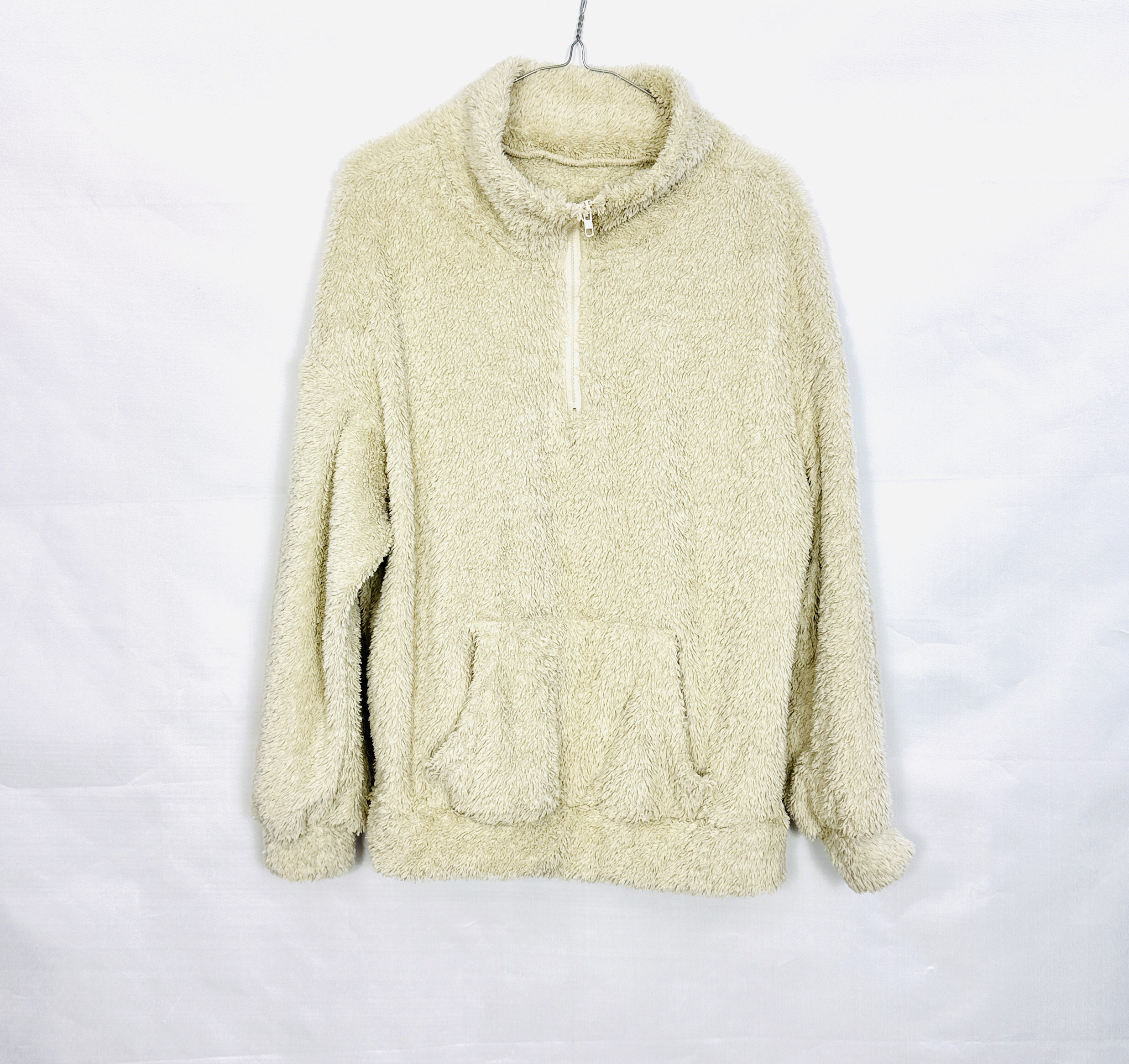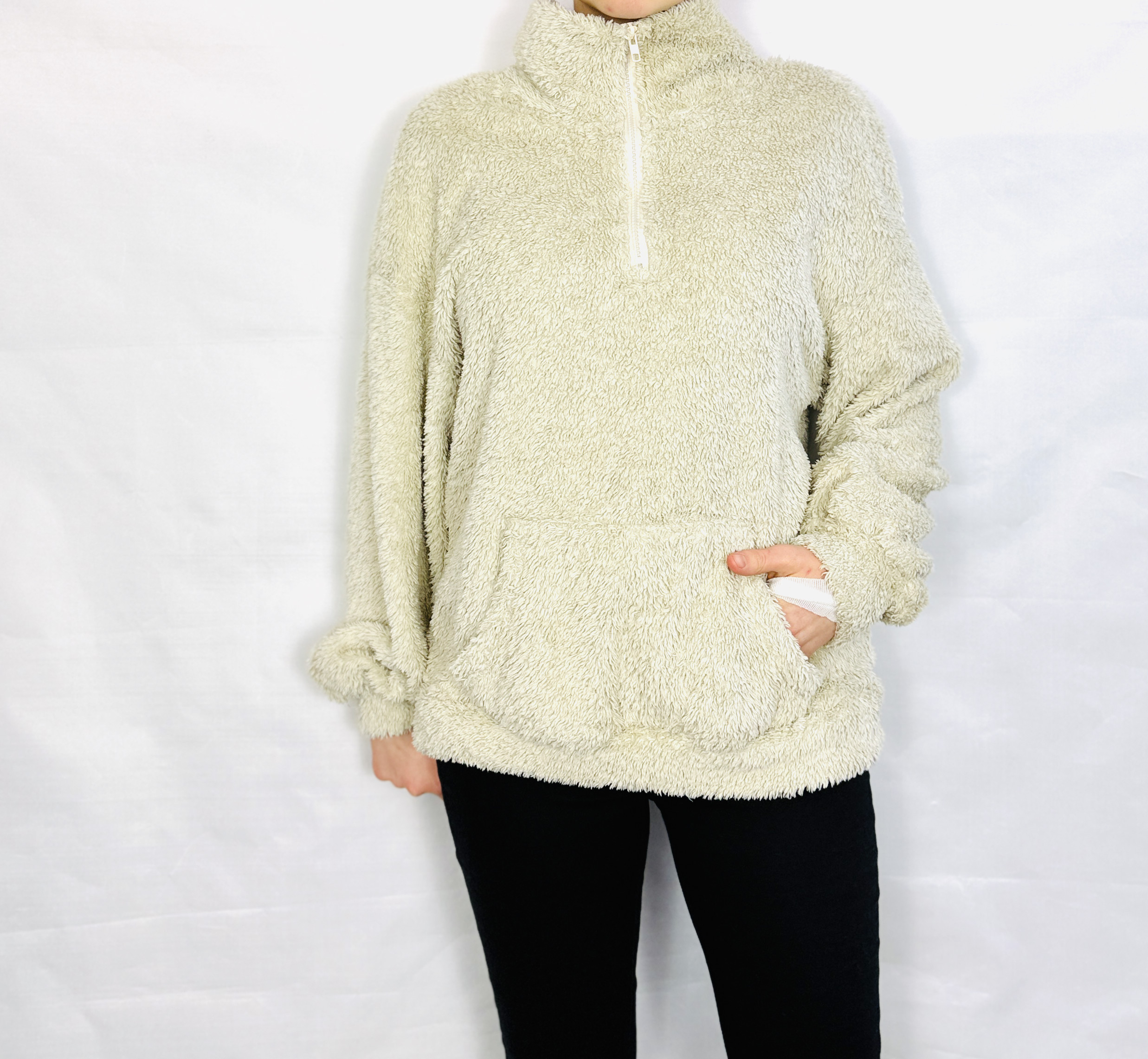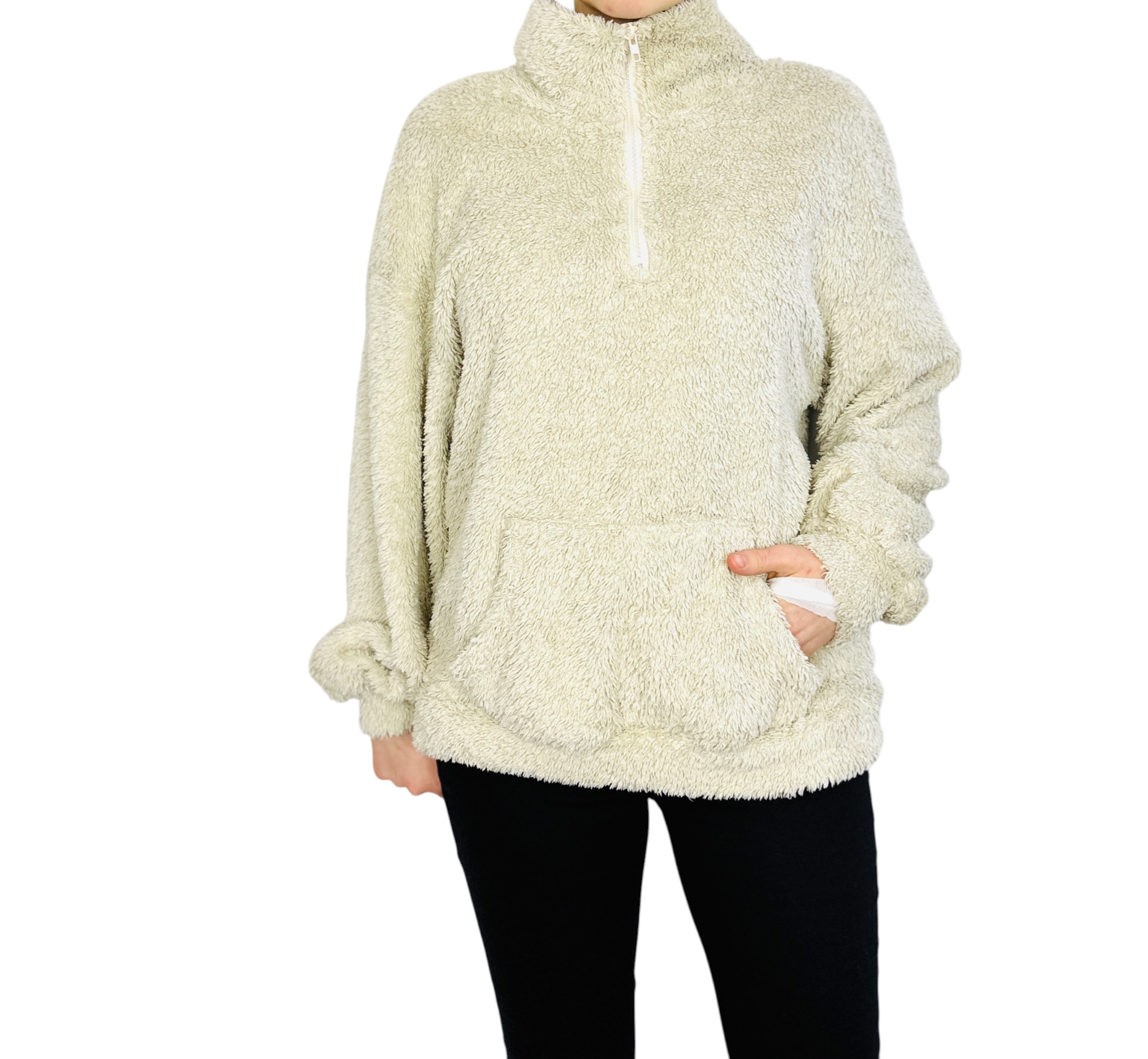 Krój bluzy jest wyraźnie luźny i oversize, sięgający bioder, co daje swobodę ruchu i efekt otulenia. Charakterystyczny półgolf podnosi komfort i dodaje struktury przy szyi, a w centralnej części przodu widoczny jest krótki suwak, pozwalający na regulację linii dekoltu i wprowadzenie dyskretnego akcentu praktycznego. Rękawy są długie i obficie ułożone, z lekko ściśniętymi zakończeniami, które tworzą miękkie fale materiału przy nadgarstkach, natomiast przód zdobi kieszeń typu kangurka — praktyczny element, który jednocześnie wzmacnia casualowy charakter modelu.