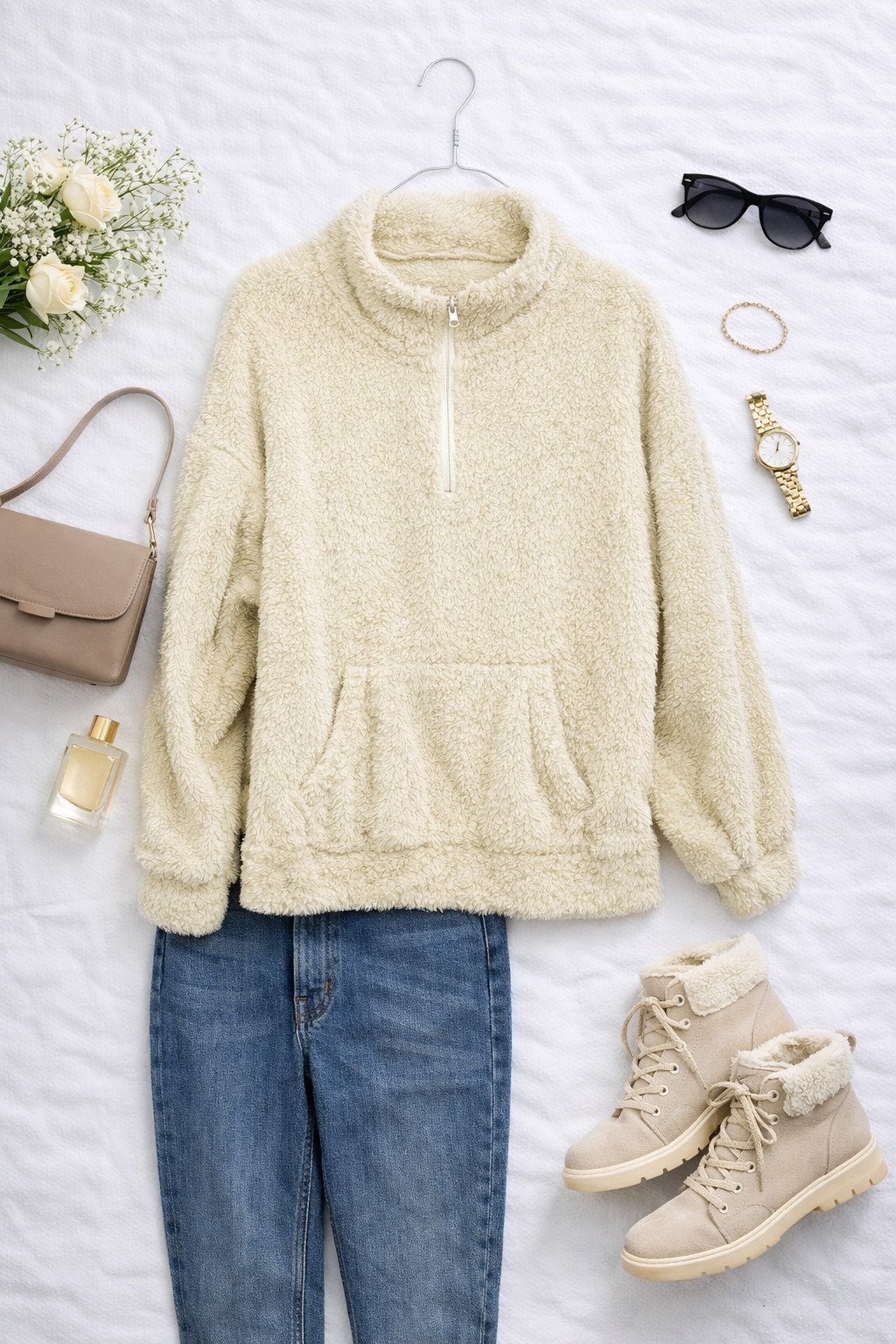 W stylizacjach bluza jest bardzo uniwersalna — świetna na szybkie wyjścia i na domowy chill: połącz ją z ulubionymi legginsami i grubymi skarpetami lub z wąskimi jeansami i sneakersami dla miejskiego luzu. Do pracy w mniej formalnym środowisku zestaw z prostymi spodniami i spokojnymi dodatkami, a na weekendowe wypady noś ją z parką lub długim płaszczem, który doda kontrastu teksturze. Kremowy kolor pięknie komponuje się z grafitem, butelkową zielenią, ciepłym brązem czy denimem, dając mnóstwo pomysłów na warstwowanie i codzienne, przytulne stylizacje.