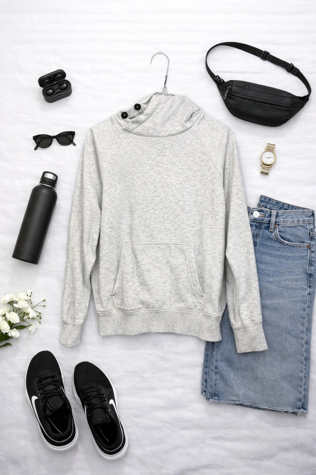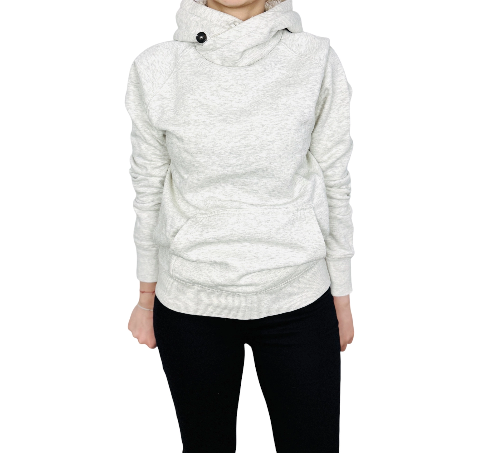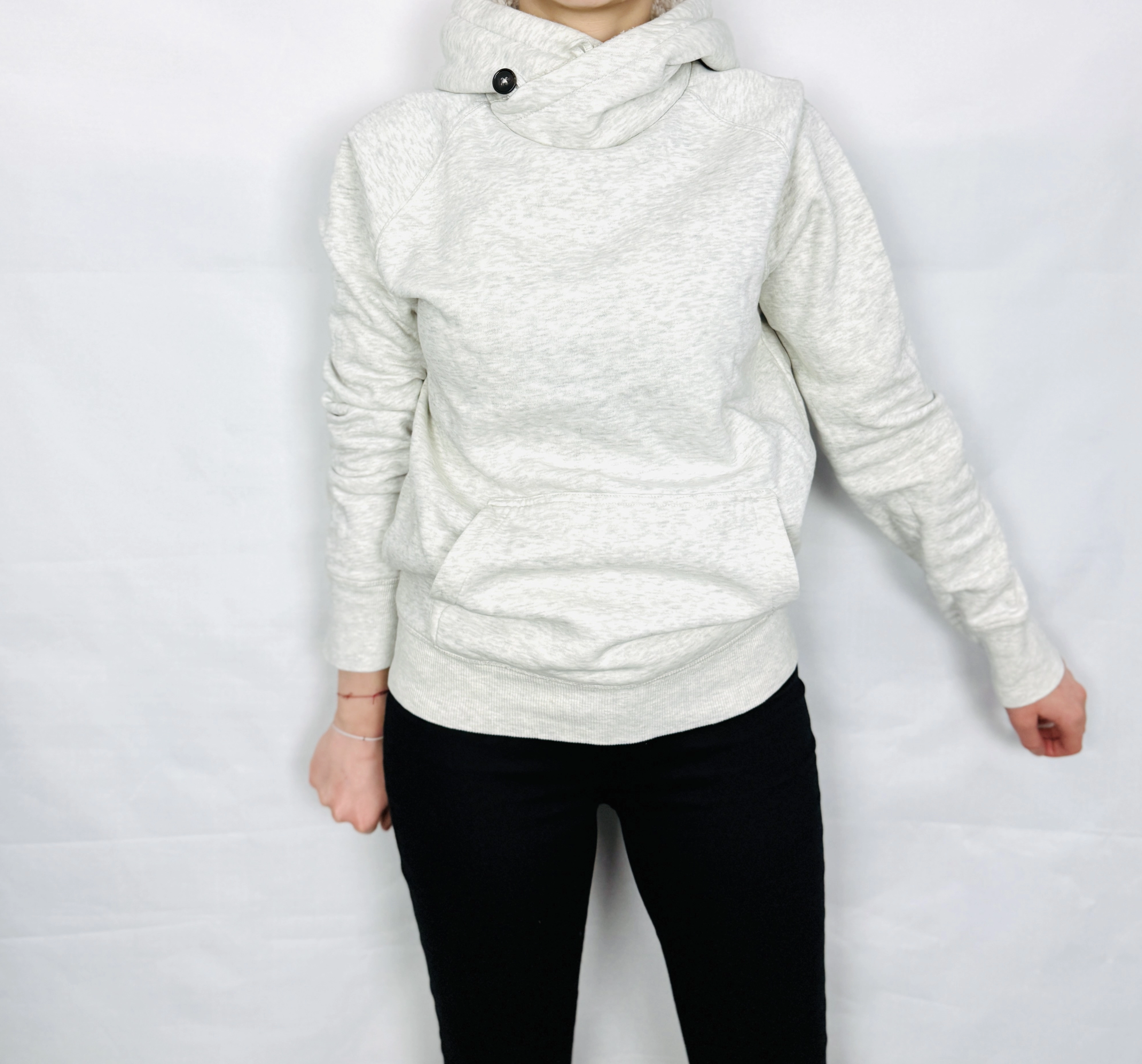Krój z reglanowymi ramionami i wysokim kołnierzem wspaniale wpływa na proporcje sylwetki, oferując wizualne wysmuklenie górnych partii ciała. Brak wyraźnego odcięcia na ramionach łagodzi linię barków, co jest szczególnie korzystne dla kobiet o sylwetce typu odwrócony trójkąt, natomiast objętość kaptura i komina dodaje nastrojowej harmonii całej figurze. Ściągacz u dołu pozwala na estetyczne ułożenie bluzy na biodrach, co pomaga w podkreśleniu kobiecych kształtów przy zachowaniu maksymalnej wygody. To uniwersalna propozycja, która wspiera naturalny wdzięk, nadając sylwetce zgrabny i nowoczesny wygląd.