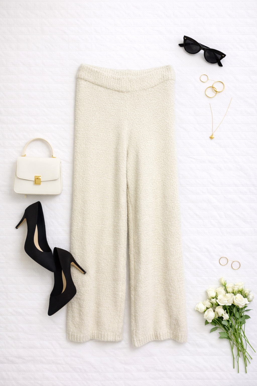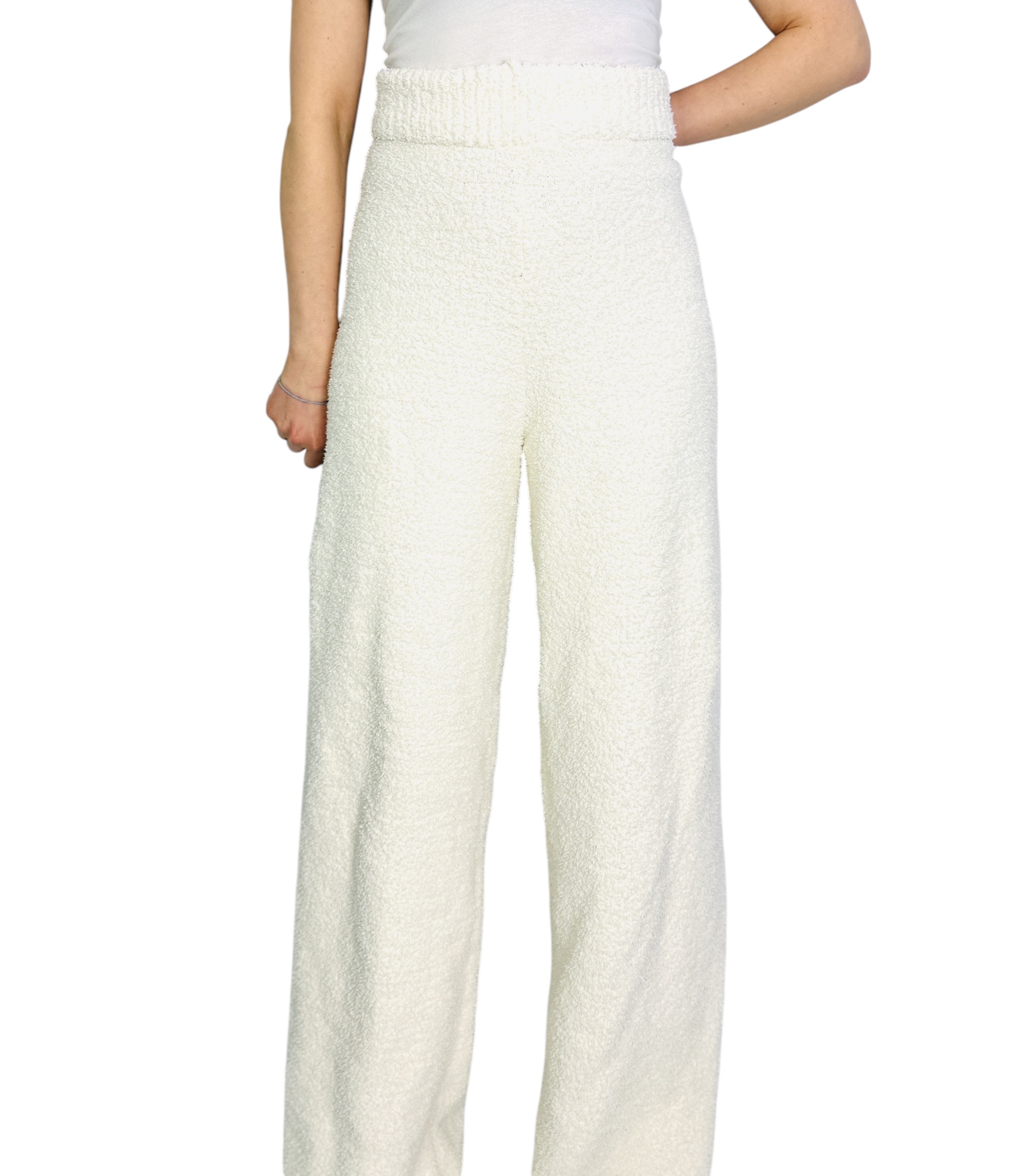 Te spodnie to kwintesencja przytulnej elegancji — kremowy odcień i miękka, puchata faktura tworzą razem nastrojowy, kobiecy charakter, który zaprasza do relaksu, a jednocześnie prezentuje się wyjątkowo szykownie. Ich forma ma w sobie coś z domowego komfortu przeniesionego do codziennej garderoby: ciepły, otulający wygląd łączy się tu z uporządkowaną, spokojną linią, dzięki czemu model ten zyskuje uniwersalny charakter — od komfortowego stroju weekendowego po bardziej dopracowane zestawienia na spotkanie.