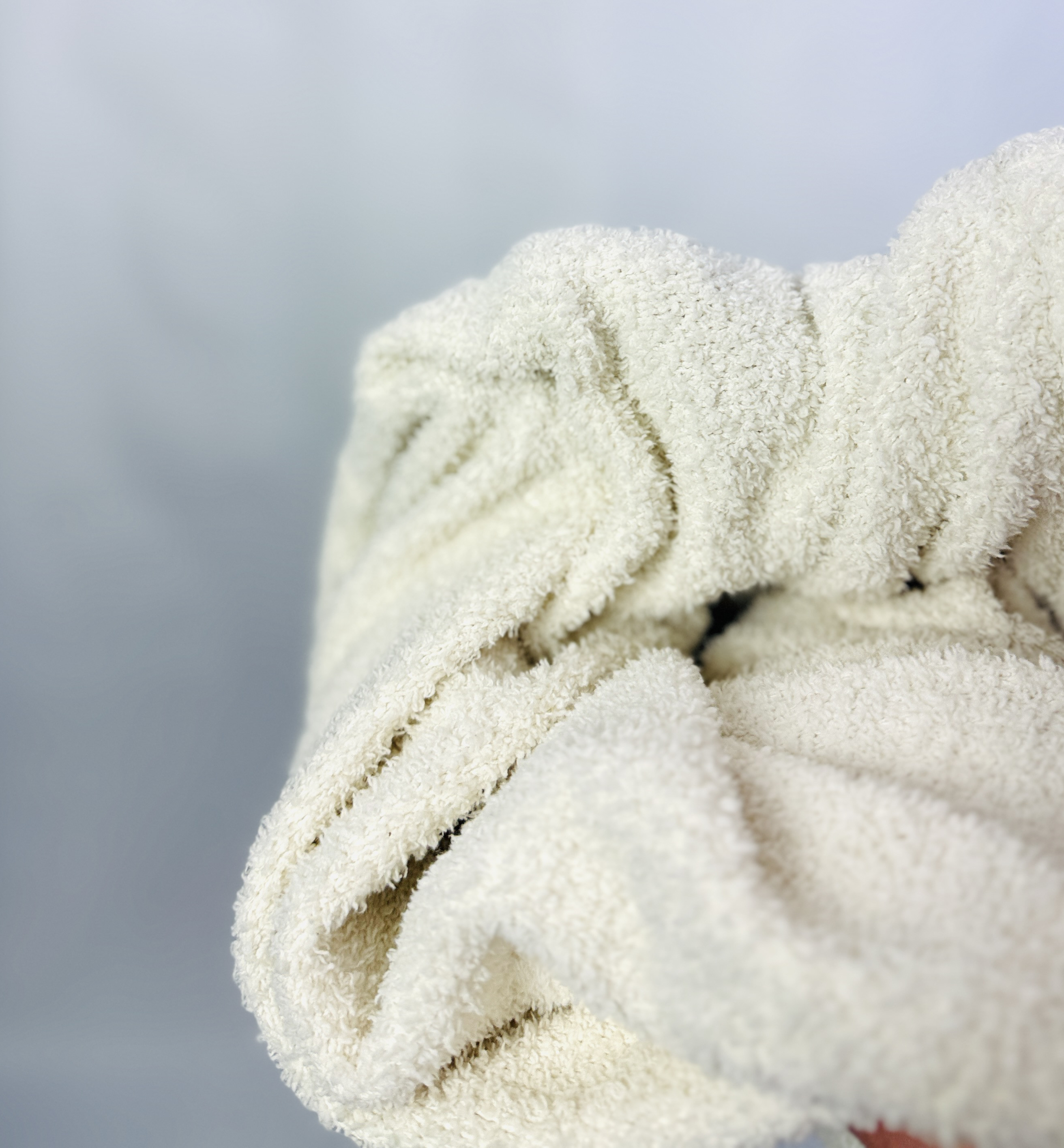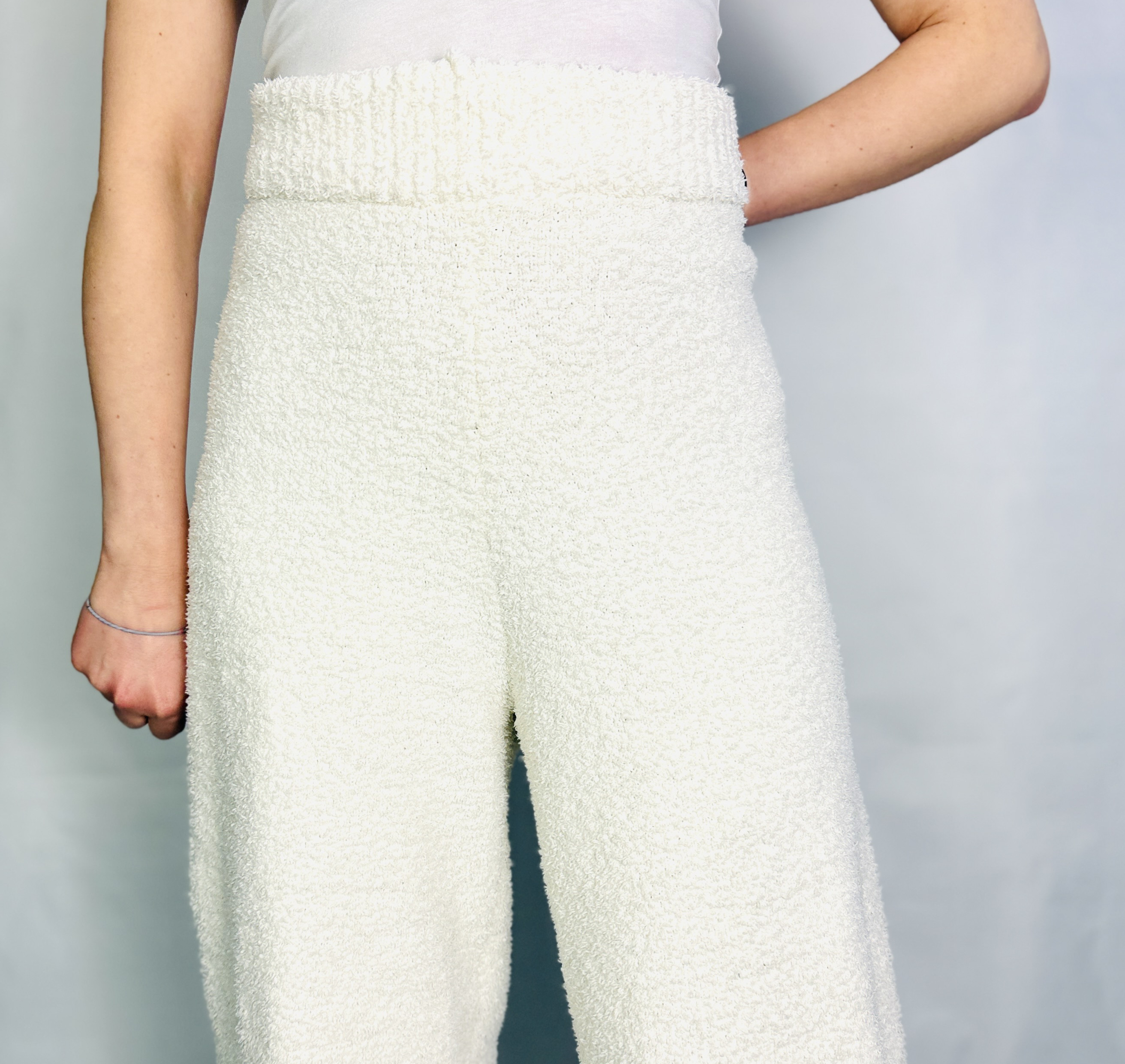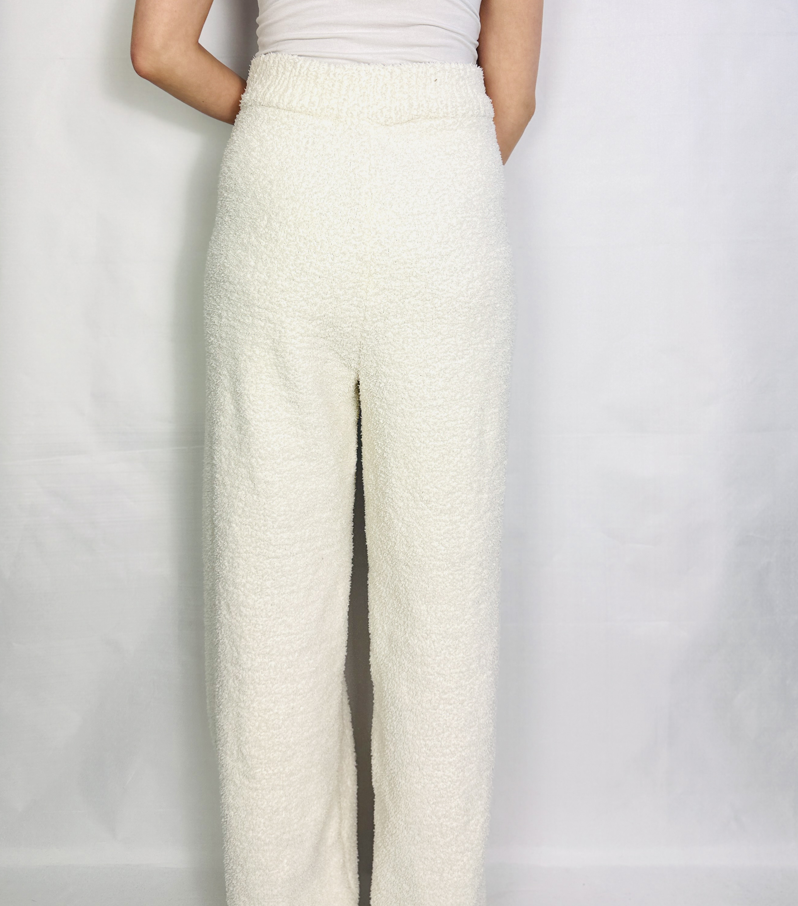 Materiał prezentuje się jako nieco grubszy i otulający, miękko układający się przy ruchu, o wyraźnie puchatej, miłej w dotyku strukturze. Taka faktura dodaje ubraniu przytulności i wizualnej miękkości, a jednocześnie trzyma formę, co sprawia, że spodnie nie puszczają niechcianych fałd, lecz subtelnie modelują sylwetkę. Efekt wizualny jest lekko lejący, jednak zdecydowanie bardziej otulający niż sztywny, co wpływa na komfort noszenia i daje poczucie ciepła.