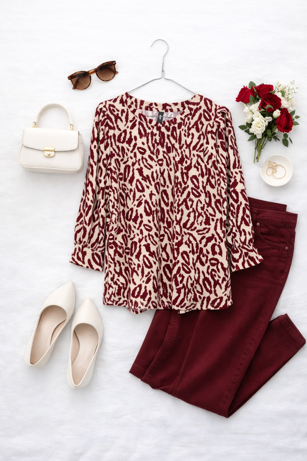 W stylizacjach bluzka jest bardzo uniwersalna: zestaw z dopasowanymi jeansami i mokasynami lub sneakersami dla miejskiego, swobodnego efektu; do pracy noś ją z prostymi cygaretkami i klasycznymi loafersami lub subtelną marynarką, by zrównoważyć wzór bardziej uporządkowanymi formami; na wieczór połącz z ołówkową spódnicą lub eleganckimi spodniami i obcasami, aby podkreślić kobiecy szyk. Krem i bordo świetnie komponują się z czernią, beżem i camel, a także z akcentami w kolorze butelkowej zieleni czy granatu — to zestawienie daje dużo przestrzeni do tworzenia zarówno stonowanych, jak i bardziej wyrazistych kompozycji.