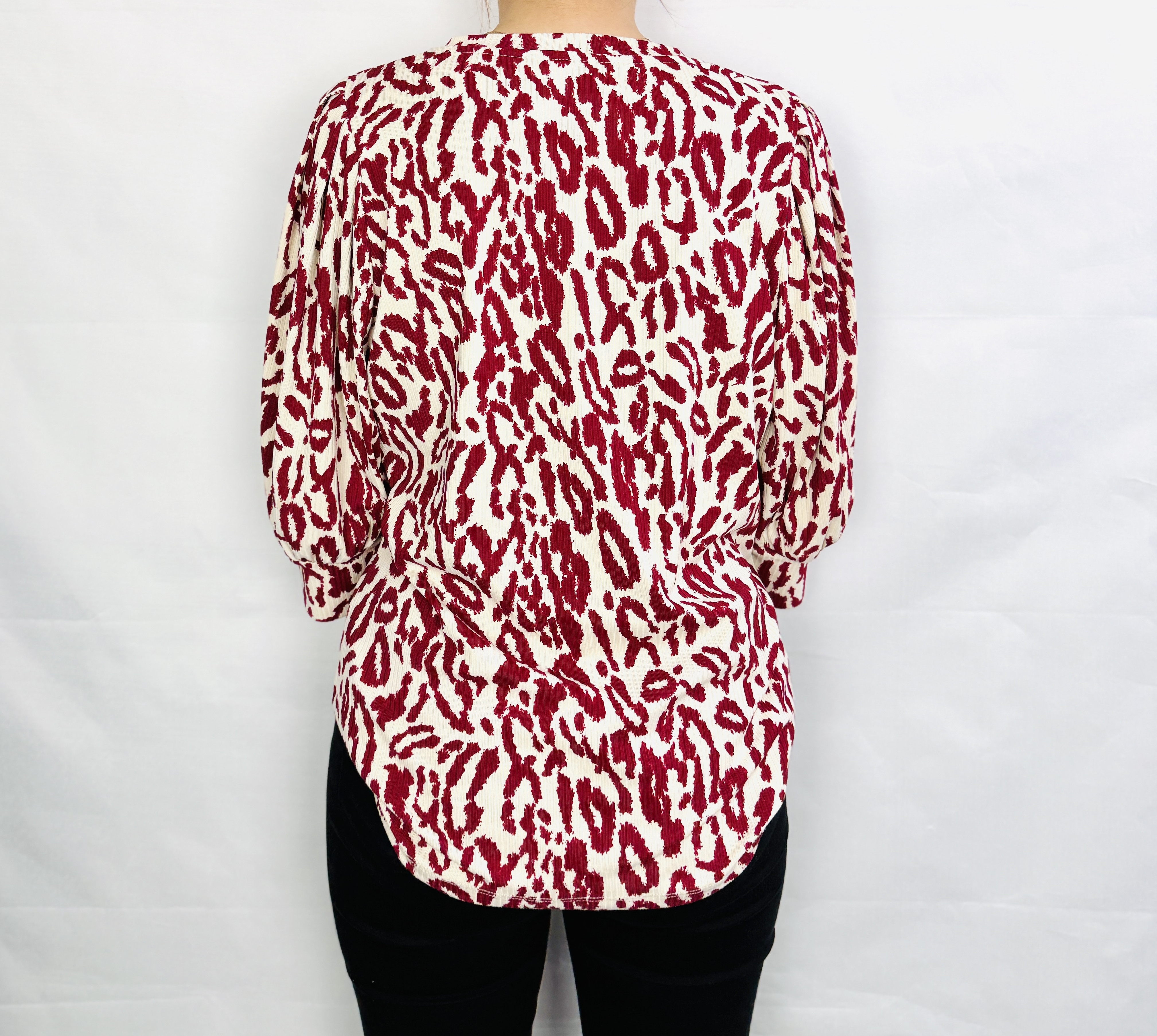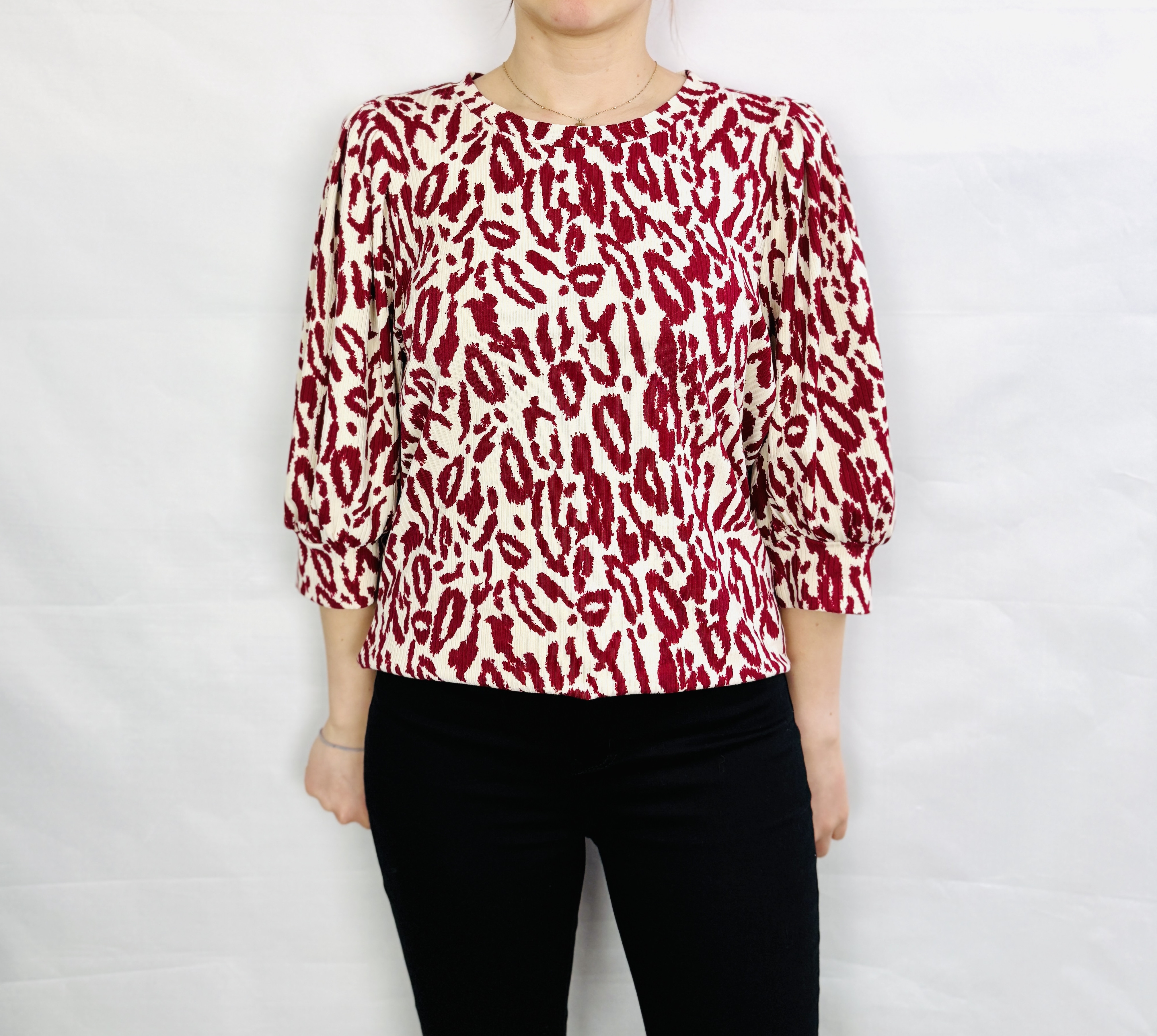 Wzór to nieregularne, zwierzęce motywy w bordowym odcieniu na kremowym tle, ułożone swobodnie, tak że powierzchnia tkaniny zyskuje żywy, nieformalny rytm. Materiał prezentuje się jako miękko układający się i delikatnie lejący, z subtelną fakturą podkreślającą wzór — tkanina tworzy przyjemne fałdki i delikatne załamania przy ruchu, co potęguje wrażenie naturalnej elegancji. Wykończenia mankietów i rękawów są staranne, a całość zachowuje lekkość nawet przy wyrazistym deseniu.