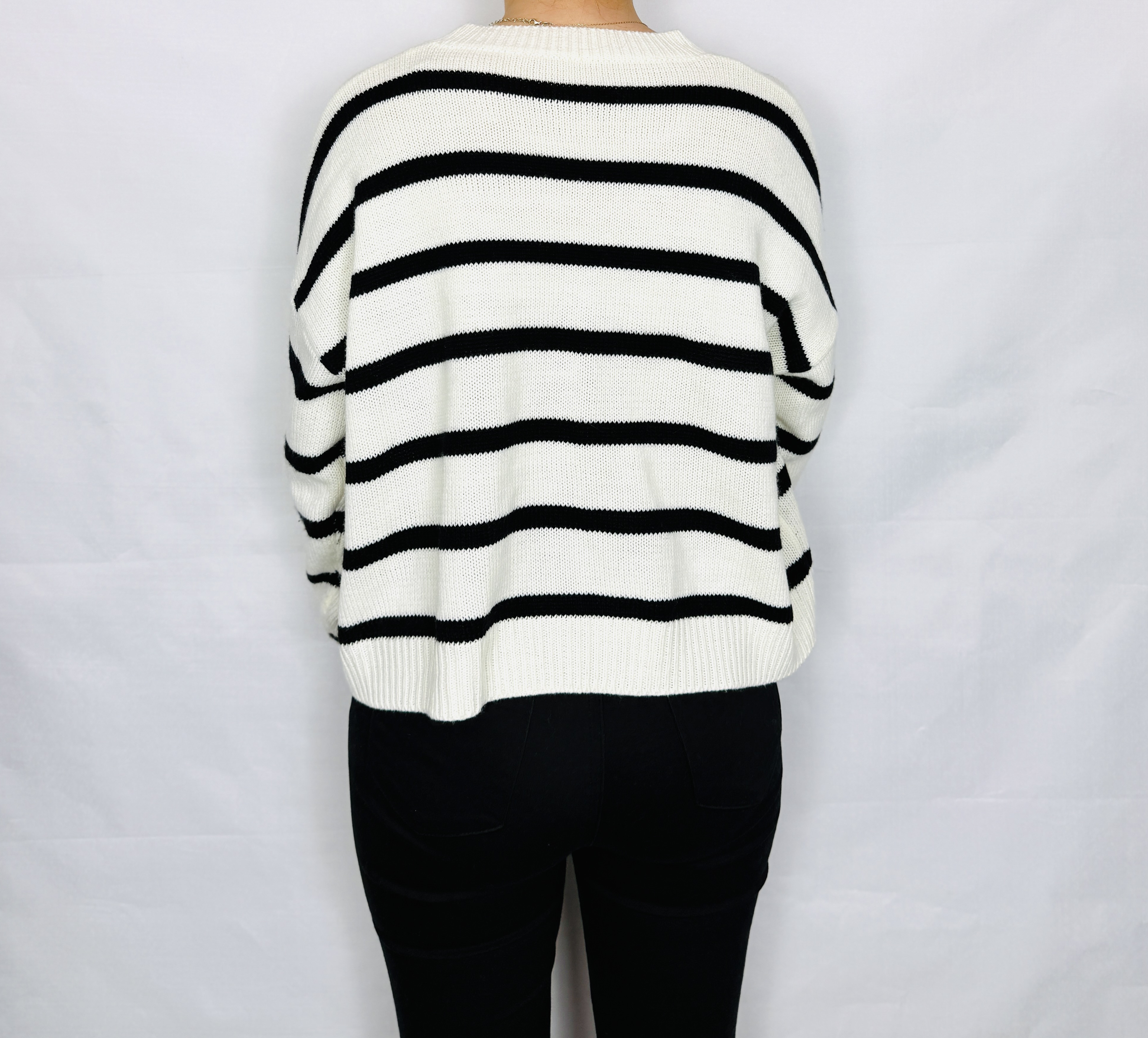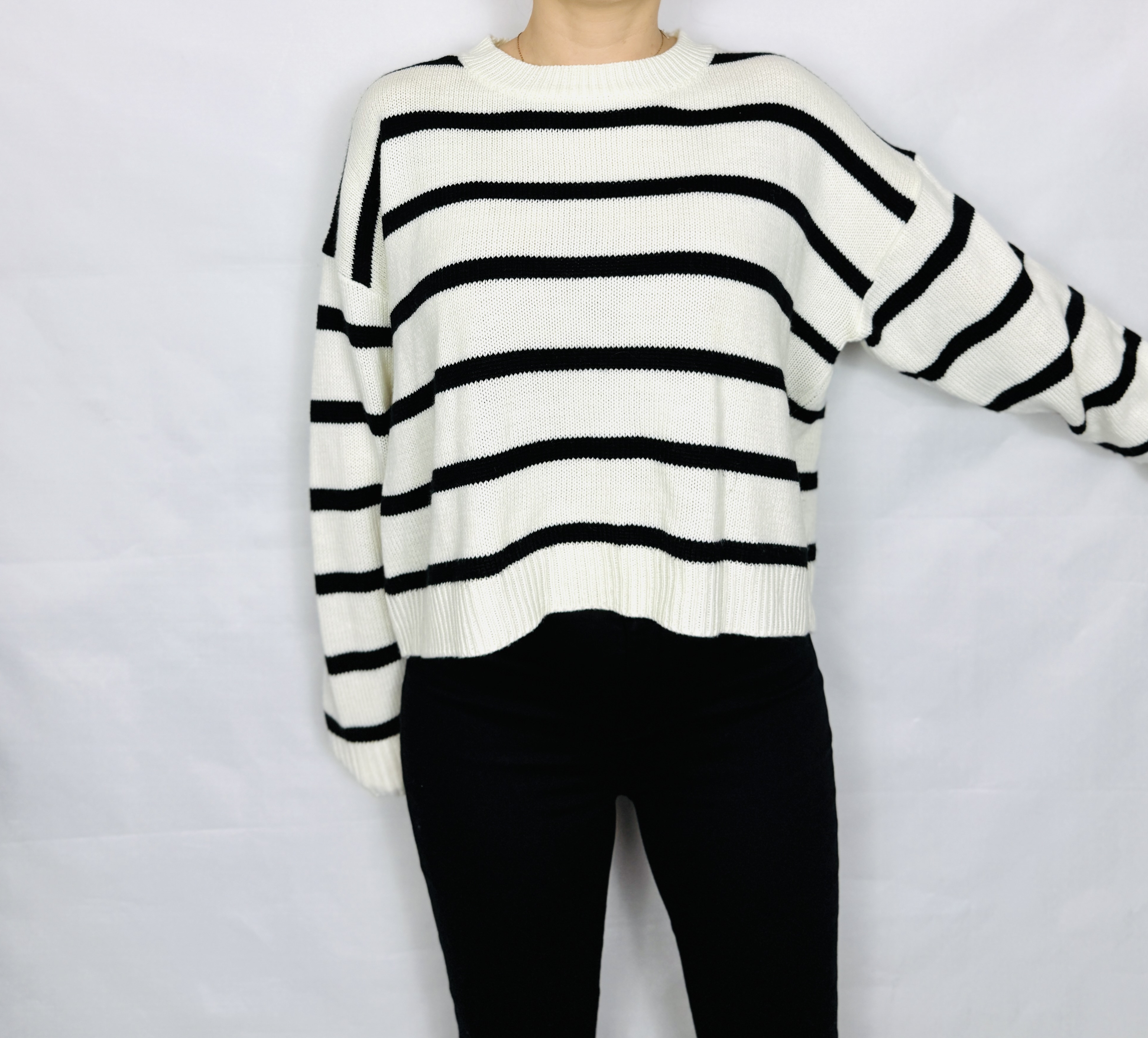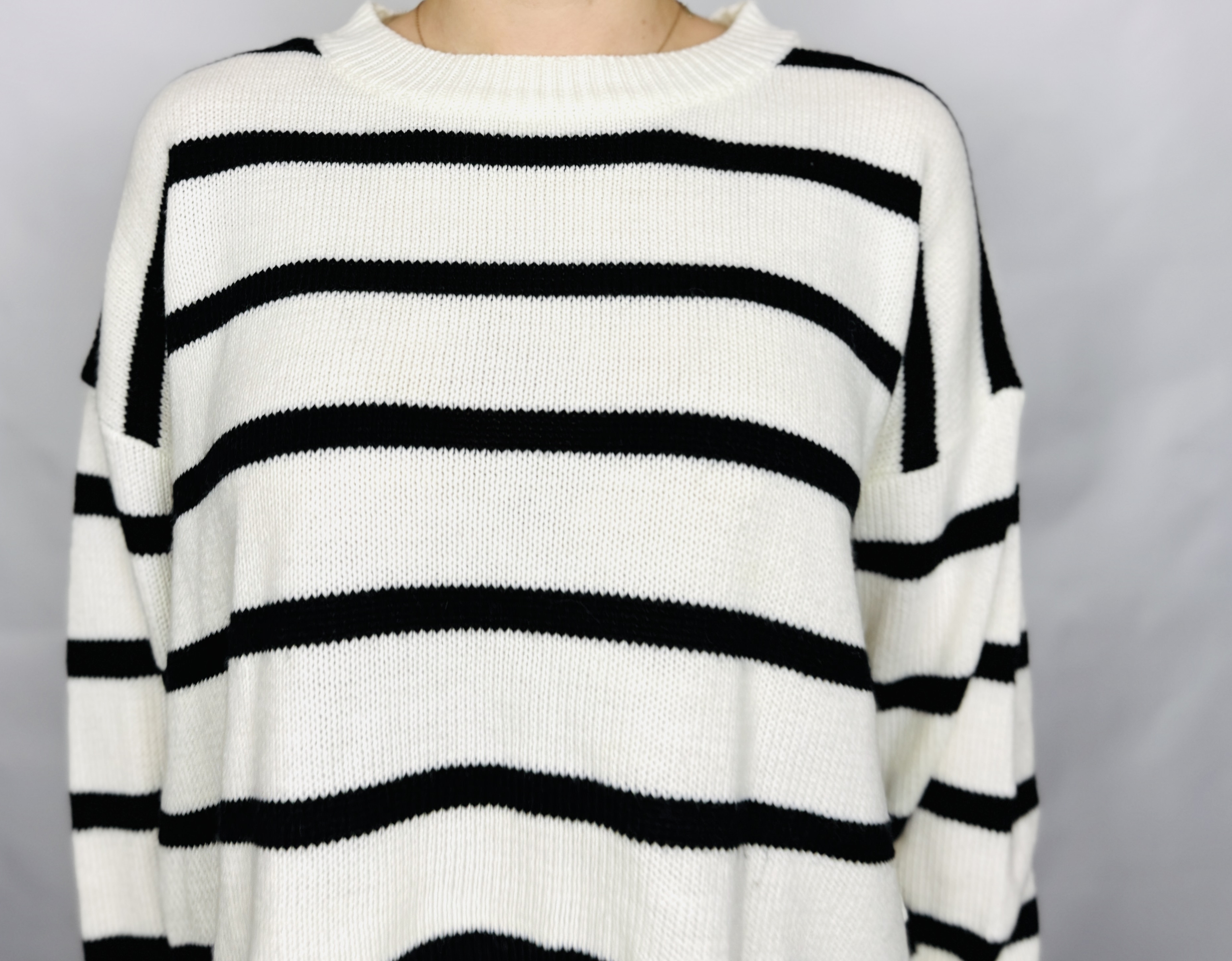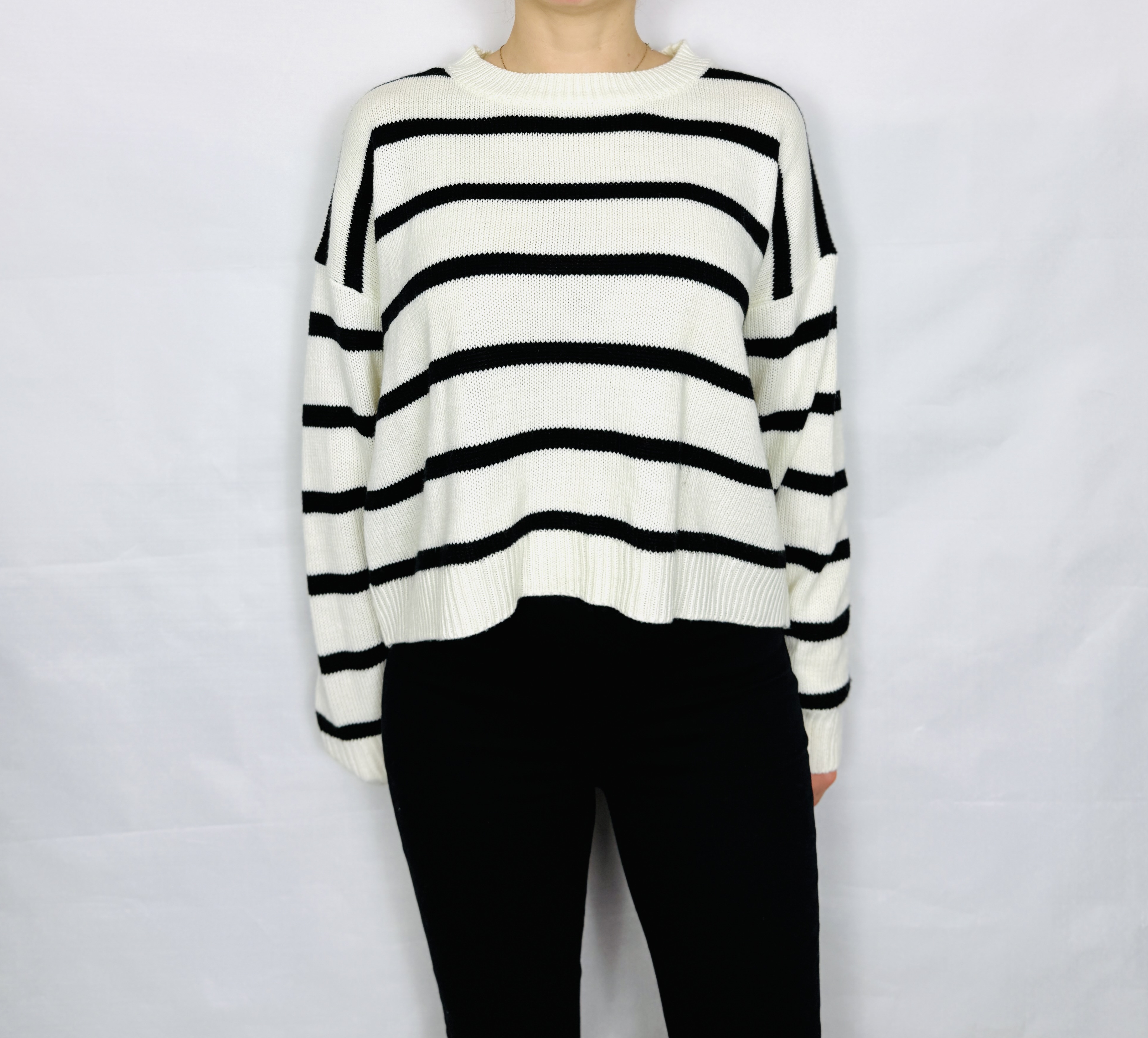 Ten sweter łączy w sobie ponadczasową prostotę z przyjemnym, lekko nonszalanckim sznytem — kremowa baza przeplatana wyraźnymi, poziomymi czarnymi pasami tworzy klasyczny, a jednocześnie świeży efekt, który nigdy nie wychodzi z mody. Forma ma delikatnie swobodny, pudełkowy charakter, dzięki czemu całość wygląda naturalnie i bezpretensjonalnie, a zarazem z wyraźnym zmysłem estetyki. To propozycja dla osób ceniących garderobę, która jest praktyczna, a jednocześnie pełna charakteru.