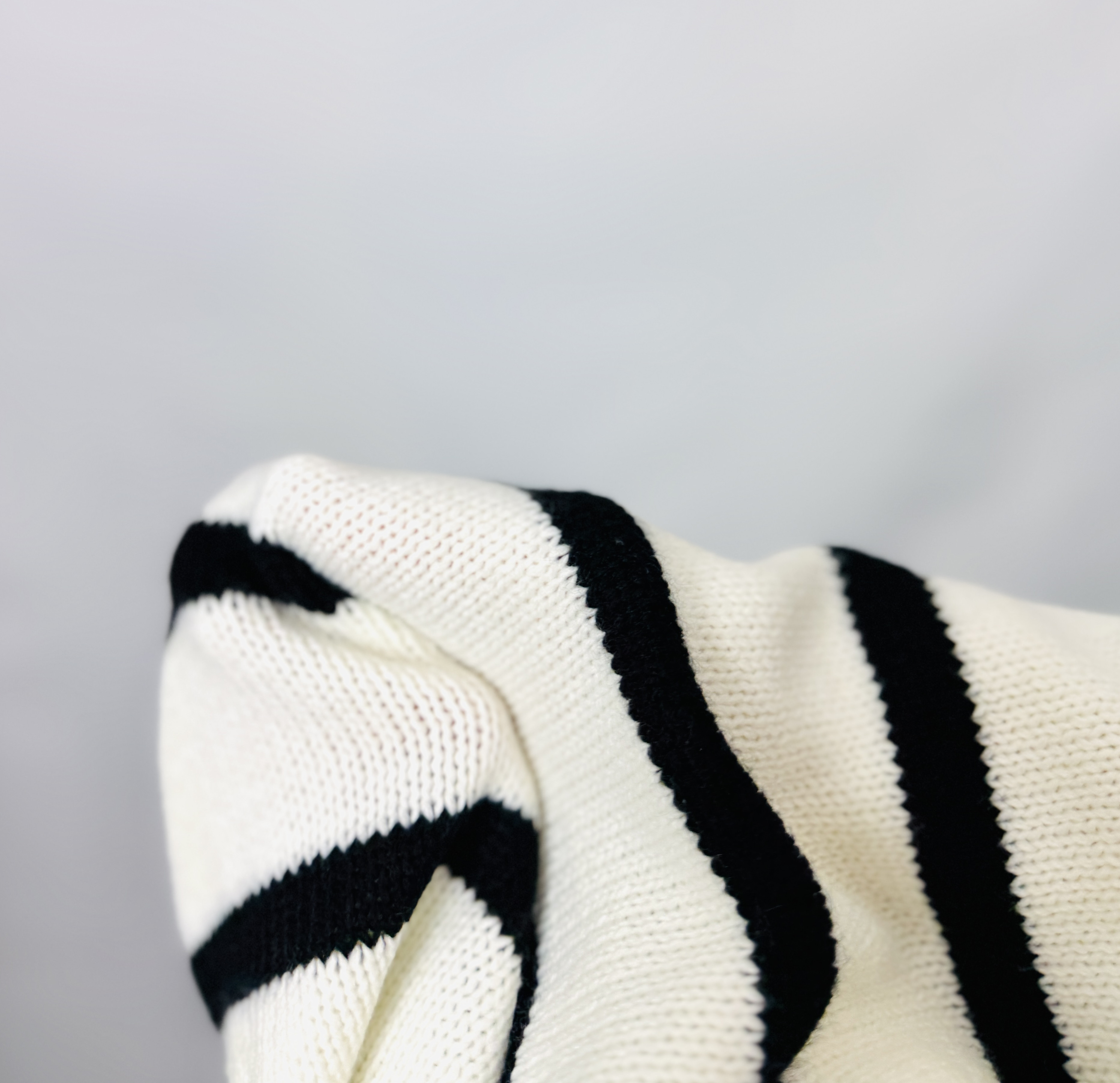 Materiał prezentuje się jako nieco grubszy, mięsisty splot o wyraźnej strukturze, dający wrażenie ciepła i otulenia. Powierzchnia wygląda na miękko układającą się i lekko sprężystą, dzięki czemu sweter trzyma formę, zachowując jednocześnie komfort przy codziennym użytkowaniu. Kontrastowe, regularne paski porządkują kompozycję i nadają całości graficznej klarowności — poziome pasy tworzą wyrazisty, marynarski akcent, który jest zarazem elegancki i swobodny.