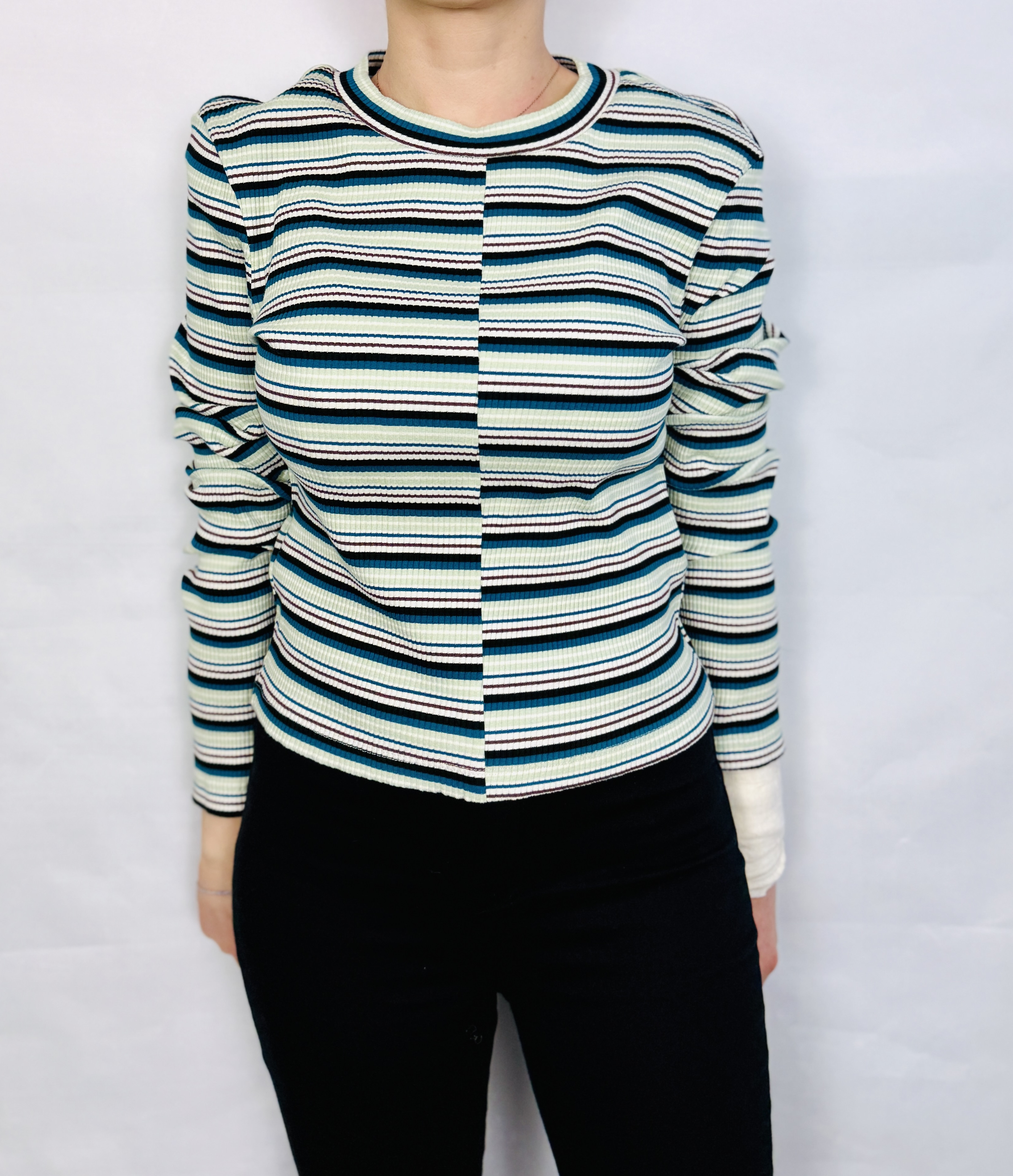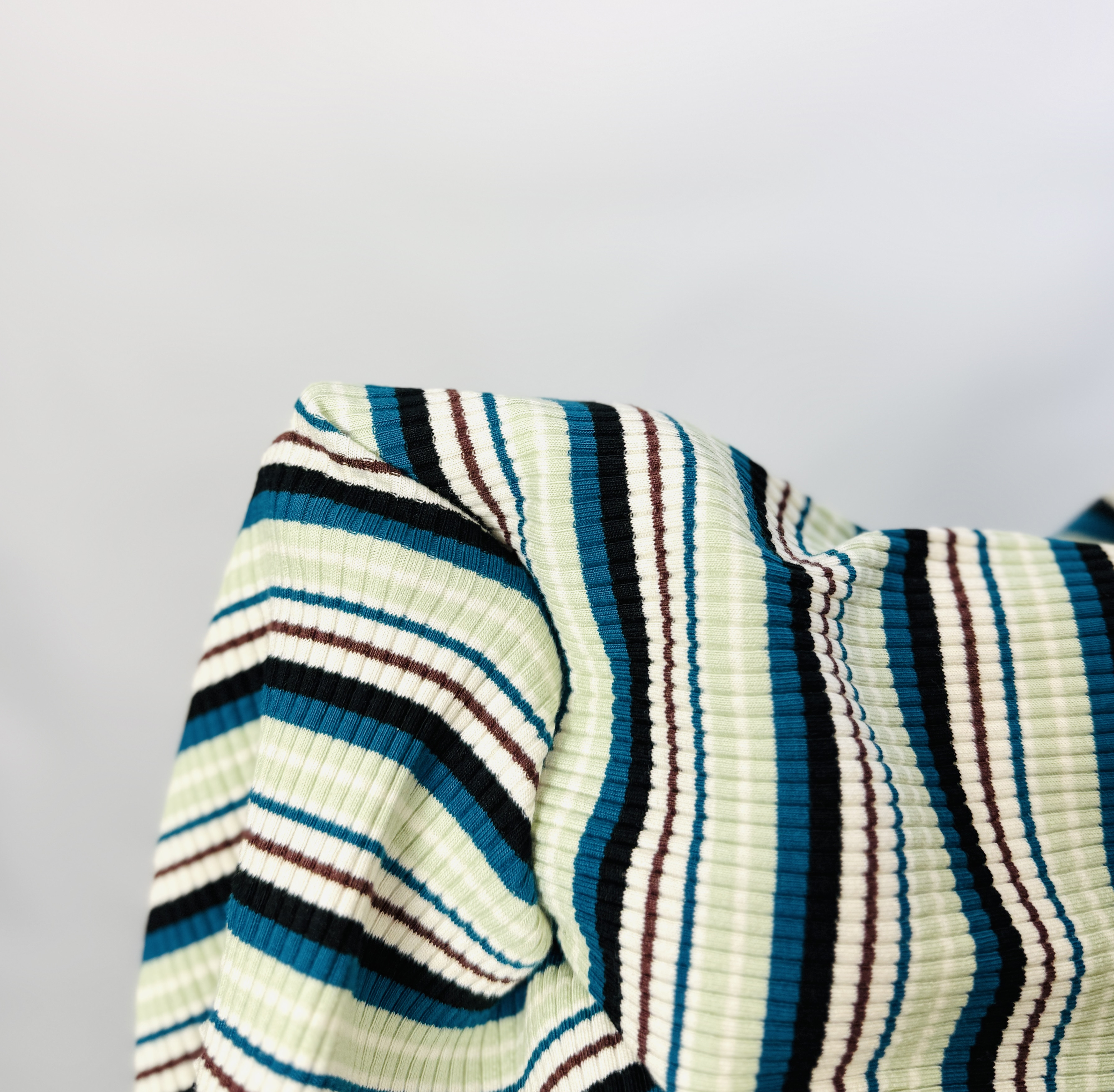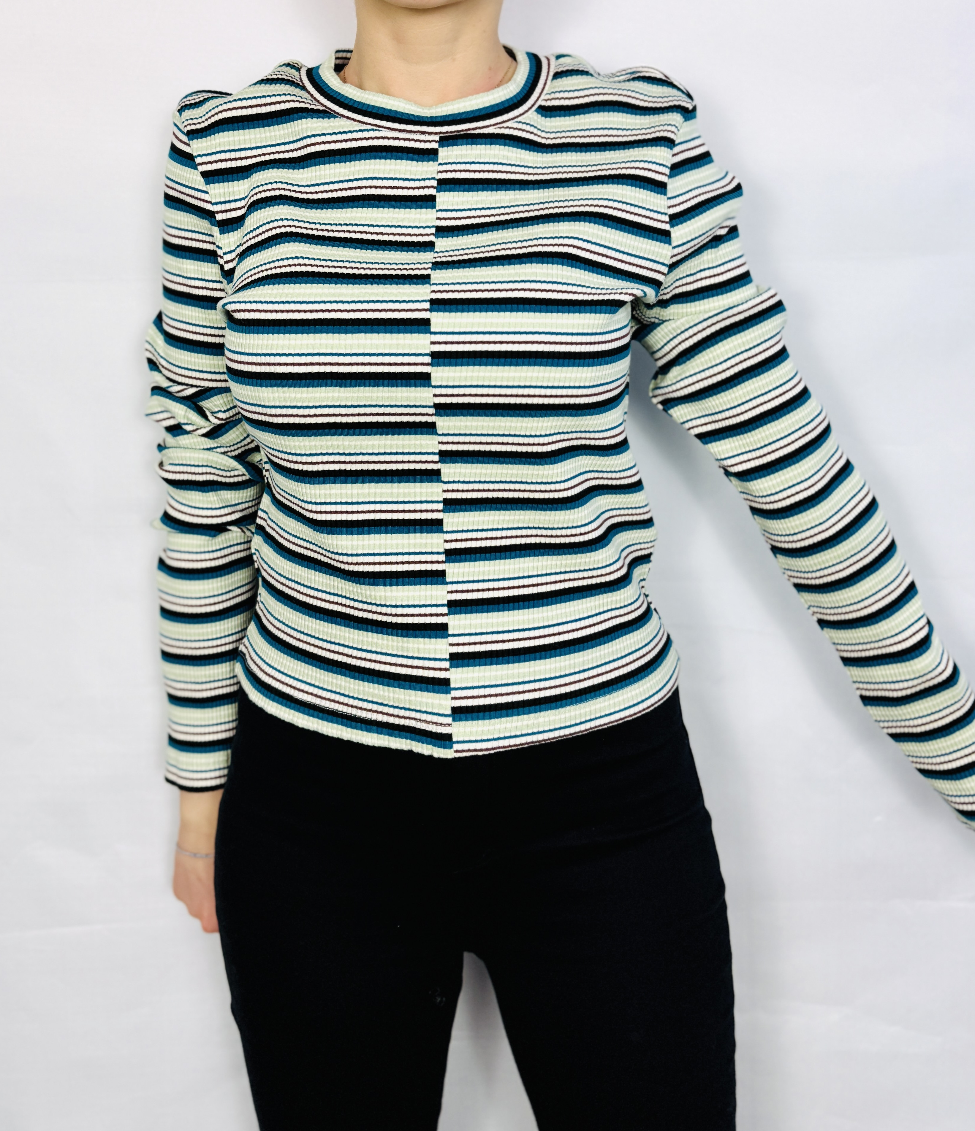 To bluzka o świeżym, lekko retro charakterze — delikatna gra pasów w kremowych, miętowych i granatowych tonach nadaje jej radosnego, a jednocześnie wyważonego wyrazu. Połączenie subtelnych, stonowanych kolorów z rytmem poziomych pasków daje efekt uporządkowanej lekkości; całość wygląda kobieco i nowocześnie, idealna dla tych, którzy cenią sobie zarówno elegancję, jak i codzienny luz. Bluzka emanuje pogodnym szykiem, który łatwo wkomponować w rozmaite stylizacje.