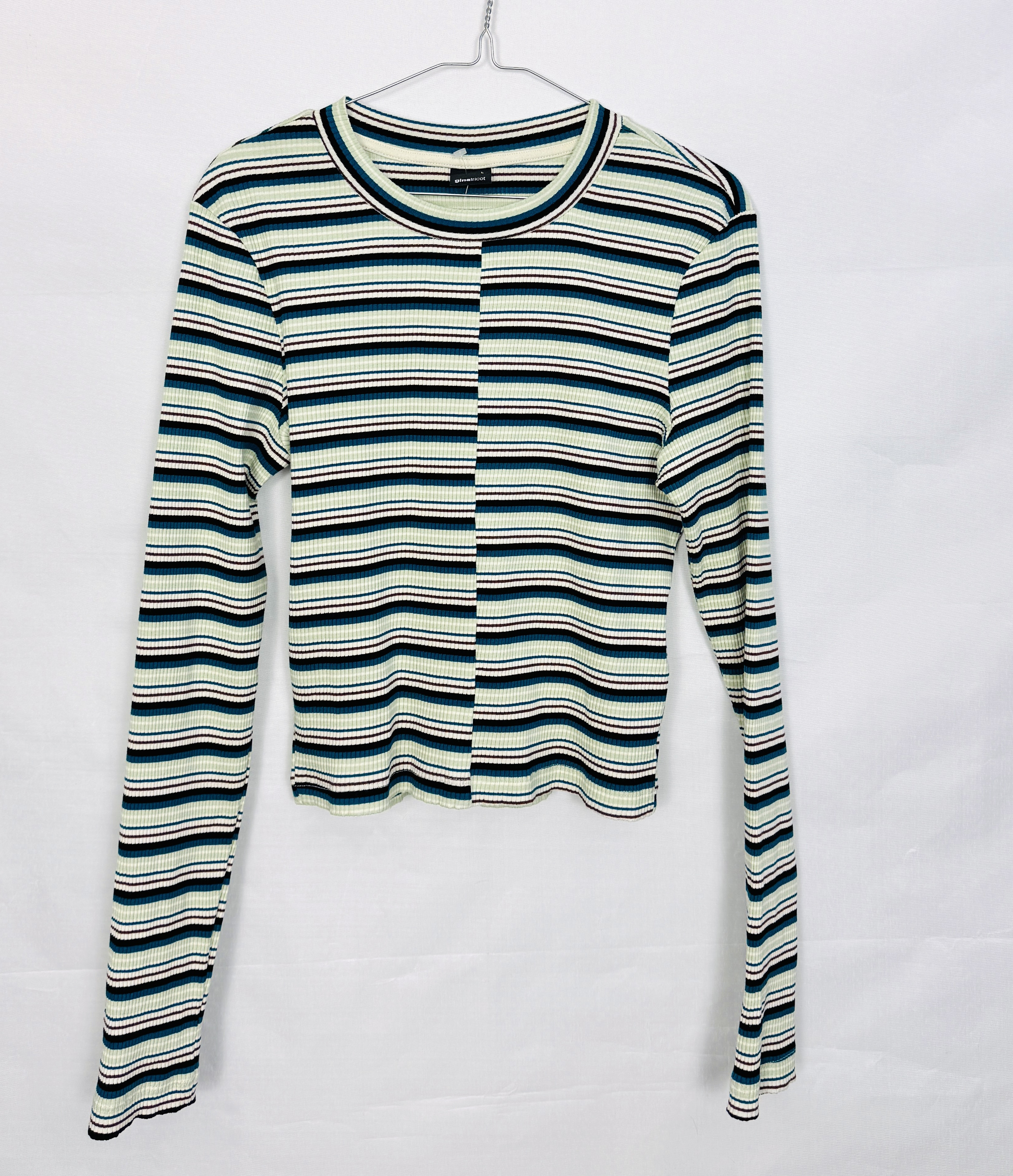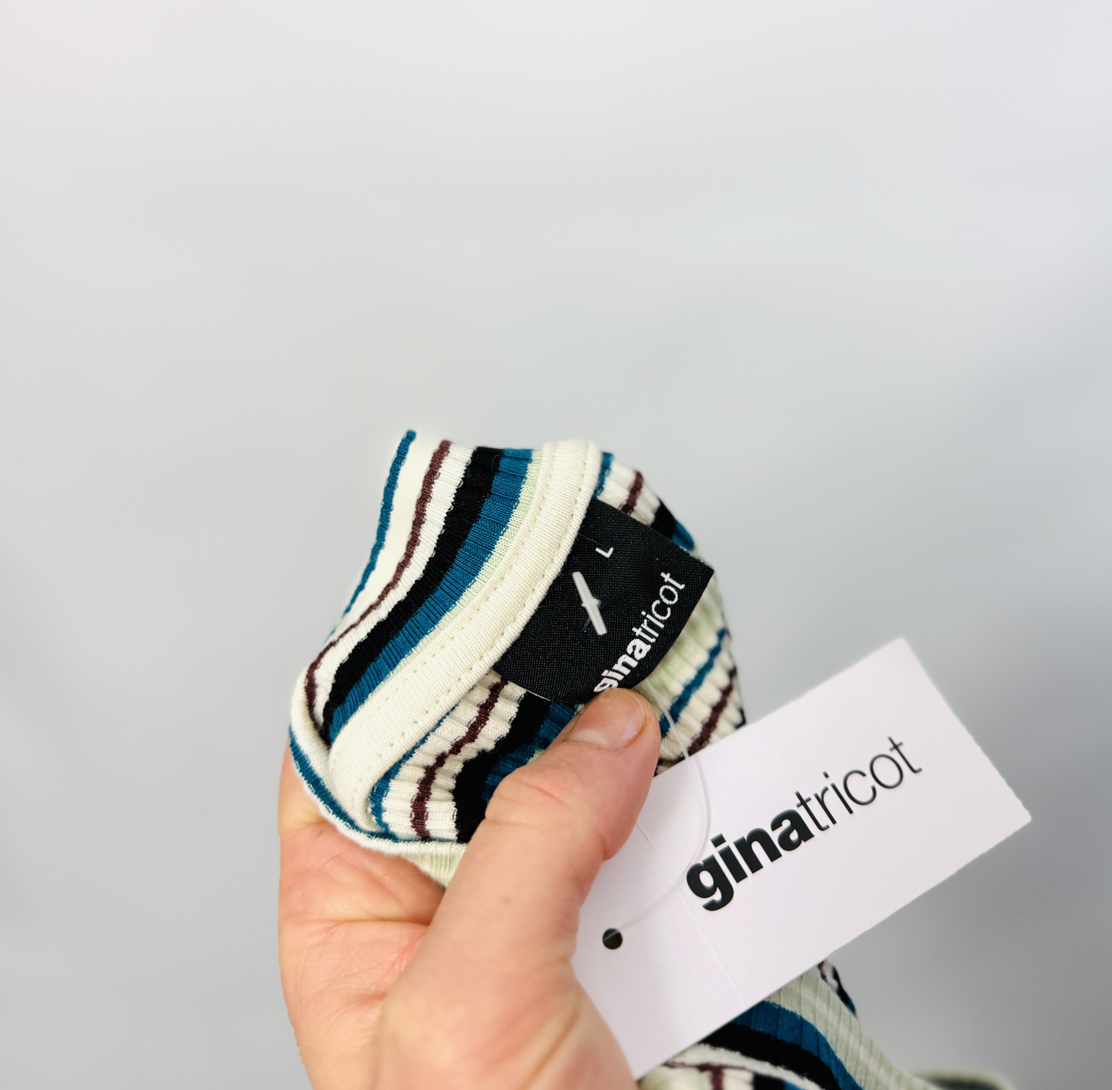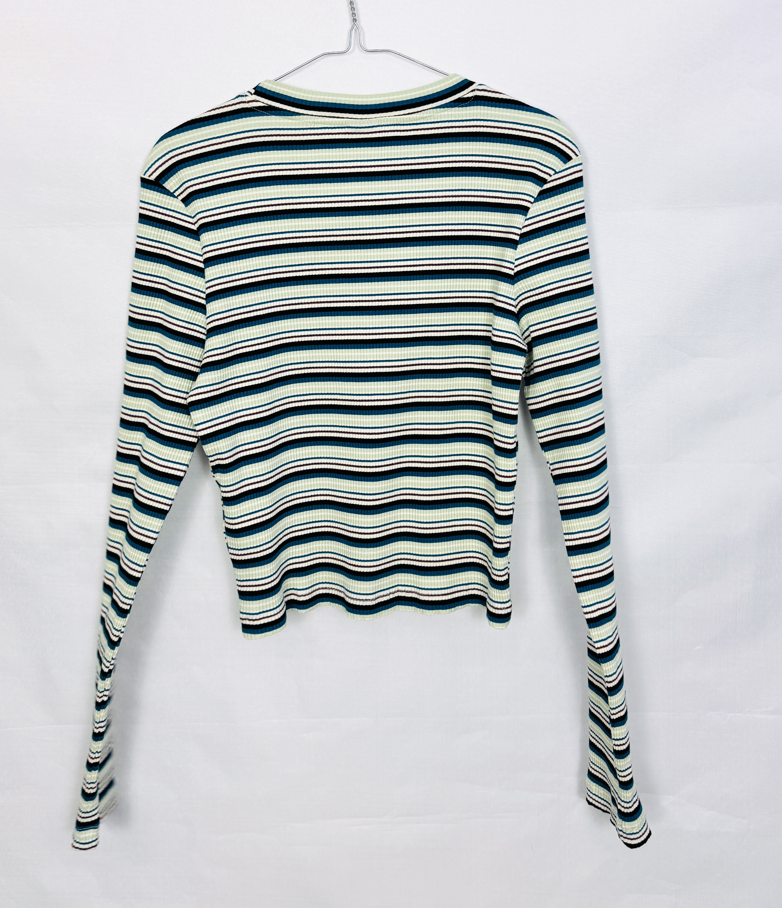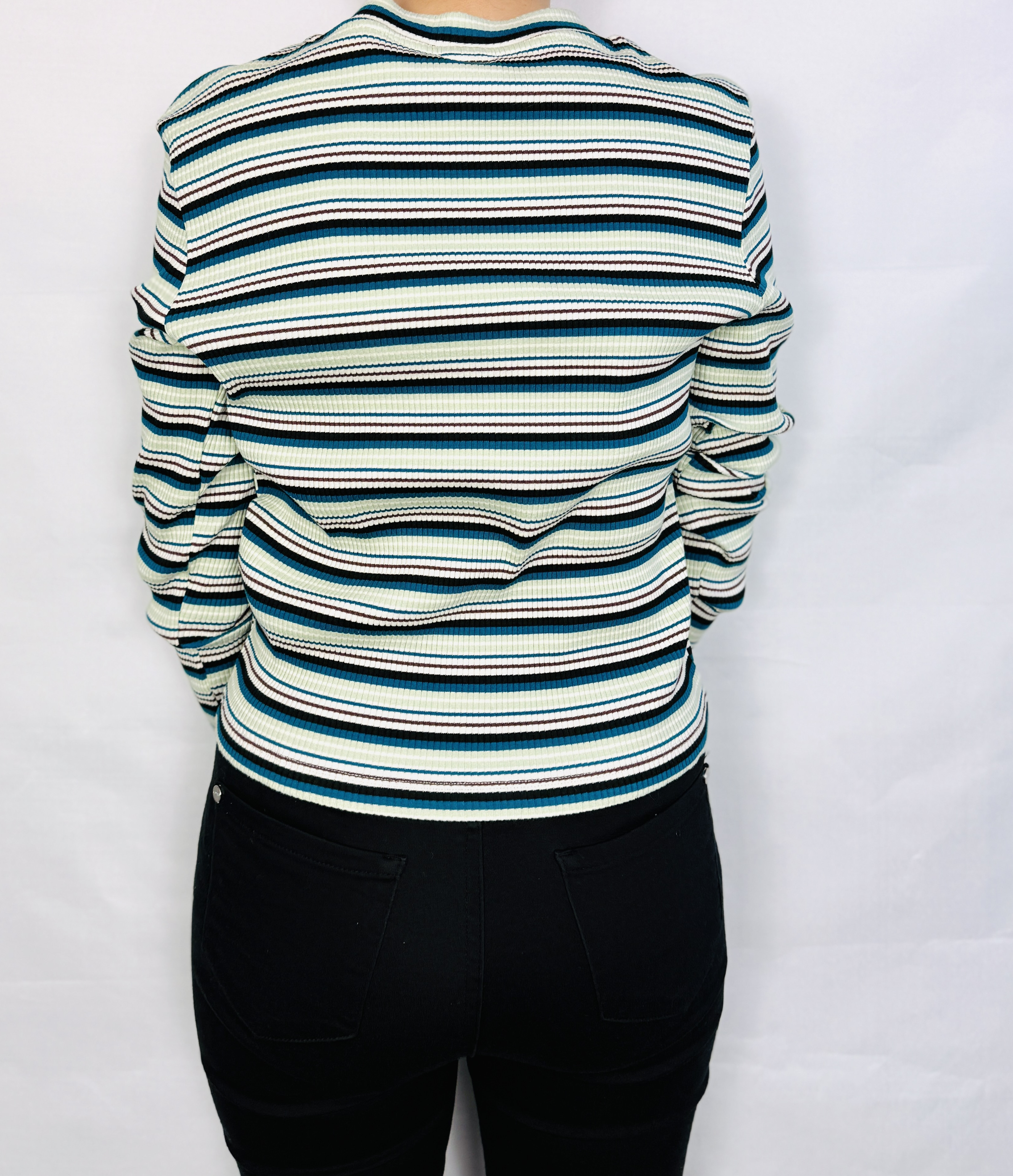 To bluzka o świeżym, lekko retro charakterze — delikatna gra pasów w kremowych, miętowych i granatowych tonach nadaje jej radosnego, a jednocześnie wyważonego wyrazu. Połączenie subtelnych, stonowanych kolorów z rytmem poziomych pasków daje efekt uporządkowanej lekkości; całość wygląda kobieco i nowocześnie, idealna dla tych, którzy cenią sobie zarówno elegancję, jak i codzienny luz. Bluzka emanuje pogodnym szykiem, który łatwo wkomponować w rozmaite stylizacje.