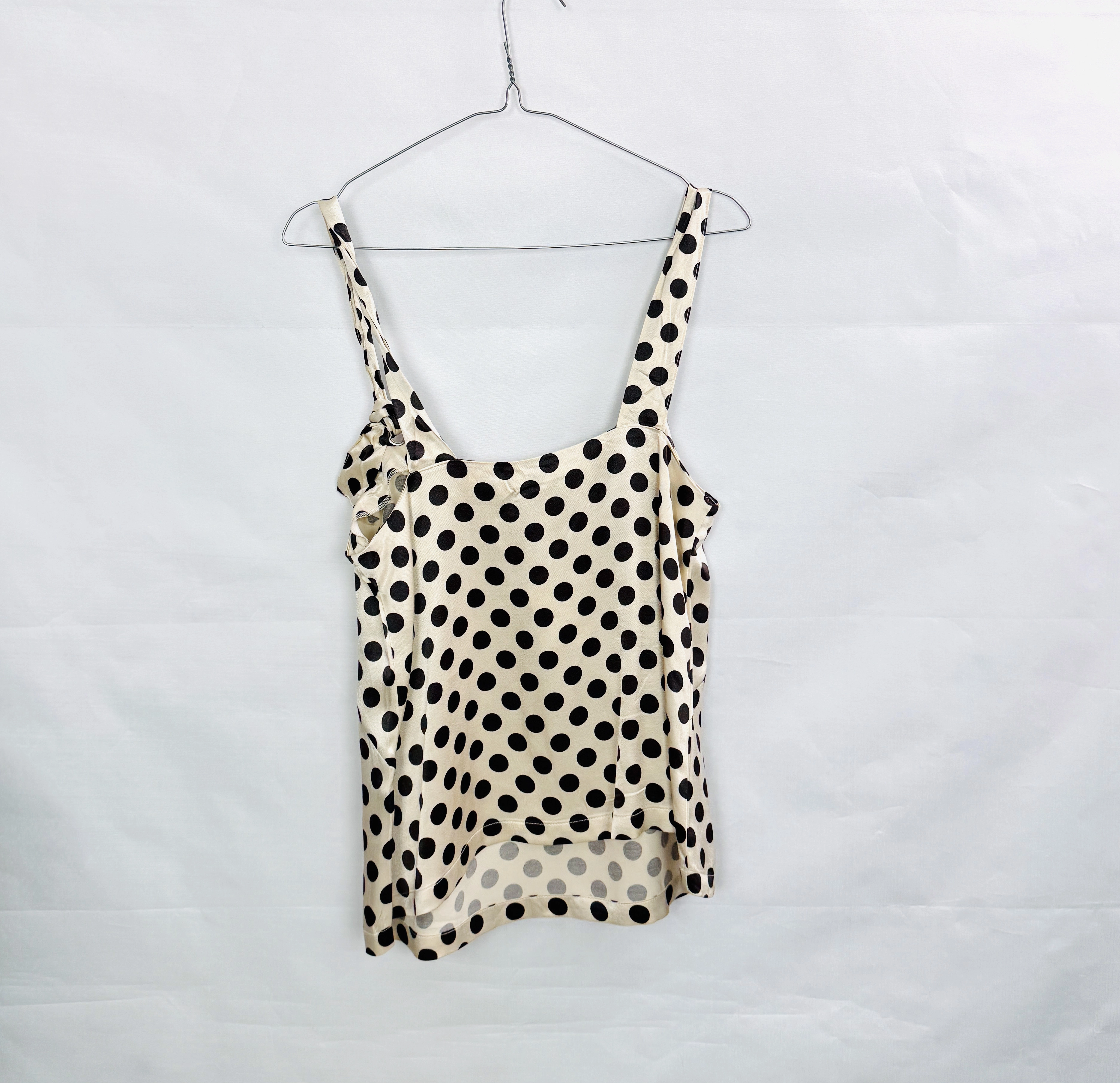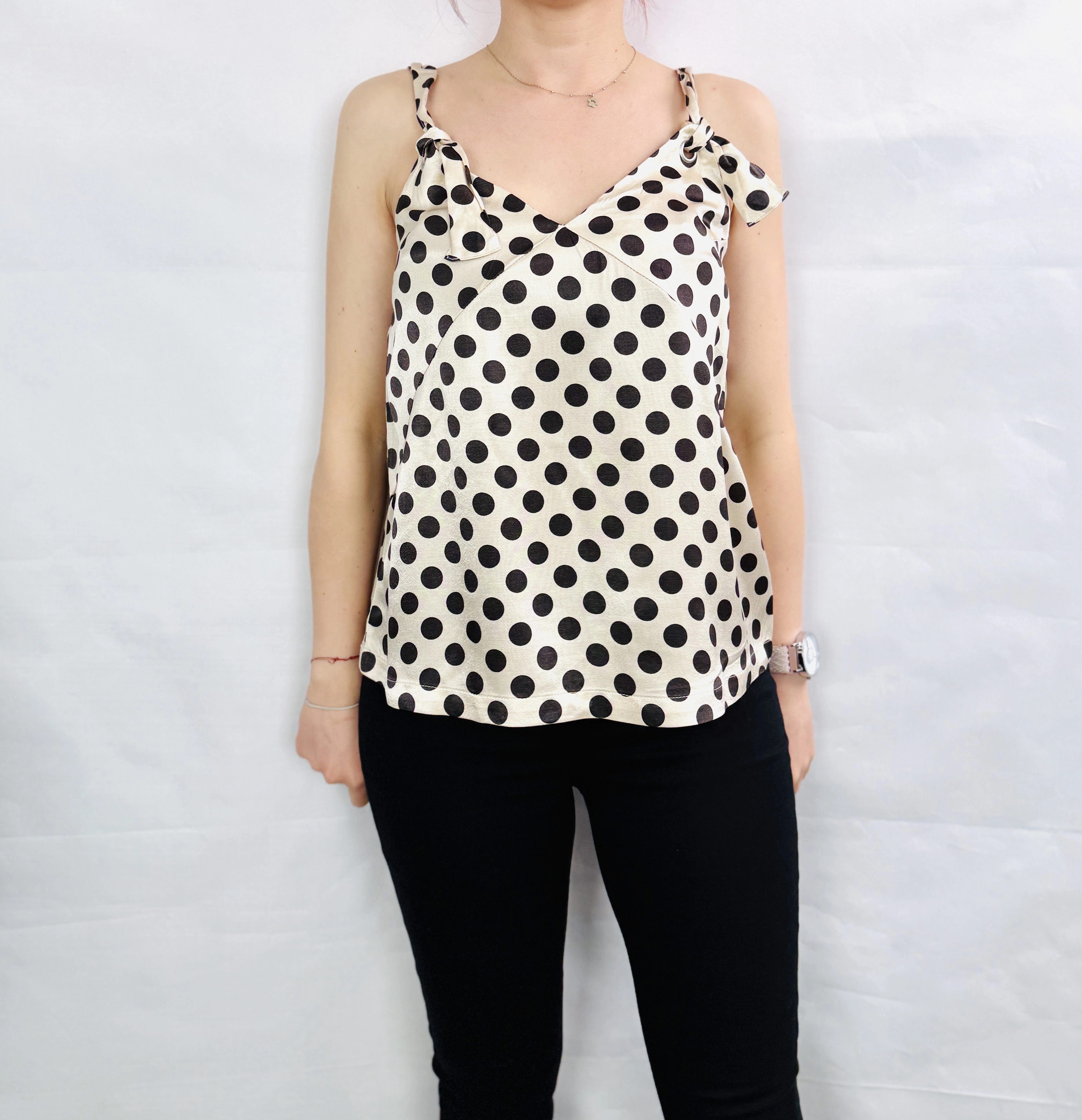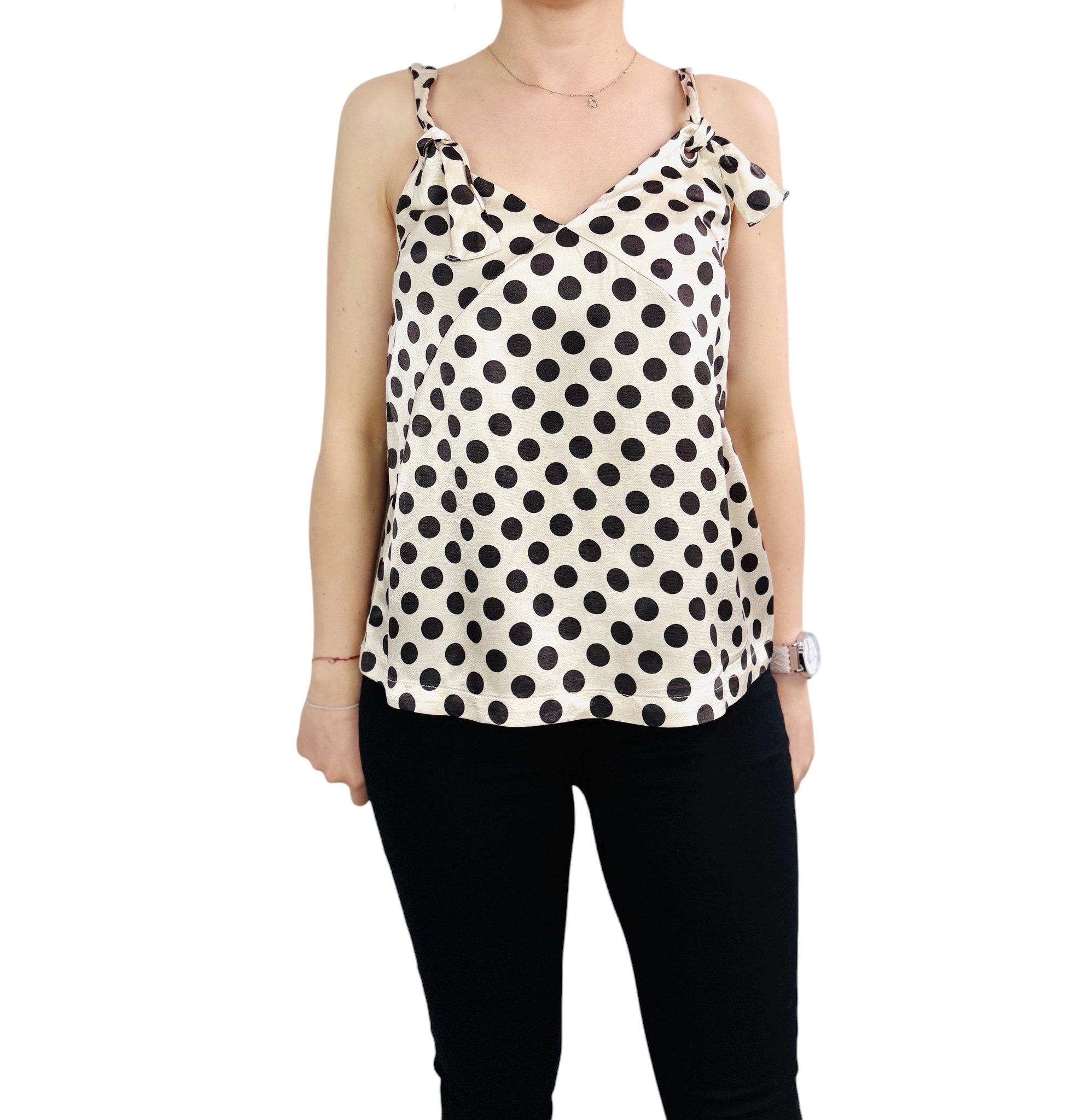 Kremowy top w czarne groszki z wiązaniem S 36