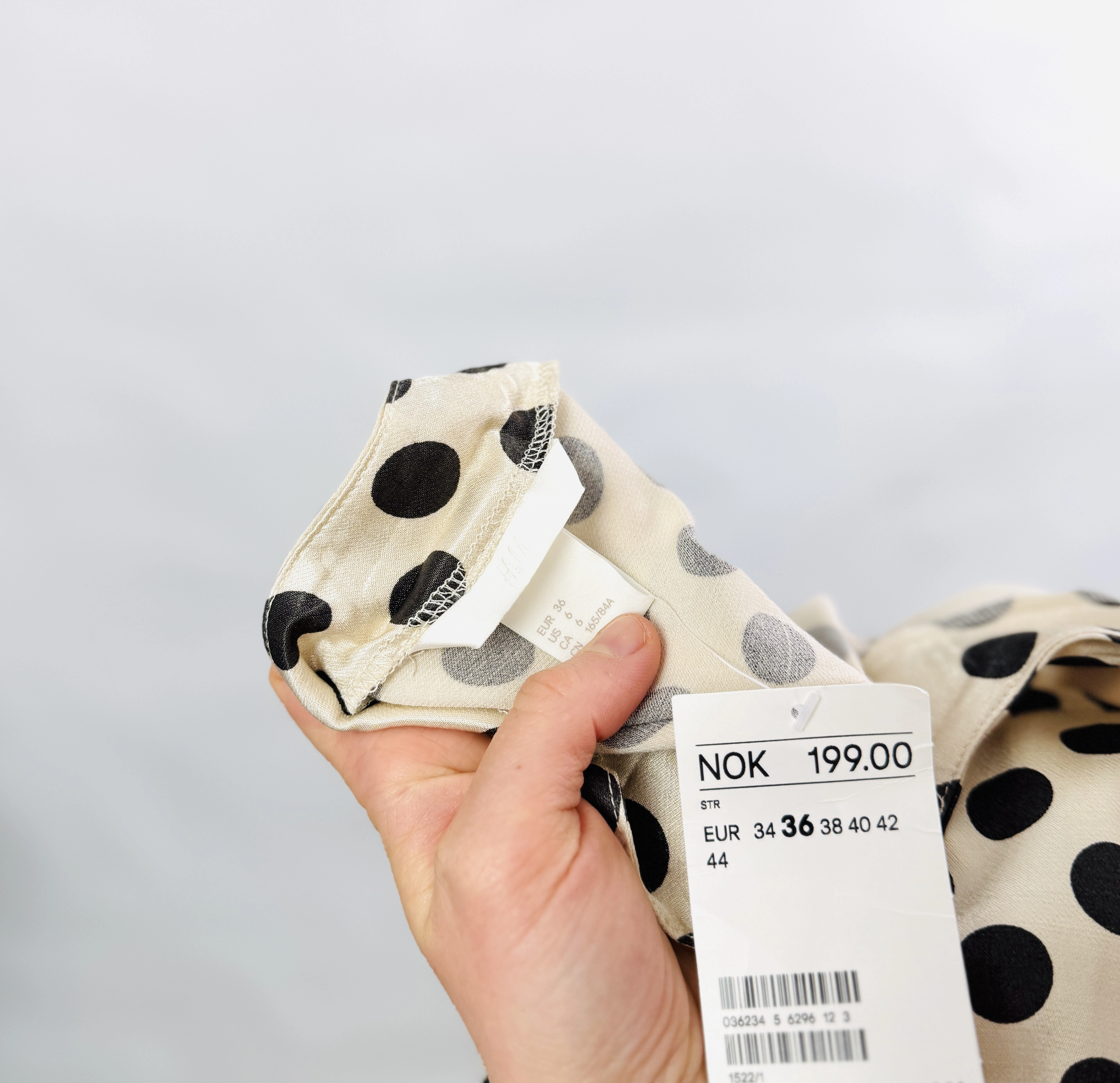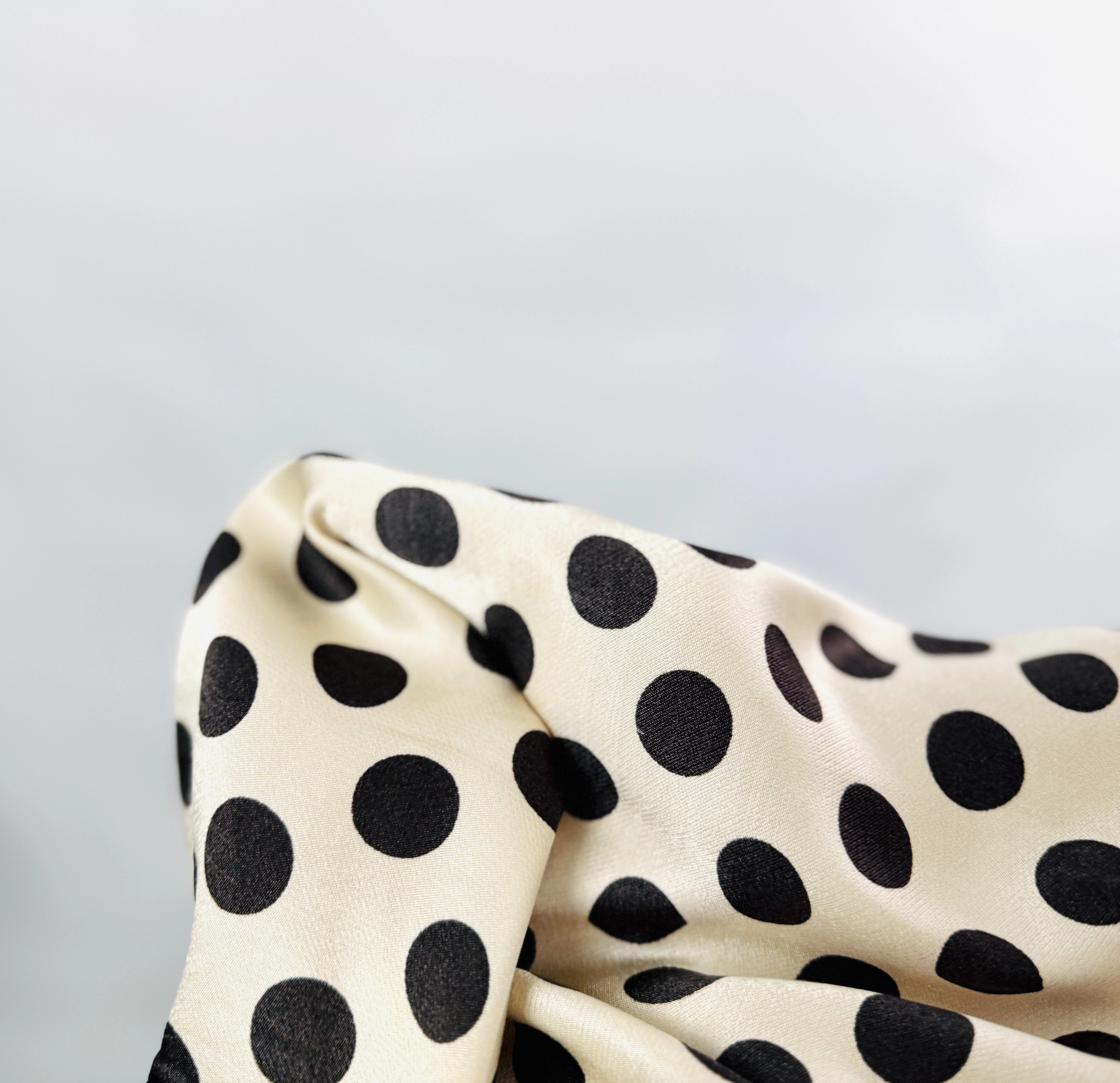 Materiał, z którego wykonano ten model, jest lekki, zwiewny i delikatnie lejący, dzięki czemu ubranie pięknie pracuje przy każdym ruchu. Tkanina charakteryzuje się gładszą strukturą i bardzo subtelnym, satynowym połyskiem, co podkreśla szlachetność kremowego odcienia i dodaje całości elegancji. Jest to materiał miękko układający się na ciele, co w połączeniu z luźniejszym krojem sprawia, że top jest niezwykle przyjemny dla skóry i przewiewny. Wysoka jakość nadruku gwarantuje nasycenie czerni groszków, tworząc wyraźny i estetyczny kontrast z jasnym tłem, który zachwyca precyzją wykonania.