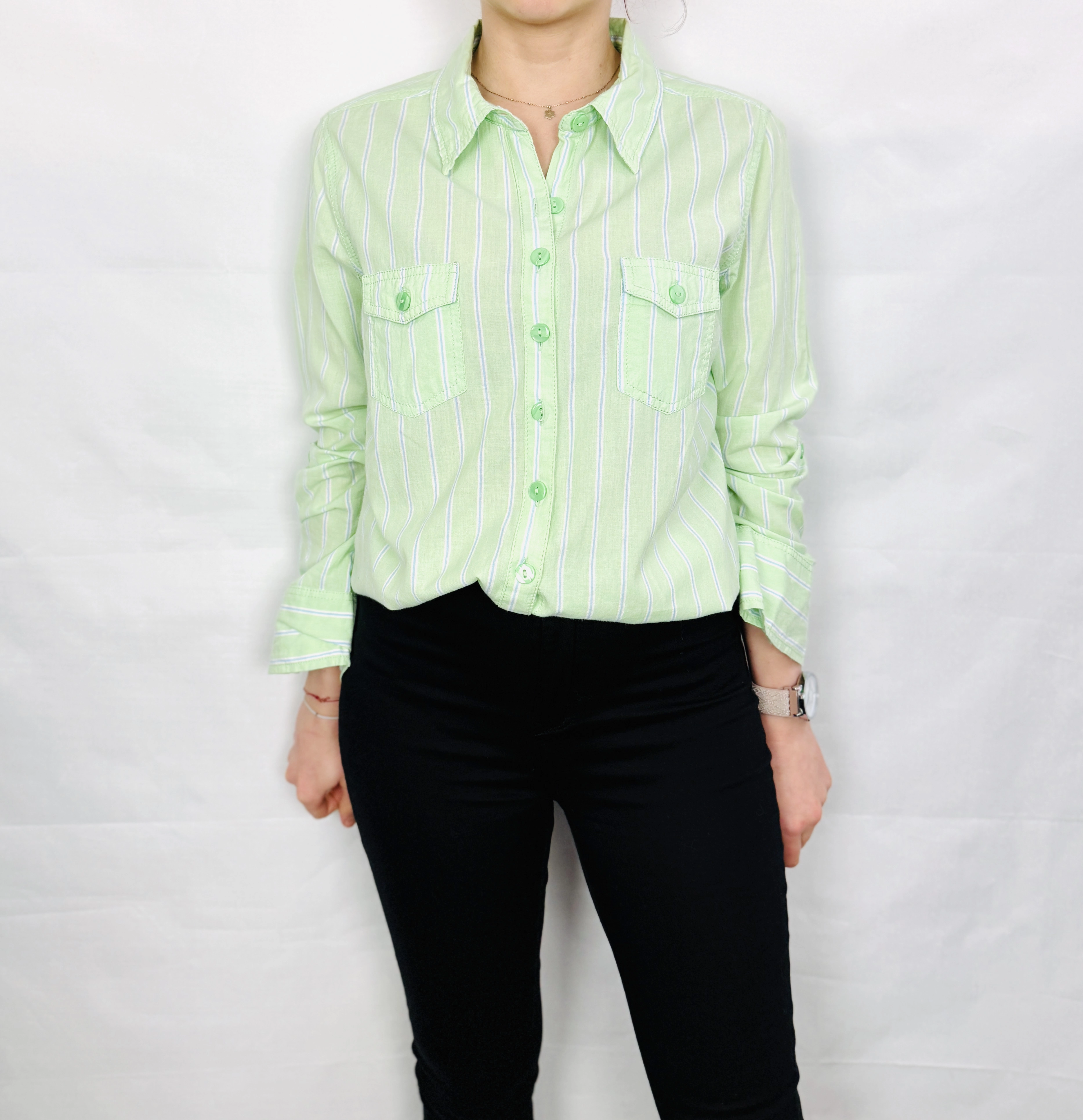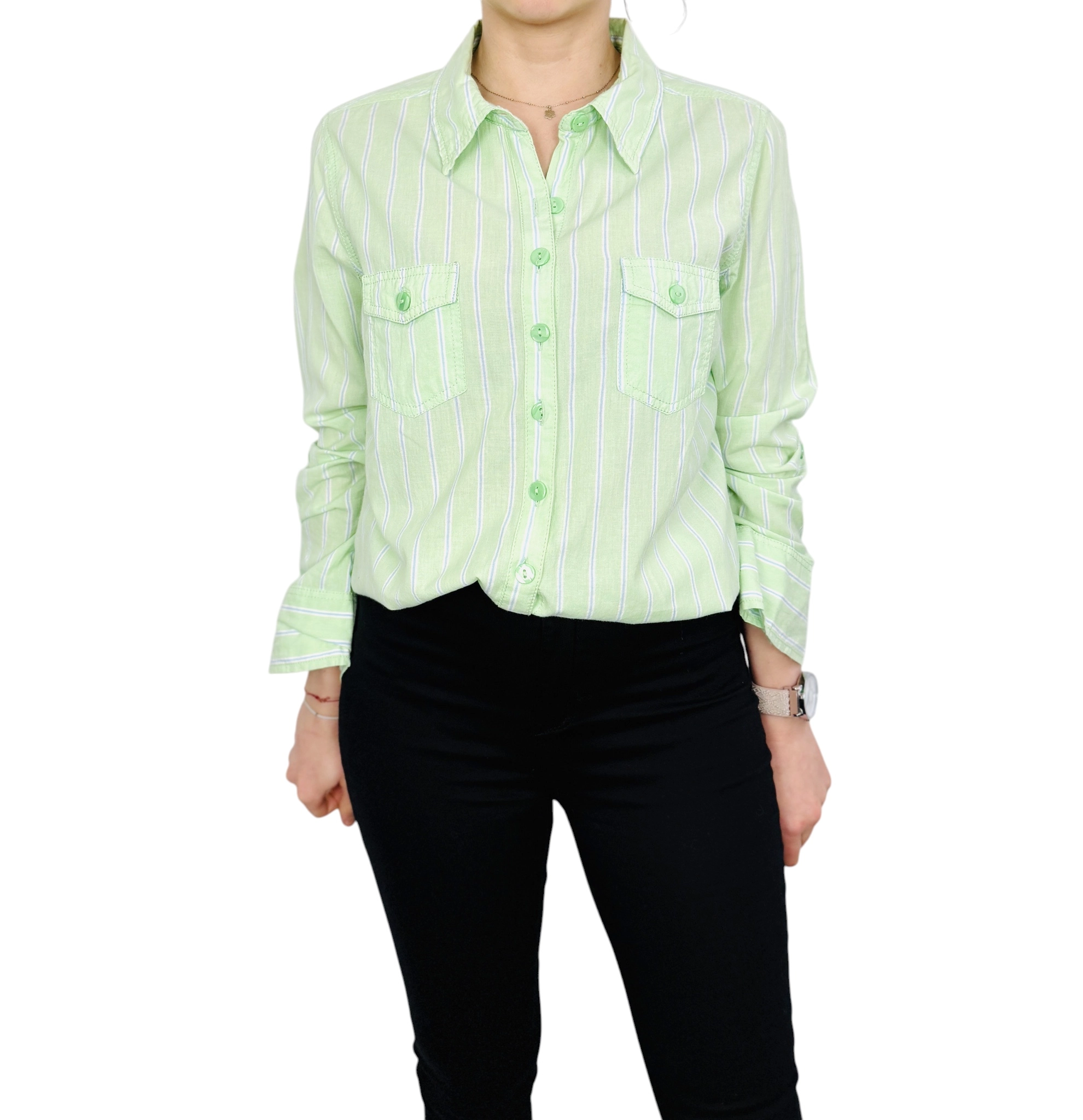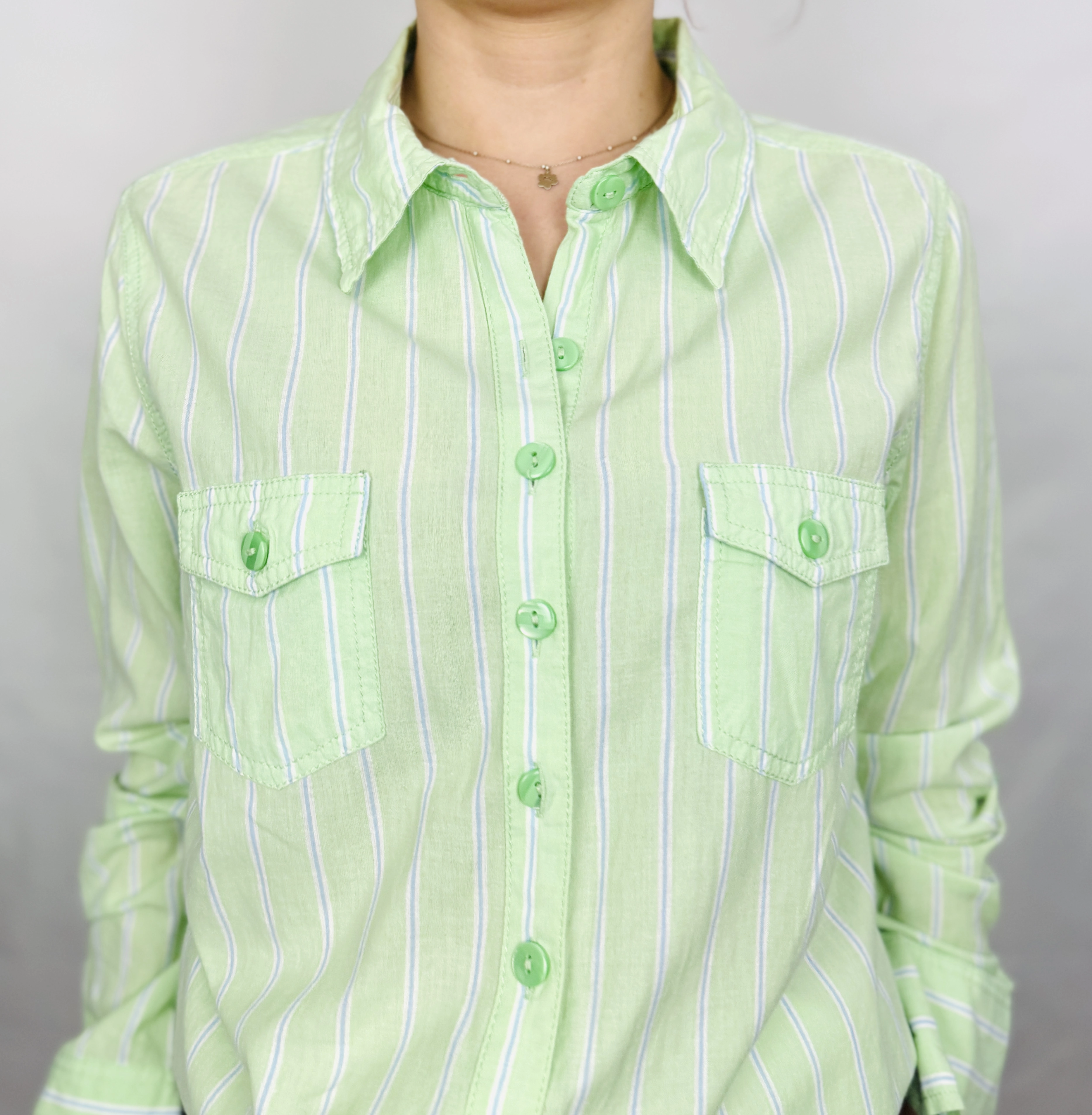 Krój koszuli charakteryzuje się prostą, lekko dopasowaną linią, która subtelnie zaznacza sylwetkę, nie ograniczając przy tym komfortu noszenia. Klasyczny kołnierzyk nadaje całości eleganckiego sznytu, a zapięcie na rząd małych guzików w pasującym, zielonym odcieniu pozwala na dowolną regulację dekoltu. Na piersiach umieszczono dwie symetryczne kieszenie z klapkami zapinanymi na guziki, co stanowi efektowny detal i nadaje koszuli nieco militarno sportowego wyrazu. Długie rękawy wykończone są prostymi mankietami, a dodatkowy guzik na ramieniu sugeruje możliwość ich wygodnego podpięcia, co dodaje ubraniu funkcjonalności i nonszalanckiego uroku.