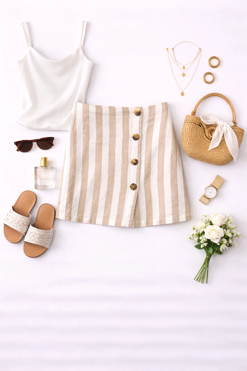 W kwestii stylizacji lniana spódnica w beżowe paski oferuje mnóstwo inspirujących możliwości. Na co dzień stworzy idealny duet z prostym, białym t-shirtem lub dopasowanym body oraz skórzanymi klapkami, tworząc look pełen miejskiego luzu i wakacyjnej swobody. Do pracy, w stylu smart casual, świetnie zaprezentuje się w połączeniu z gładką, kremową bluzką i klasycznymi loafersami, co podkreśli profesjonalny, a zarazem letni wizerunek. Beż i biel spódnicy przepięknie komponują się z brązem, złotem, oliwkową zielenią oraz wszelkimi odcieniami błękitu. Na wieczorne spotkanie wystarczy dodać delikatną biżuterię i sandałki na obcasie, by uzyskać stylizację pełną klasy i kobiecego wdzięku w bardzo naturalnym wydaniu.