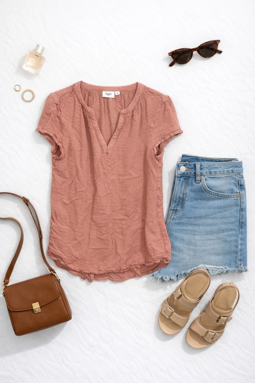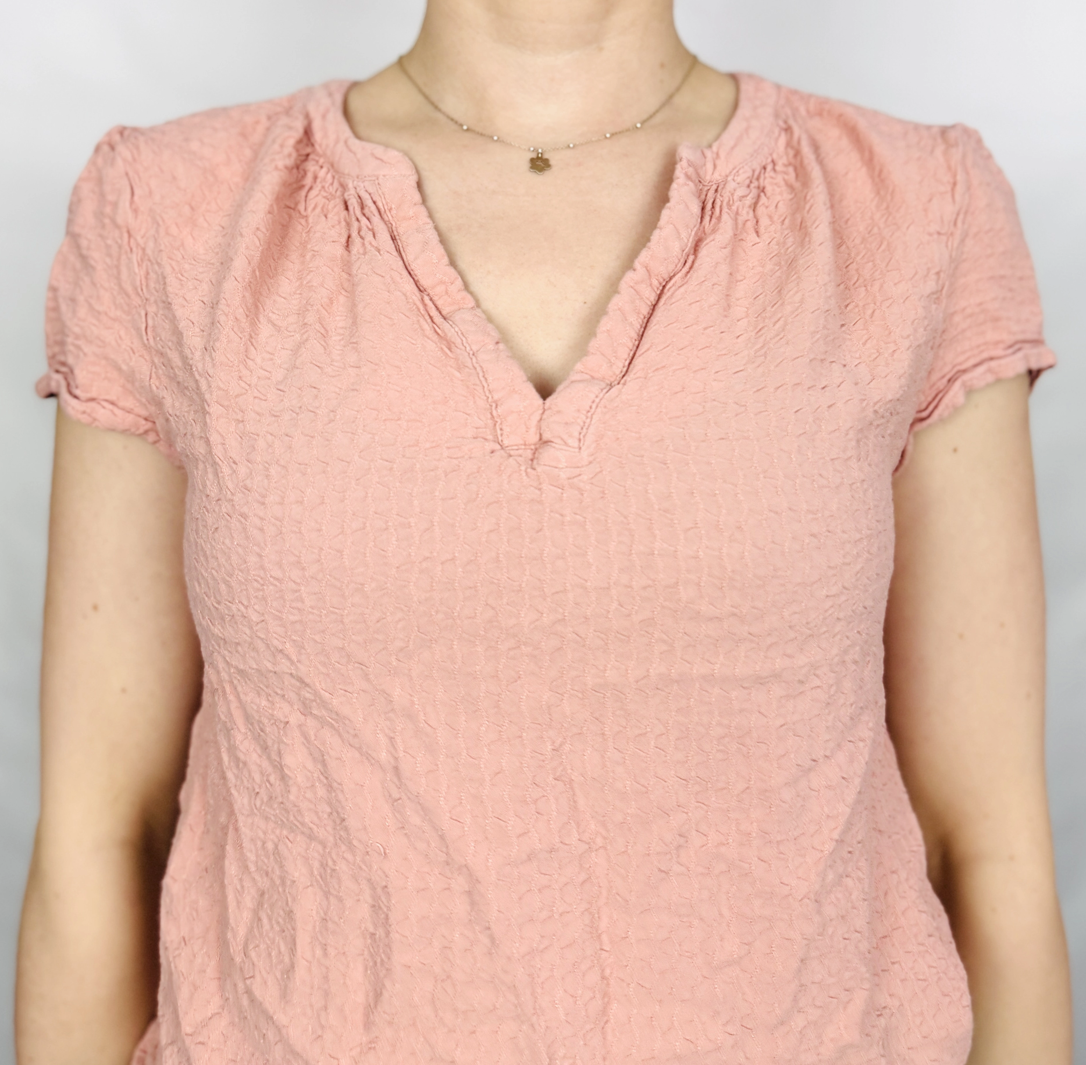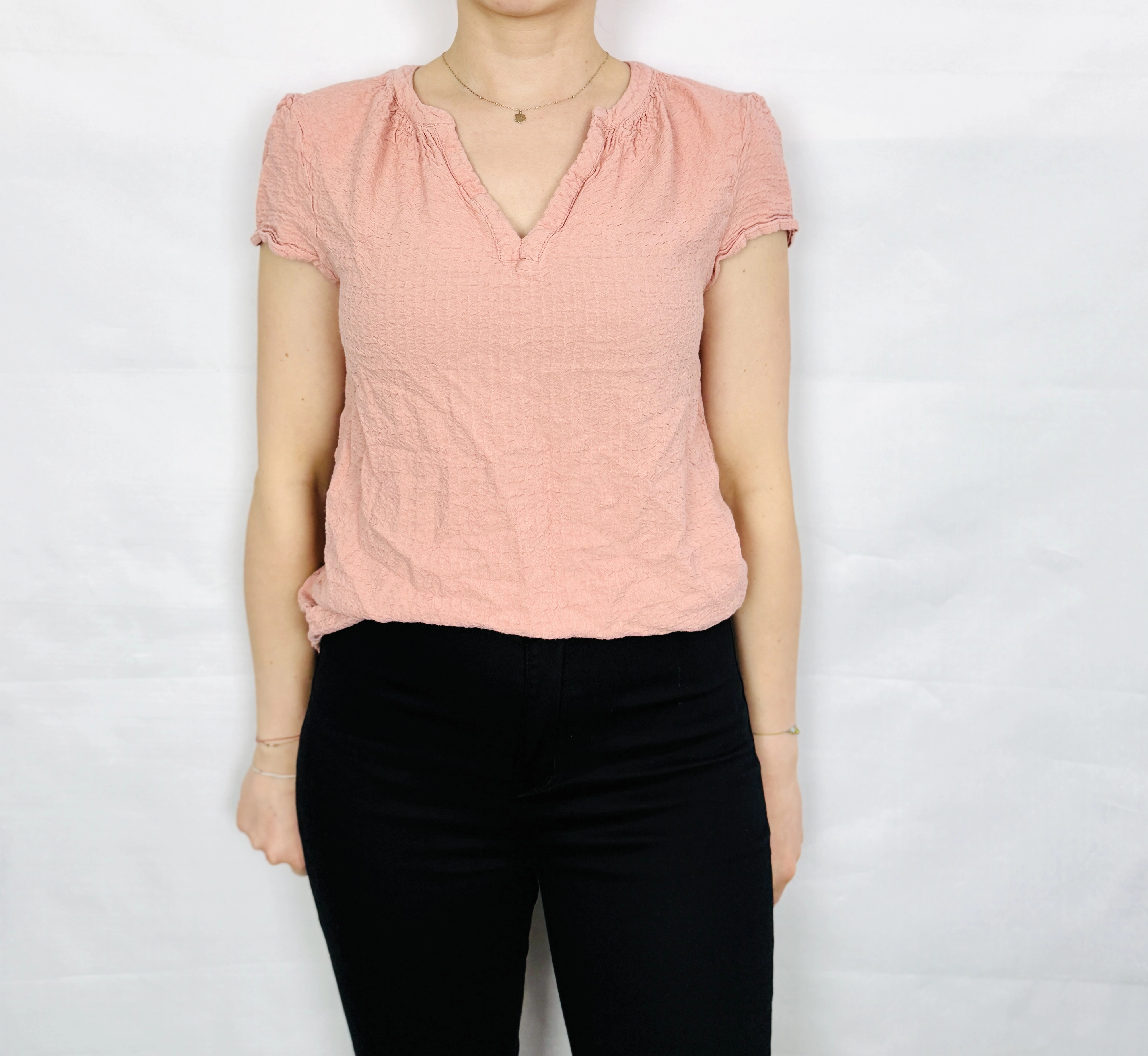 Fason bluzki jest lekko dopasowany, ale pozostawia swobodę ruchów, dzięki czemu układa się naturalnie na sylwetce. Dekolt w kształcie litery V subtelnie wydłuża szyję i podkreśla linię obojczyków, dodając całości lekkości i kobiecego uroku. Krótkie rękawy o delikatnie marszczonym wykończeniu przy ramionach nadają bluzce miękkości i wprowadzają subtelną objętość w górnej części sylwetki. Całość kończy się na wysokości bioder, co sprawia, że model jest bardzo uniwersalny i łatwy do stylizowania.