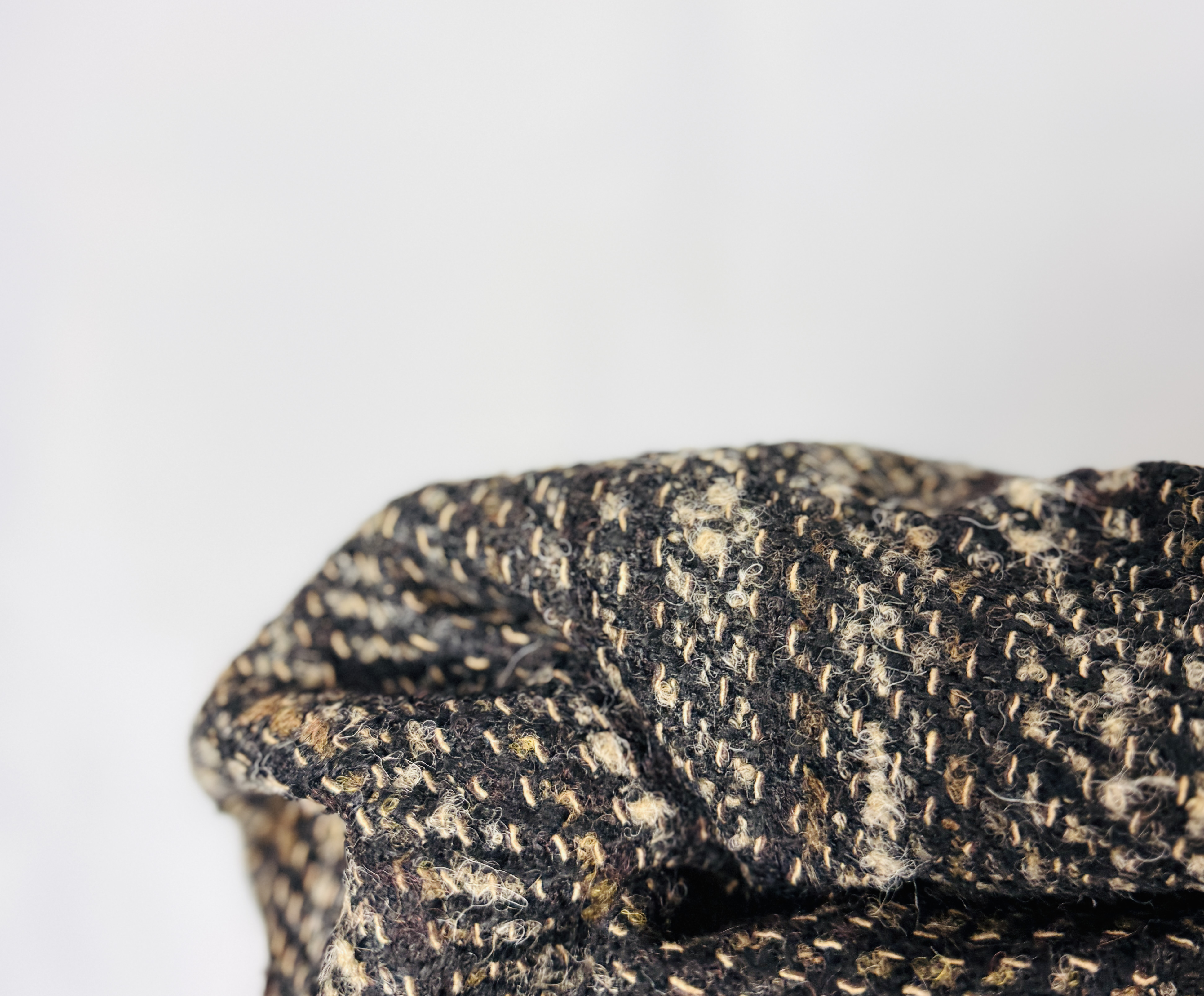 Materiał prezentuje się jako nieco grubszy i strukturalny, o chropowatej, melanżowej fakturze, która miękko trzyma formę. Powierzchnia tkaniny ma widoczne, nierównomierne przeplatania włókien, co nadaje spódnicy przyjemnie naturalny, niemal rękodzielniczy charakter. Materiał delikatnie pracuje przy ruchu, tworząc subtelne układania bez efektu opięcia, a wykończenie brzegu jest staranne i dyskretne, co potęguje wrażenie jakości.