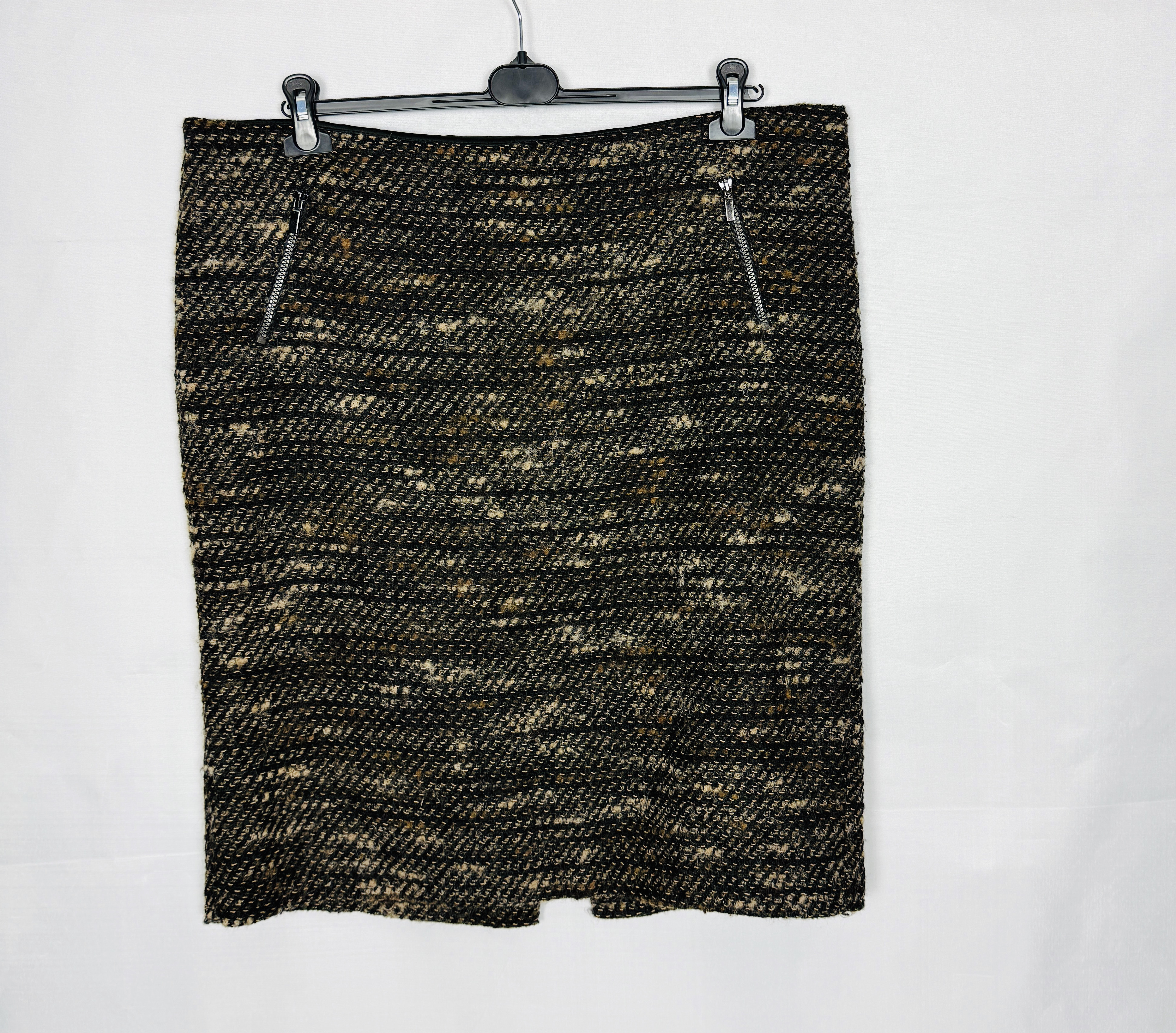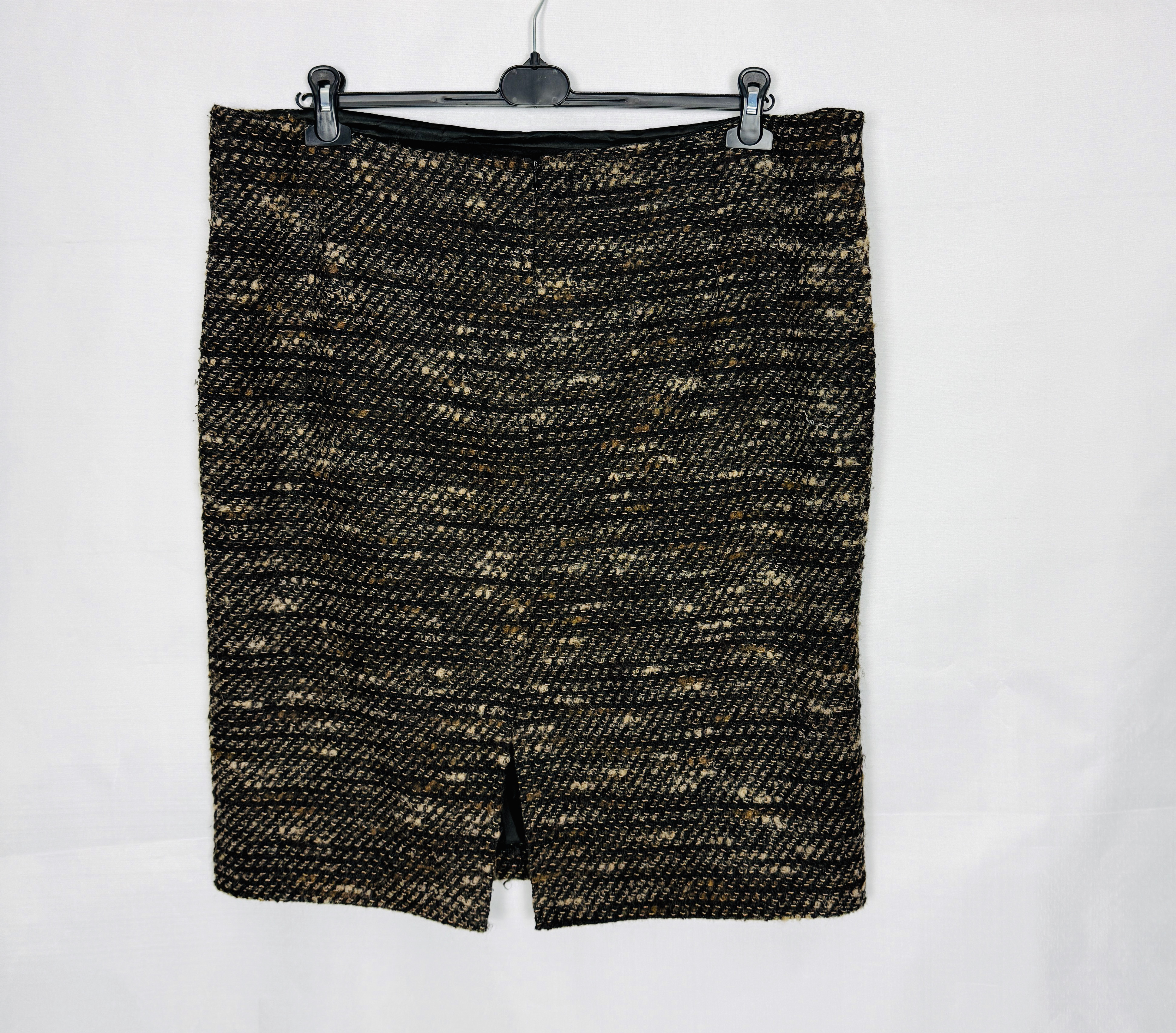Ta spódnica to elegancka, spokojna opowieść o teksturze i klasyce — subtelny melanż w ciemnych tonacjach przeplata się tu z jasnymi nieregularnymi akcentami, tworząc głęboką, wielowymiarową powierzchnię. Fason emanuje wyważoną kobiecością: prostota linii spotyka się z bogactwem faktury, co daje efekt zarówno dostojny, jak i nowocześnie stylowy. To propozycja dla Pań ceniących ponadczasowy szyk, które chcą dodać garderobie wyrafinowanego elementu o delikatnie strukturalnym charakterze.