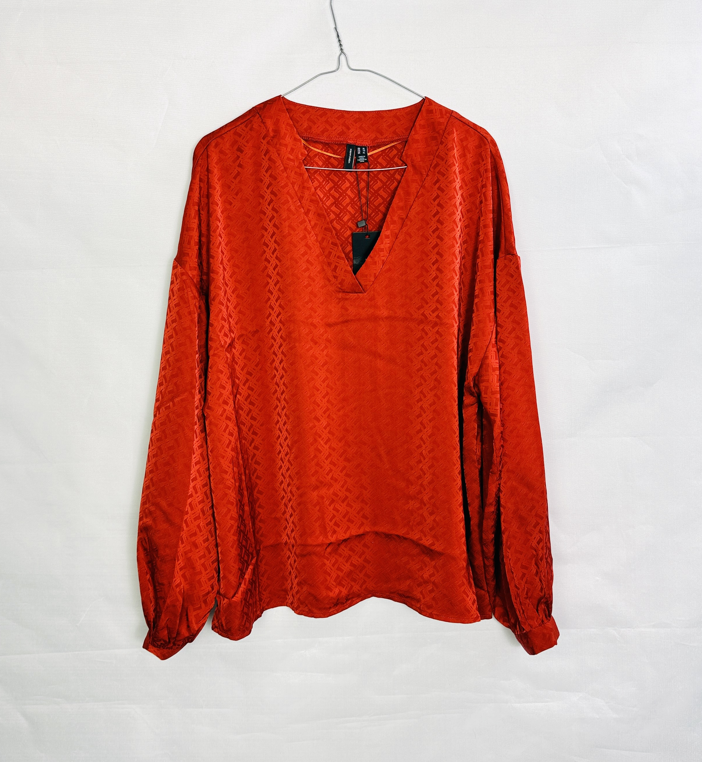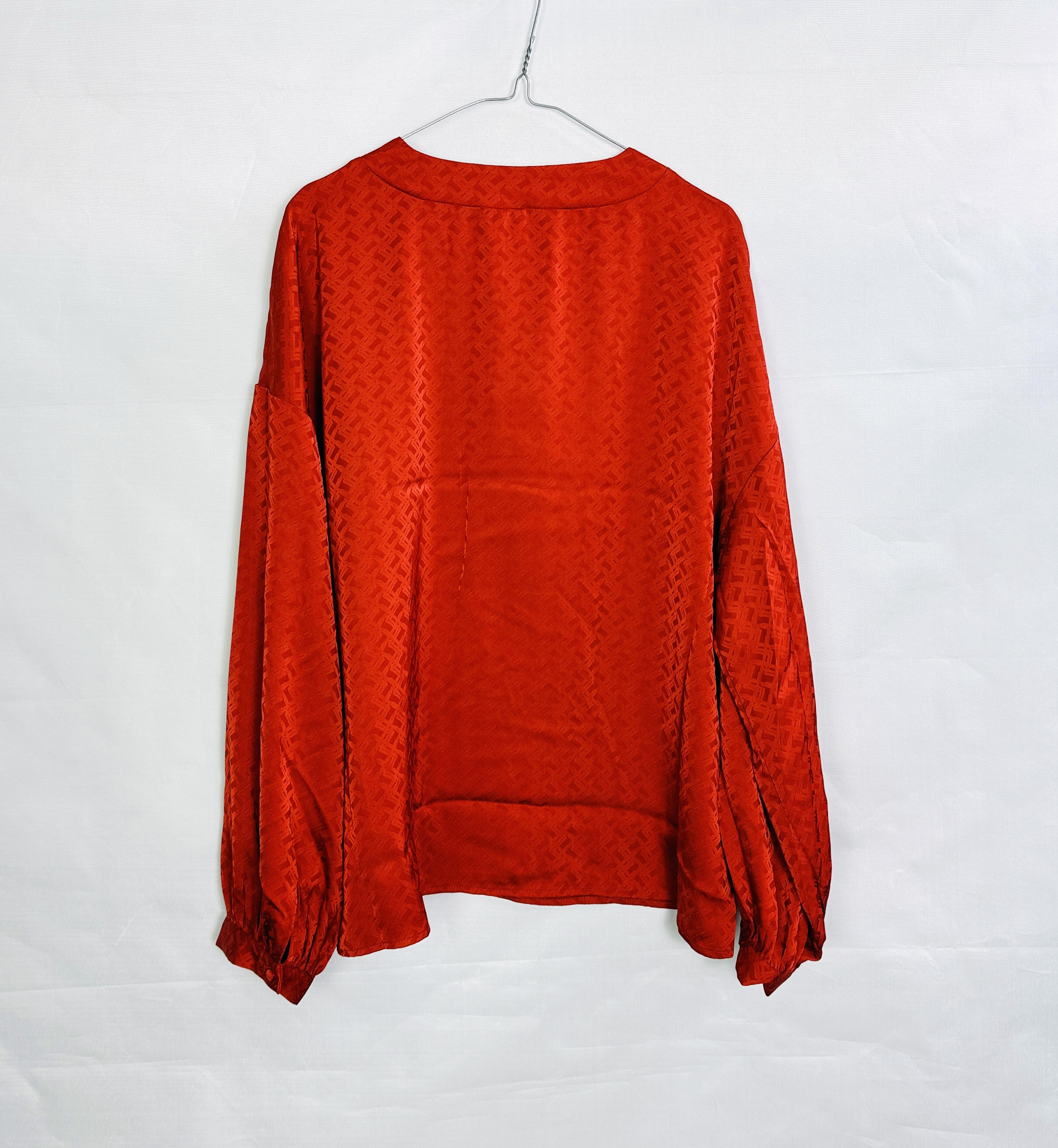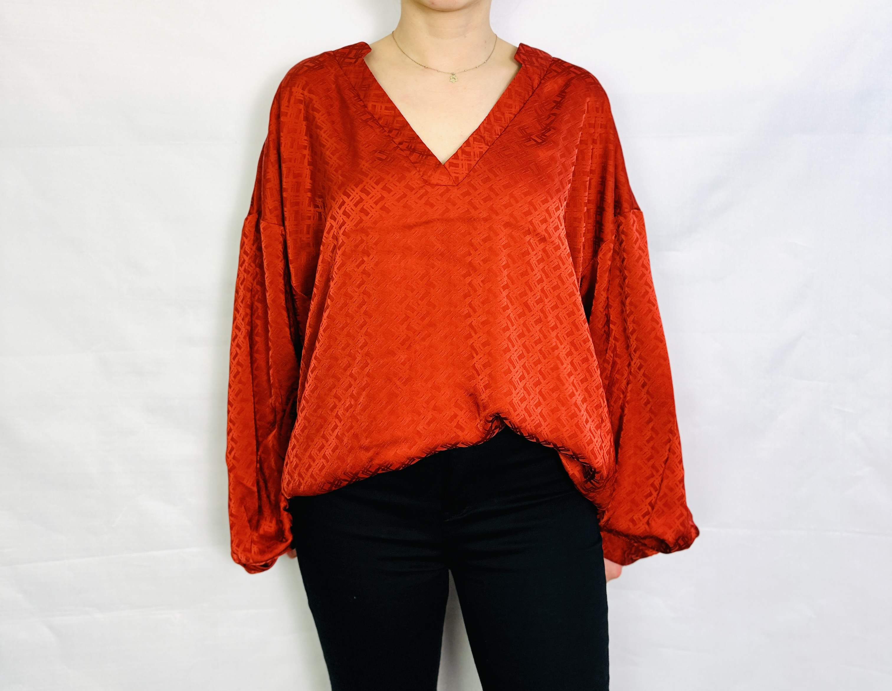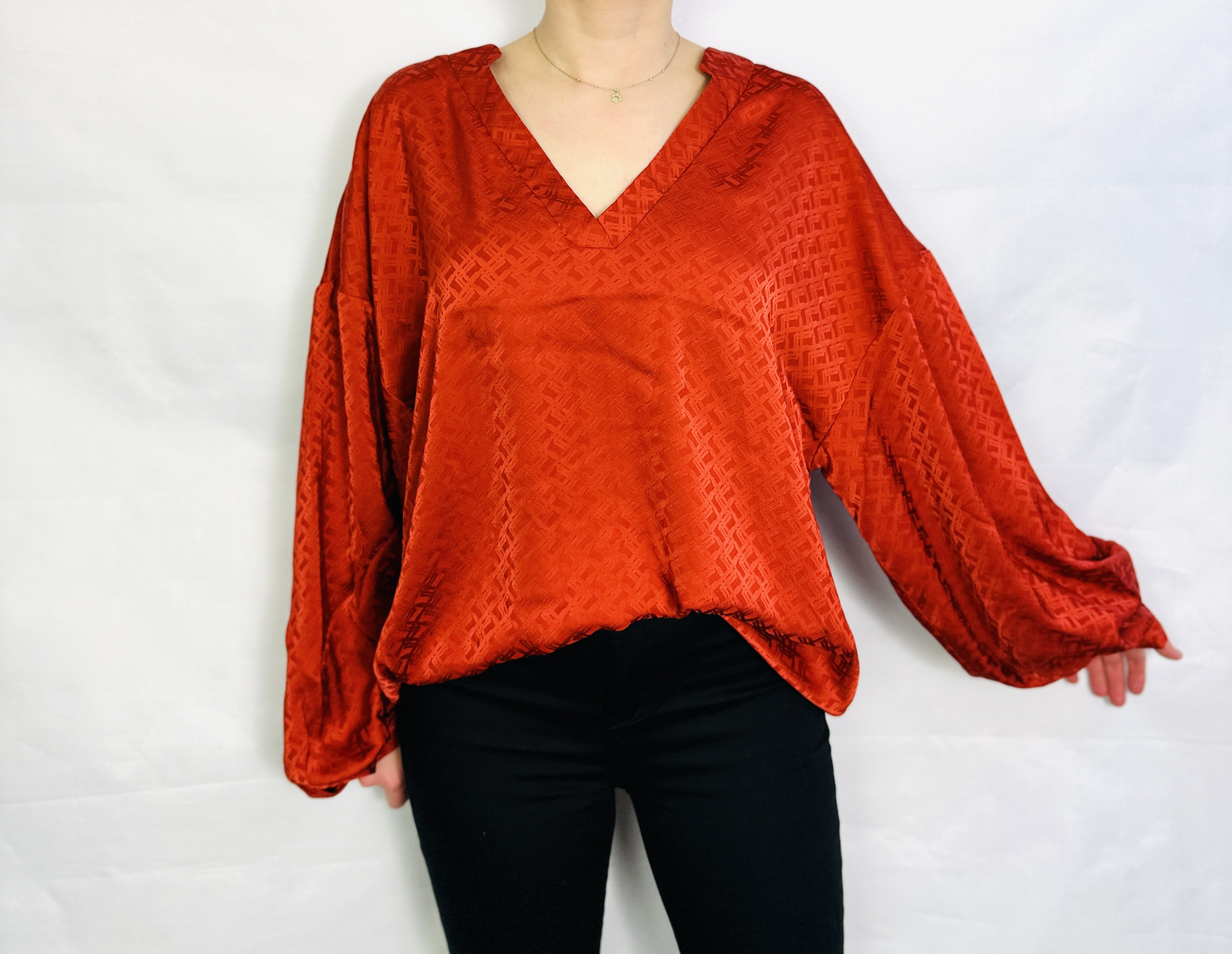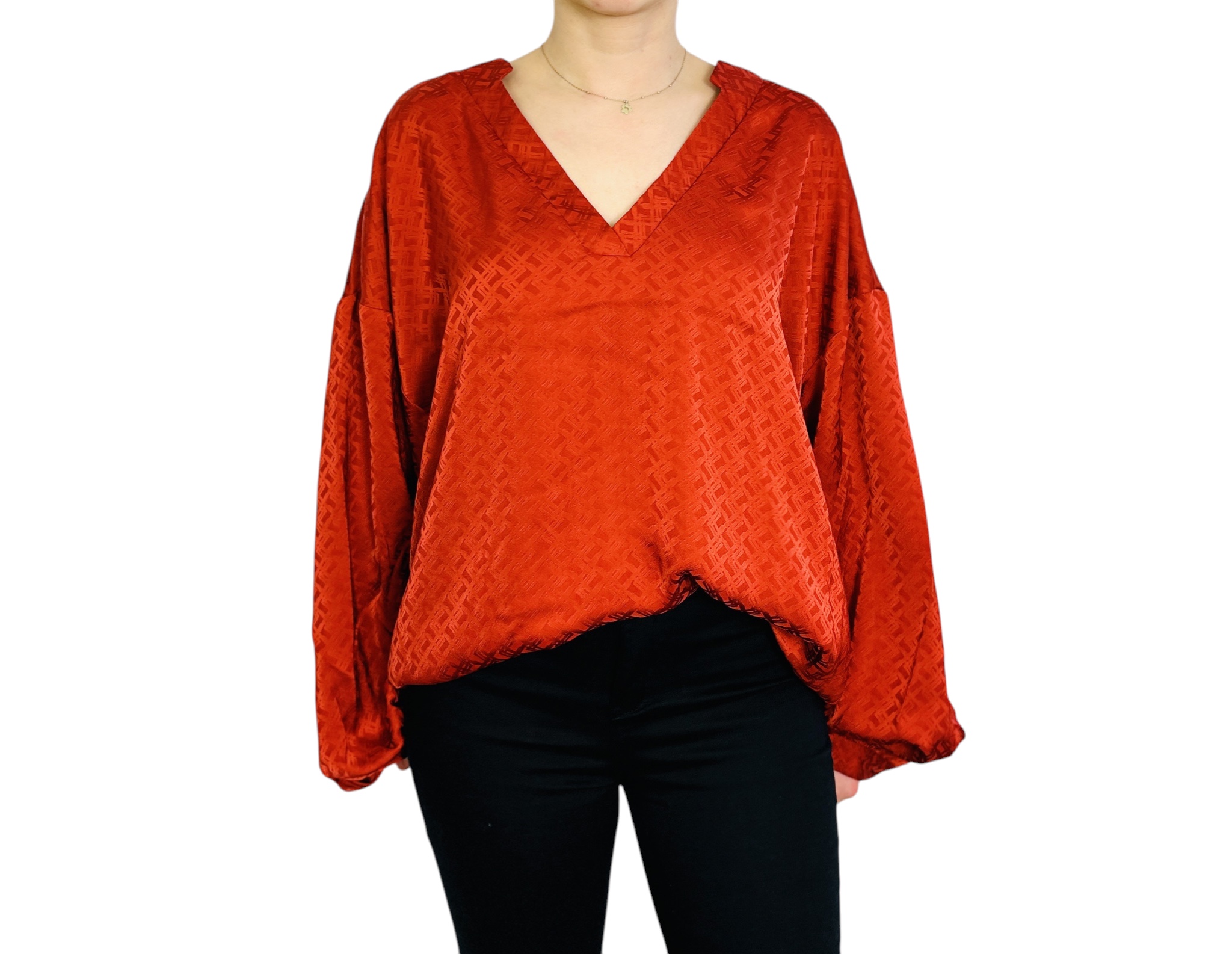 To kobiecy, a zarazem swobodny model, który łączy nasyconą, ciepłą barwę z subtelną, teksturalną elegancją. Miedziany ton nadaje bluzce wyrazistego, ale miękkiego charakteru — jest jednocześnie przyjazna i zdecydowana, dzięki czemu sprawdzi się w stylizacjach, gdzie chcemy wyglądać kobieco, a zarazem czuć komfort. Całość ma lekko romantyczny, a przy tym nowoczesny nastrój: kolor i delikatny wzór tworzą razem wrażenie dopracowanego, ale nie formalnego szyku.